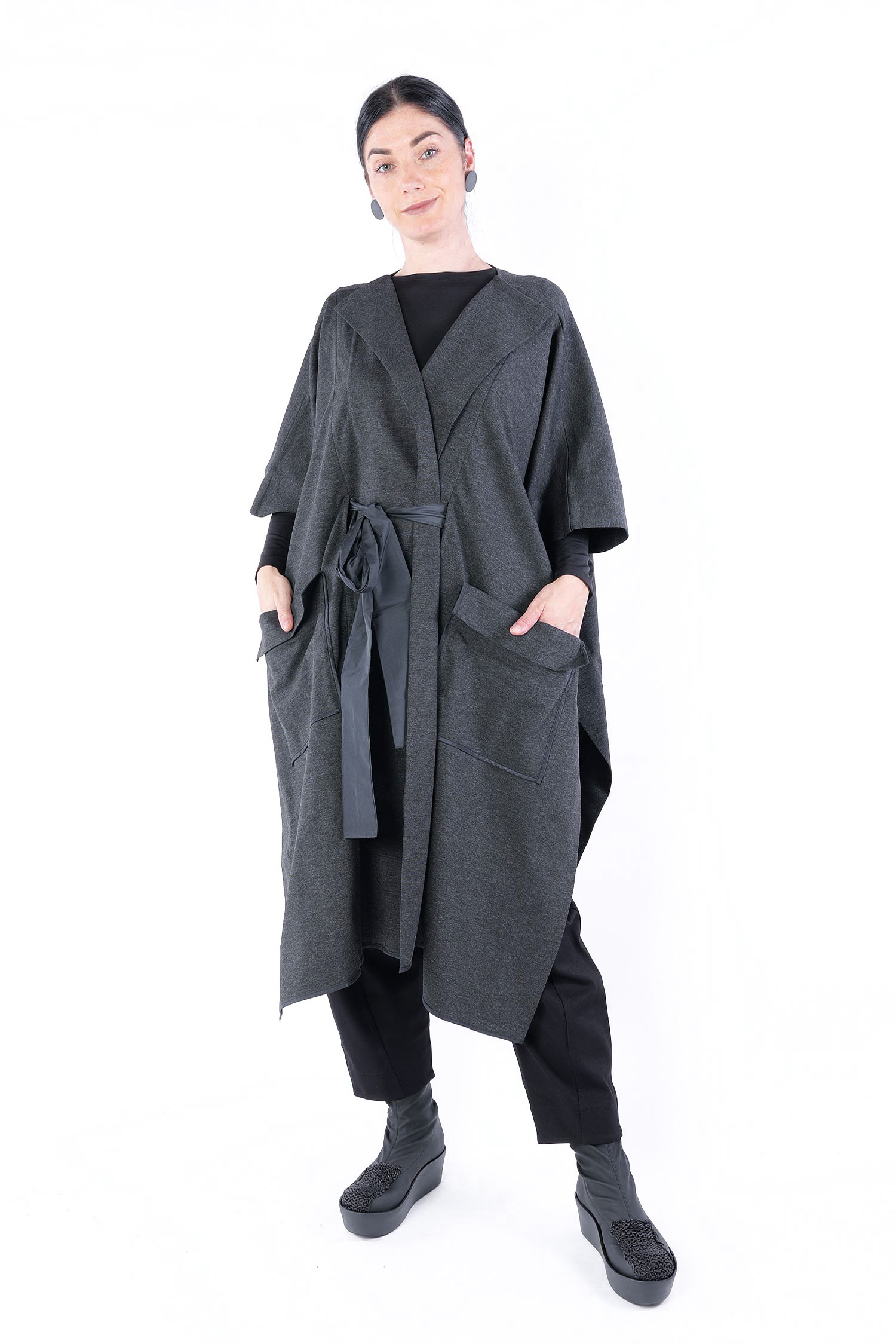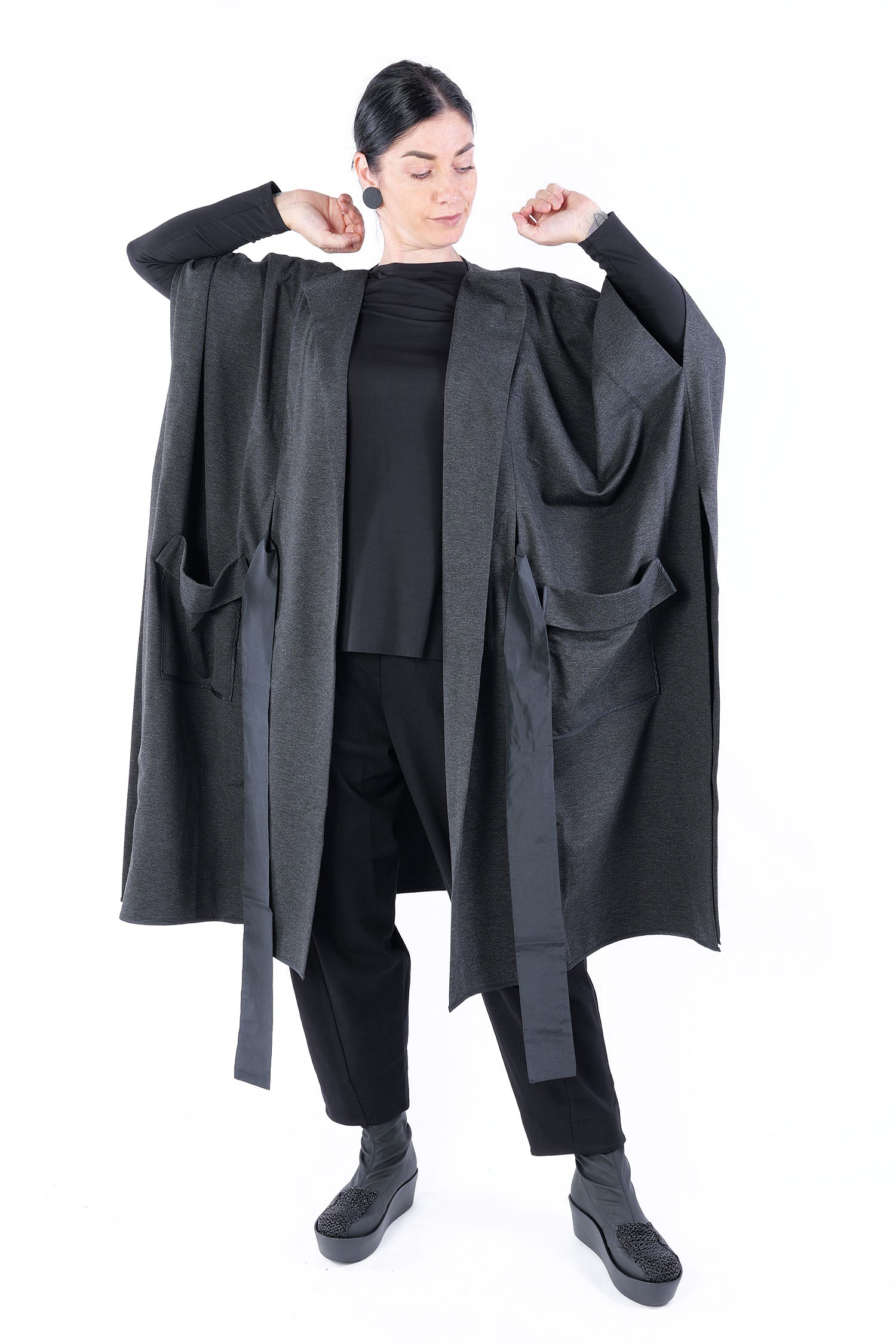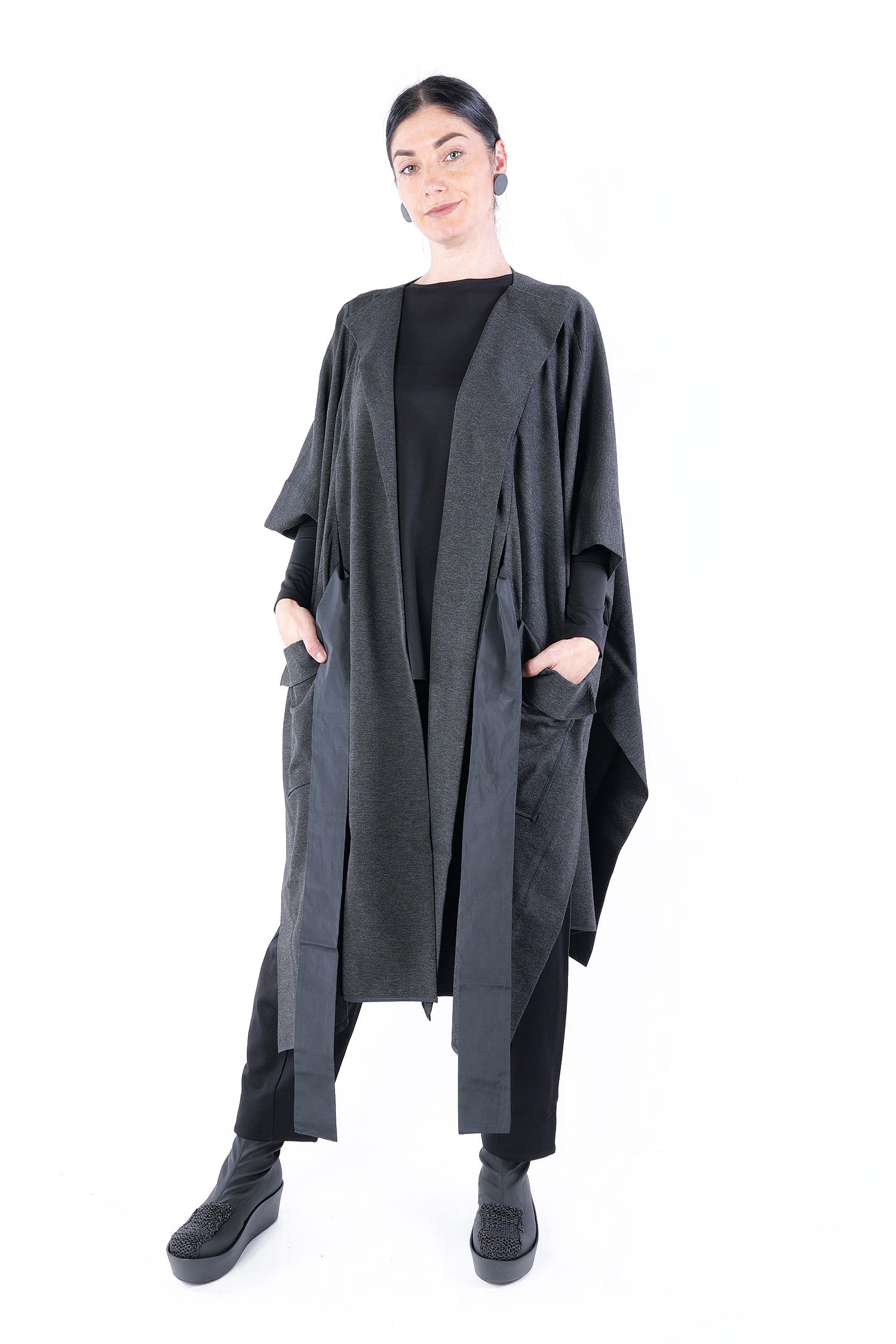 Details: - Extended shoulder, ¾ length sleeves - Tie belt made of taffeta at inner back side, which creates enough width - Very loose and square - Attached pockets piped with taffeta - Trimmed edges - Cape-like cut - Extended shoulder