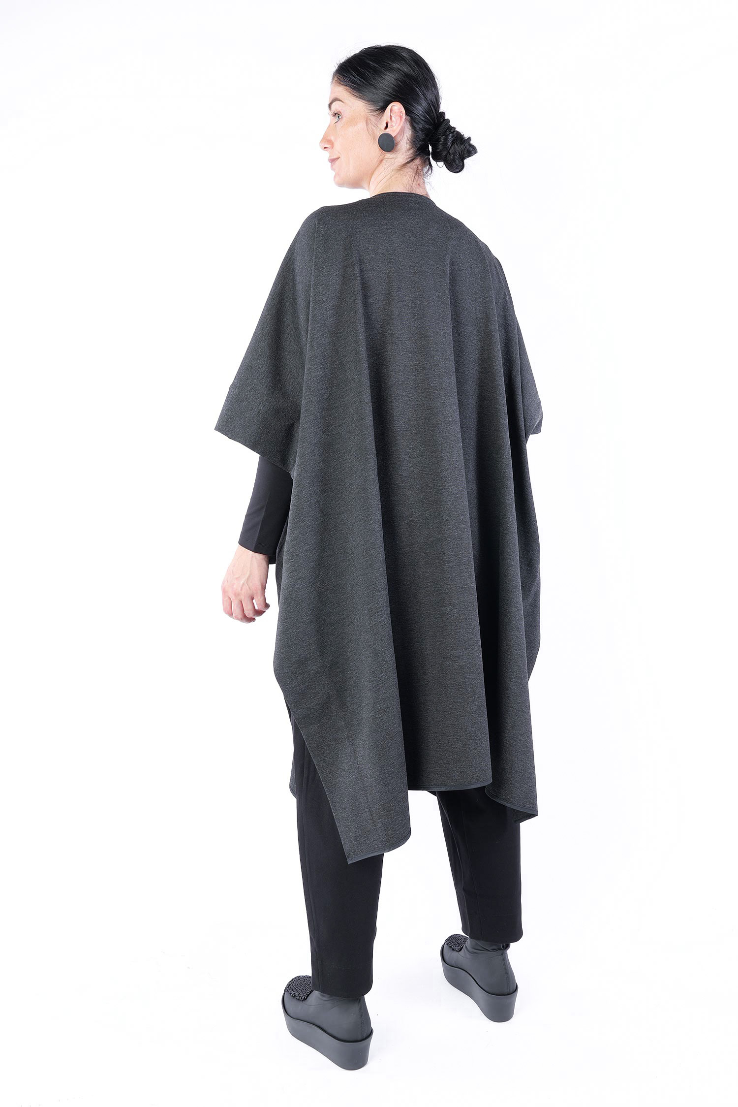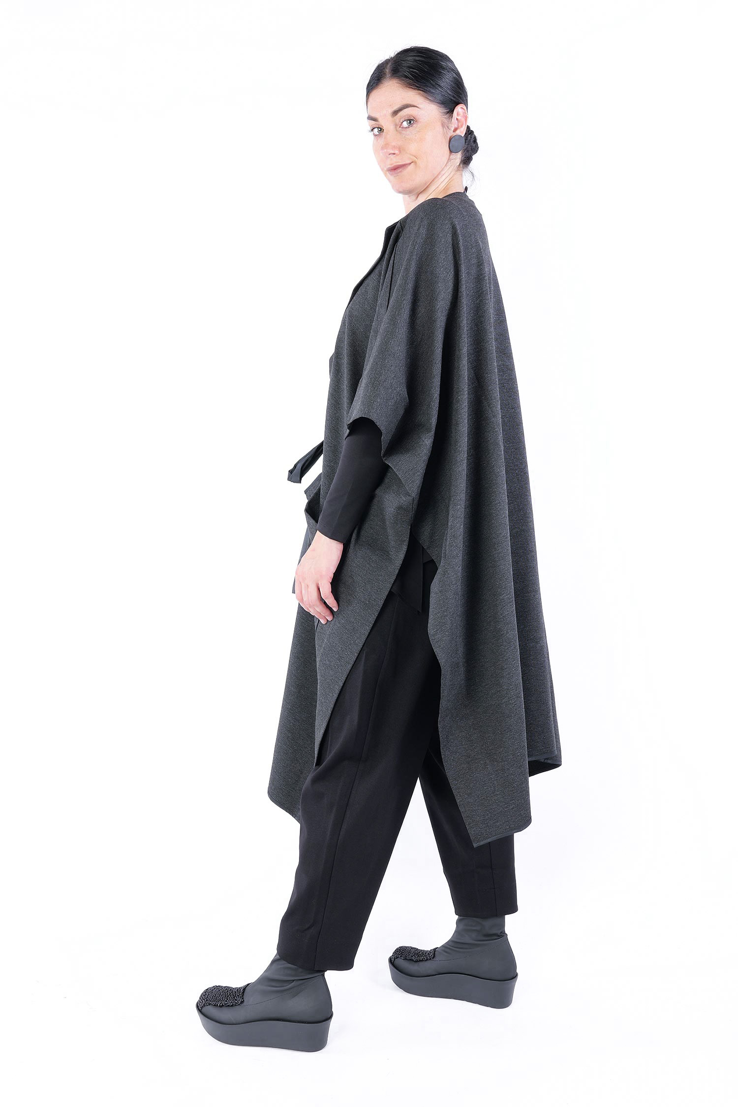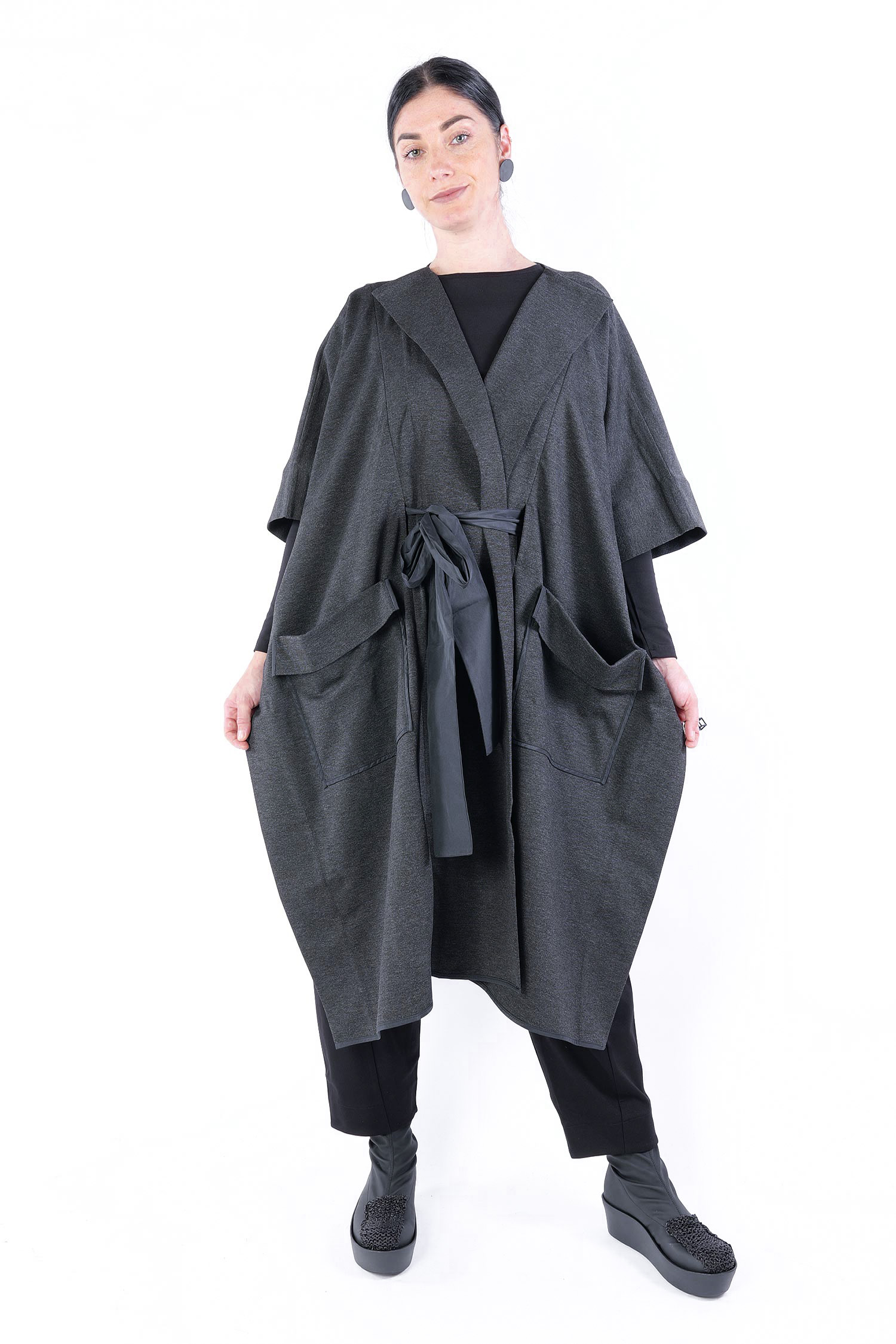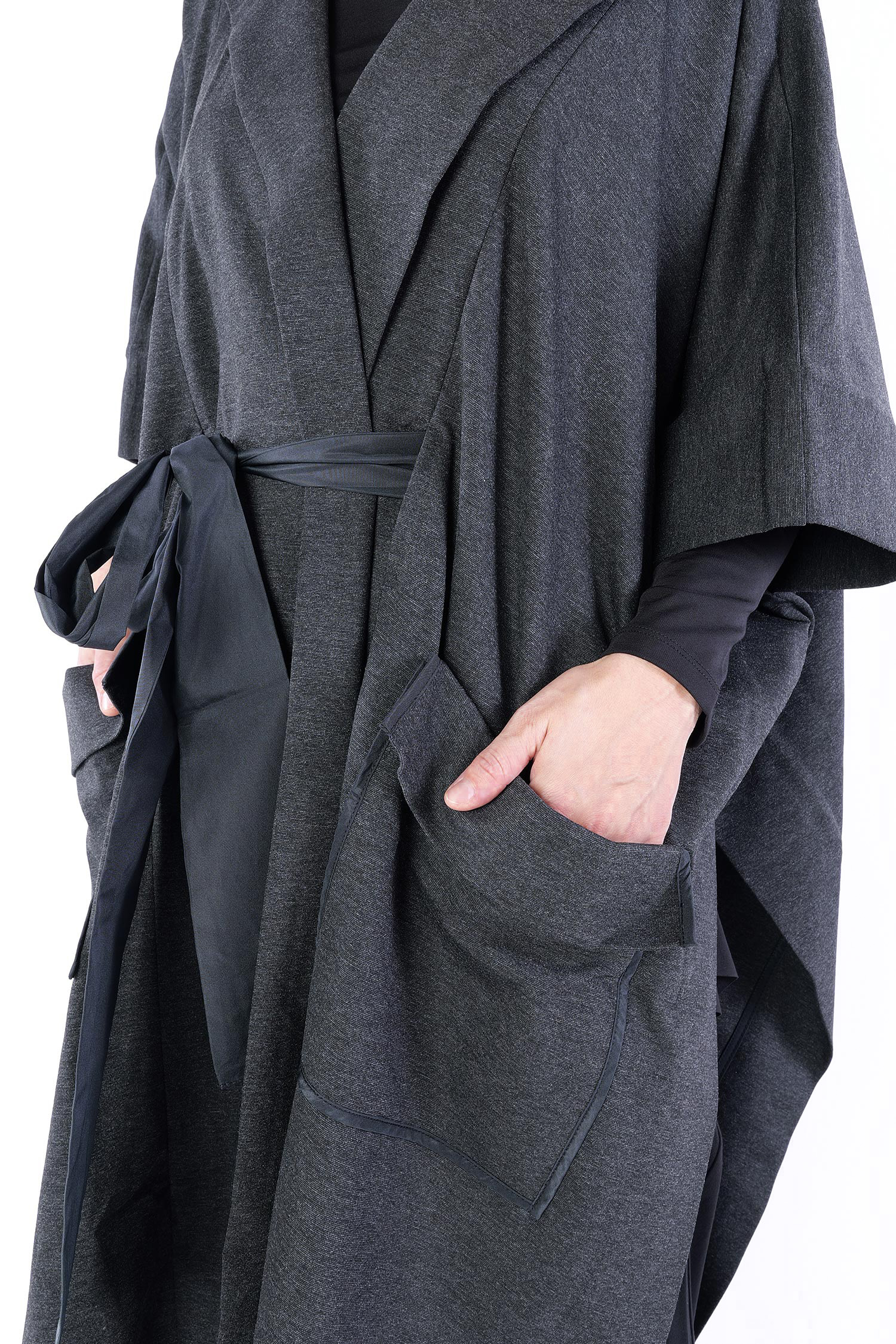 Details: - Extended shoulder, ¾ length sleeves - Tie belt made of taffeta at inner back side, which creates enough width - Very loose and square - Attached pockets piped with taffeta - Trimmed edges - Cape-like cut - Extended shoulder