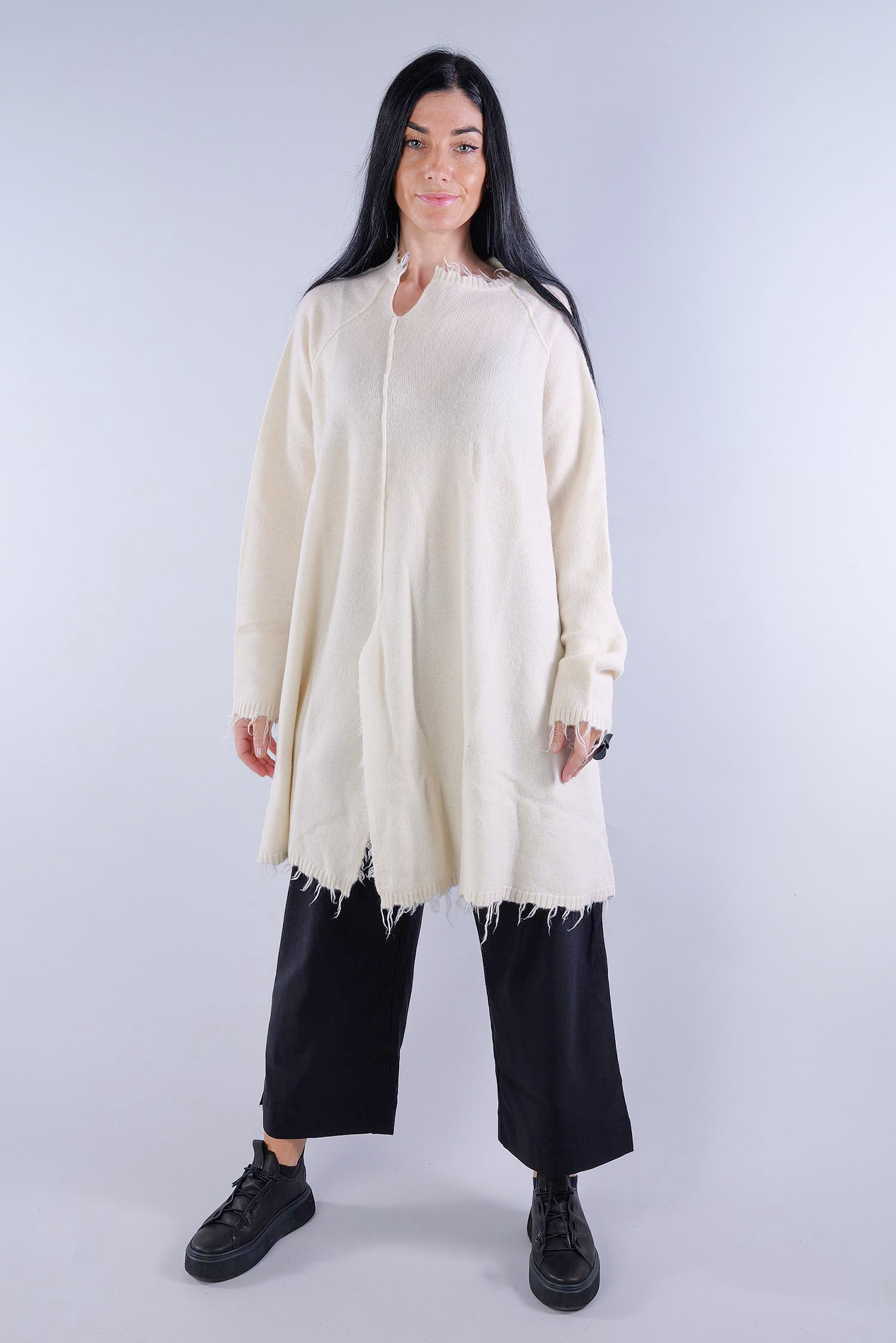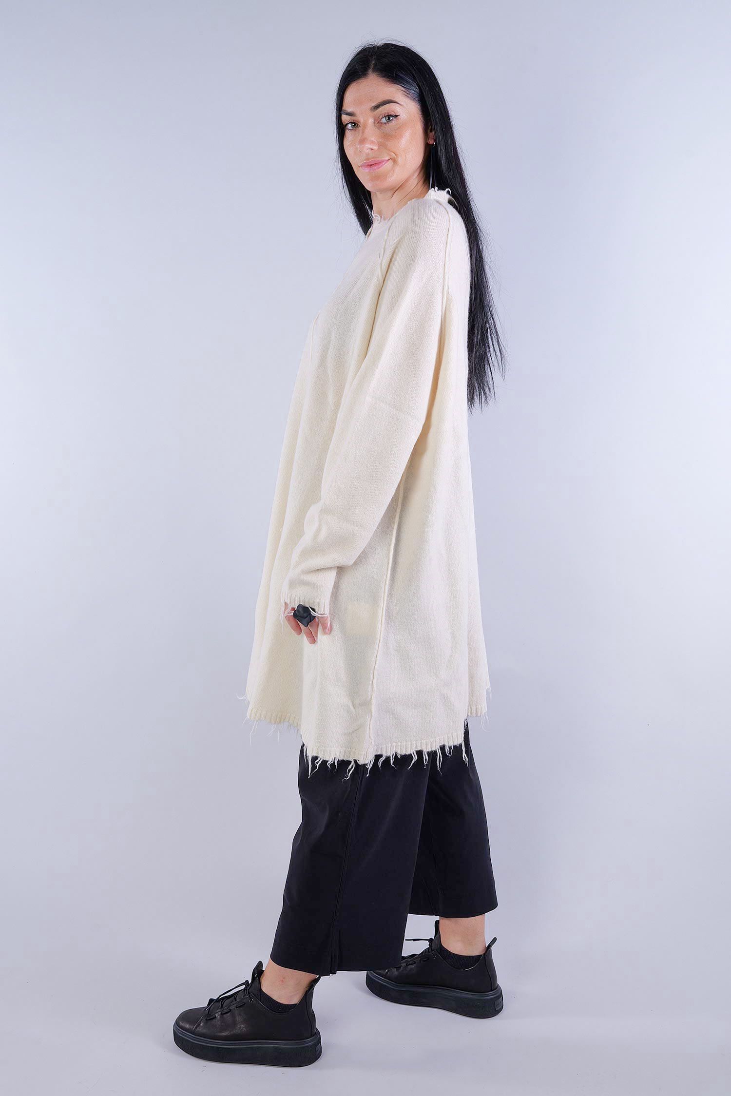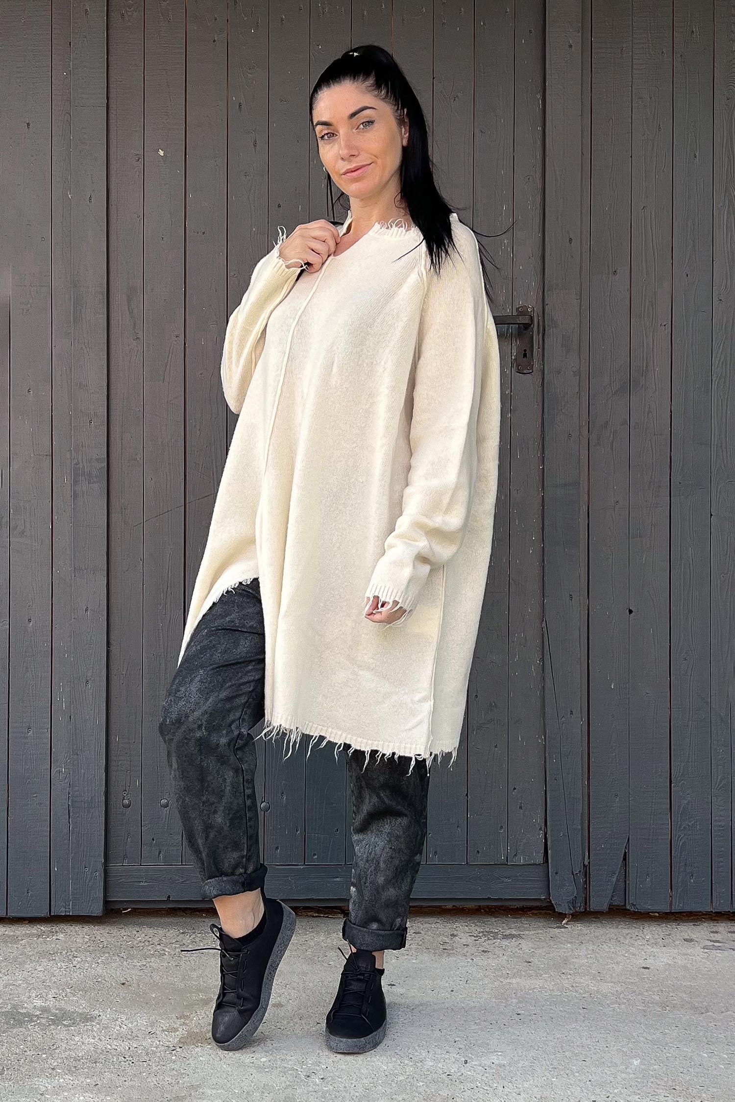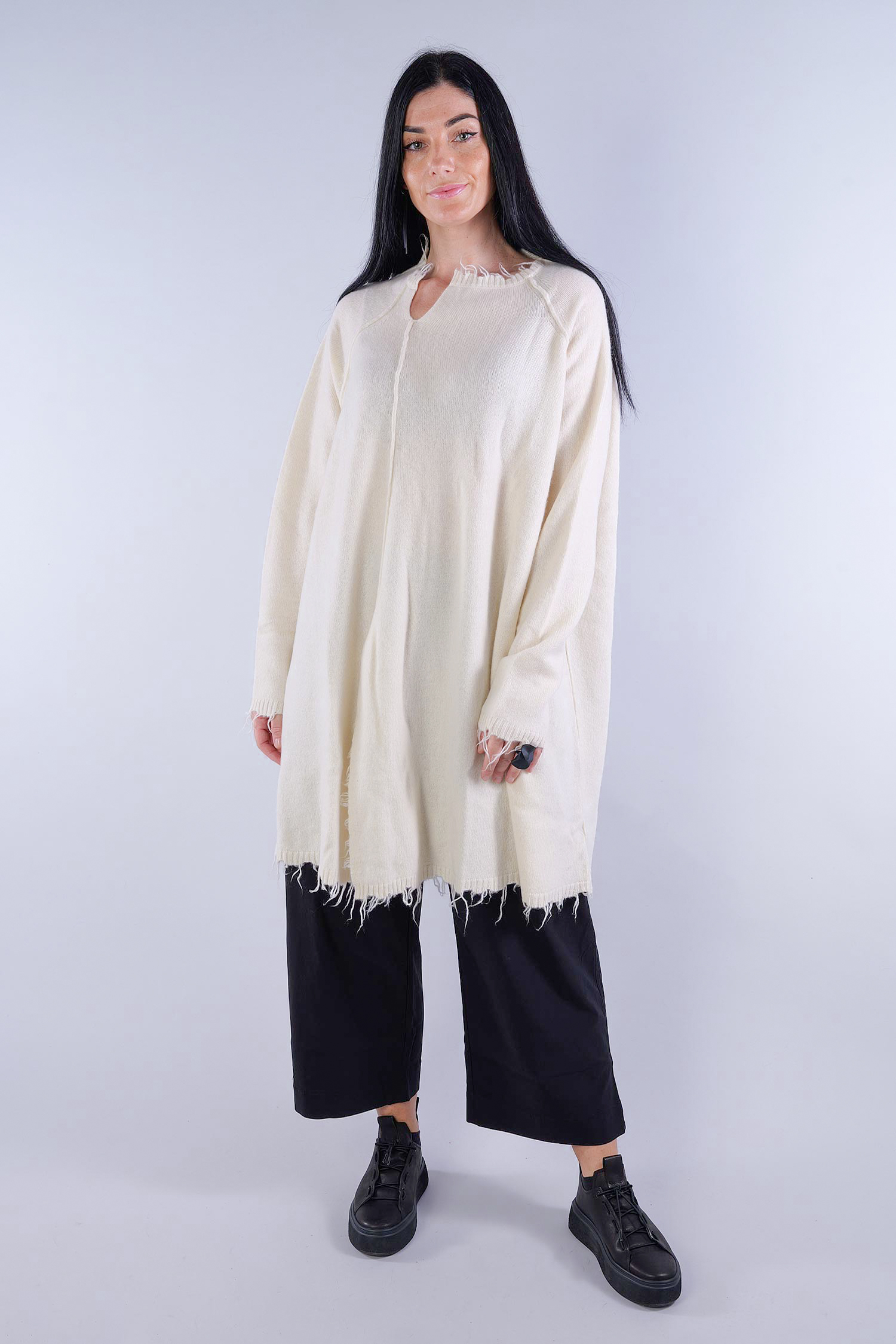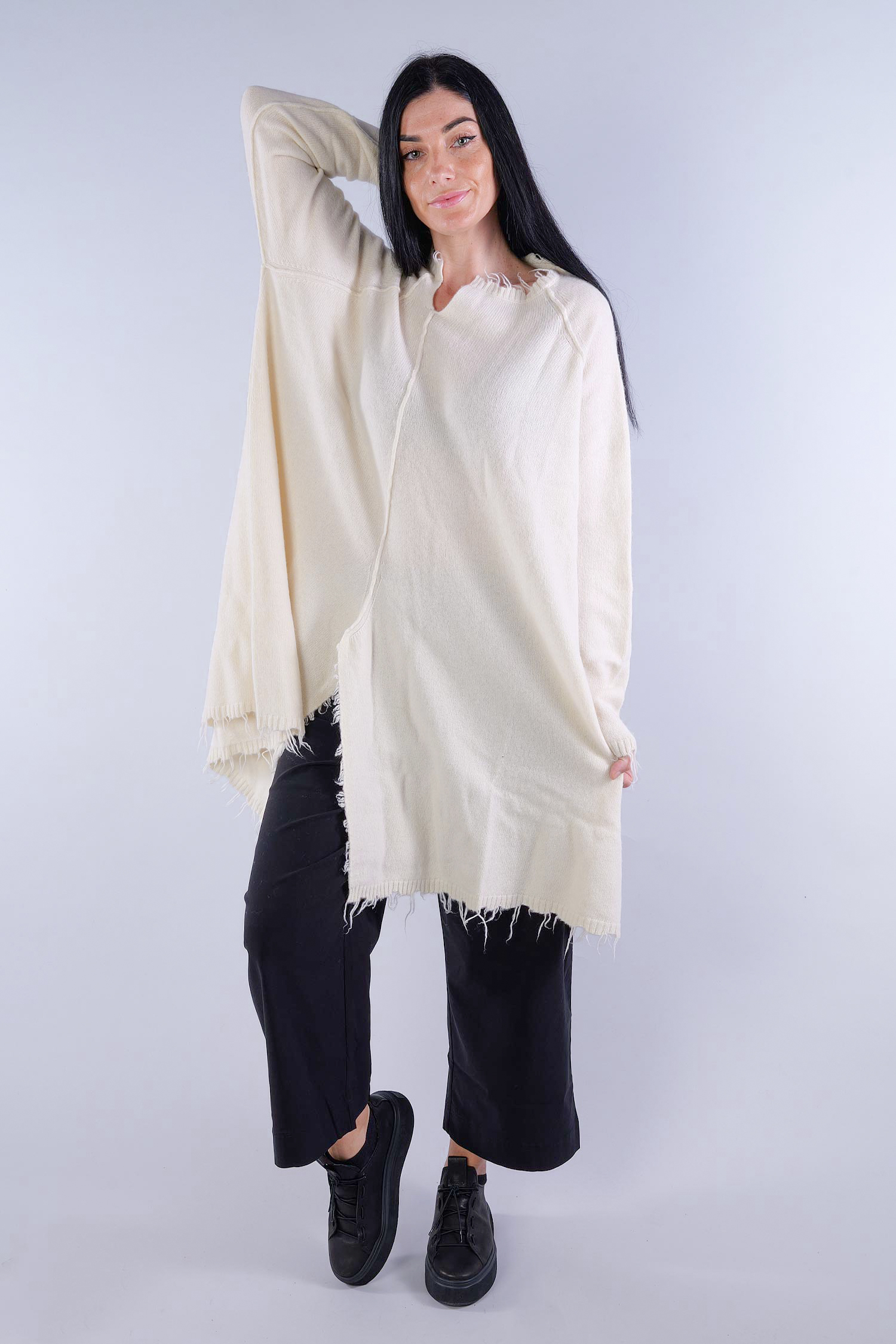 Details: - Asymmetrically long hem - Round neck with cuts - Cozy and light knit made of virgin wool and yak - Frayed endings - Raglan sleeves - Decorative seams towards the outside - Rib knit on endings - Slight A-line - Hem with cut at the front