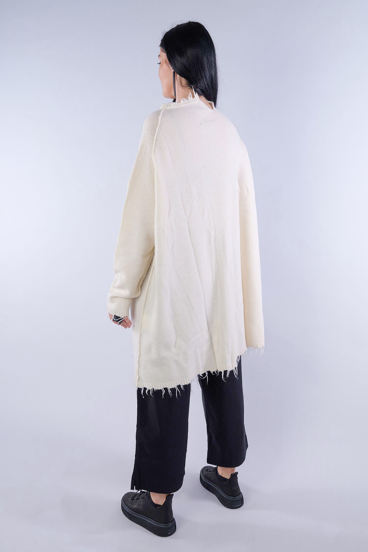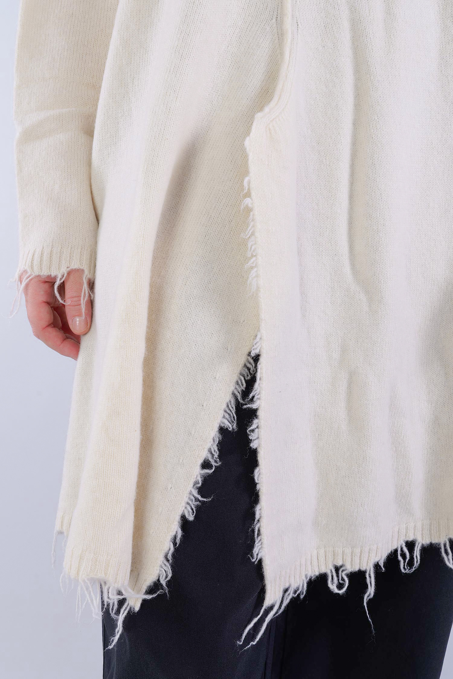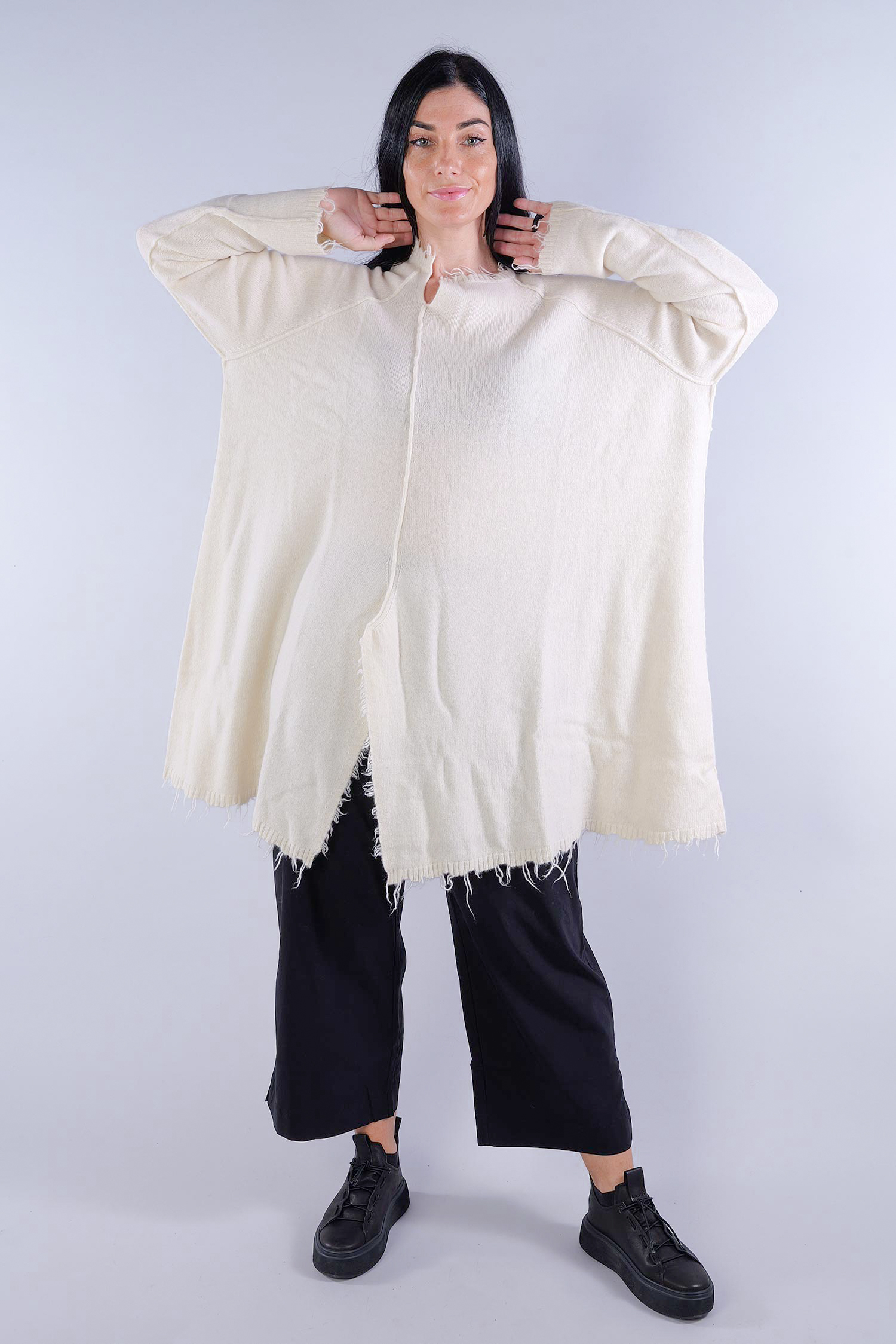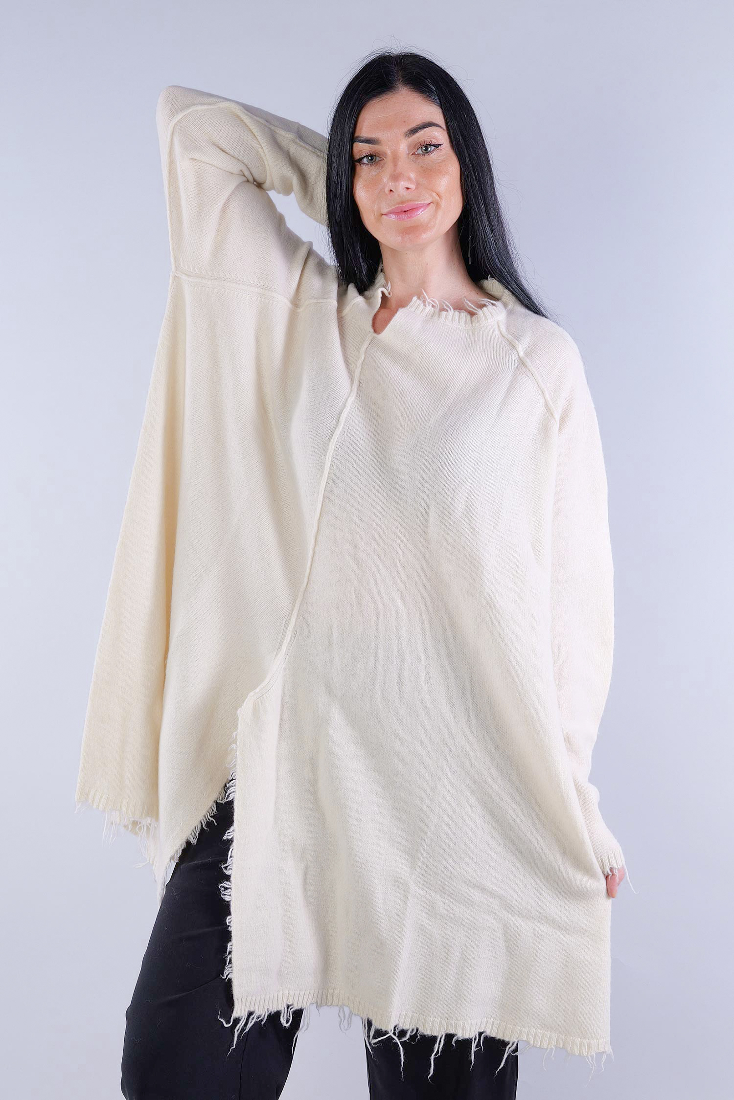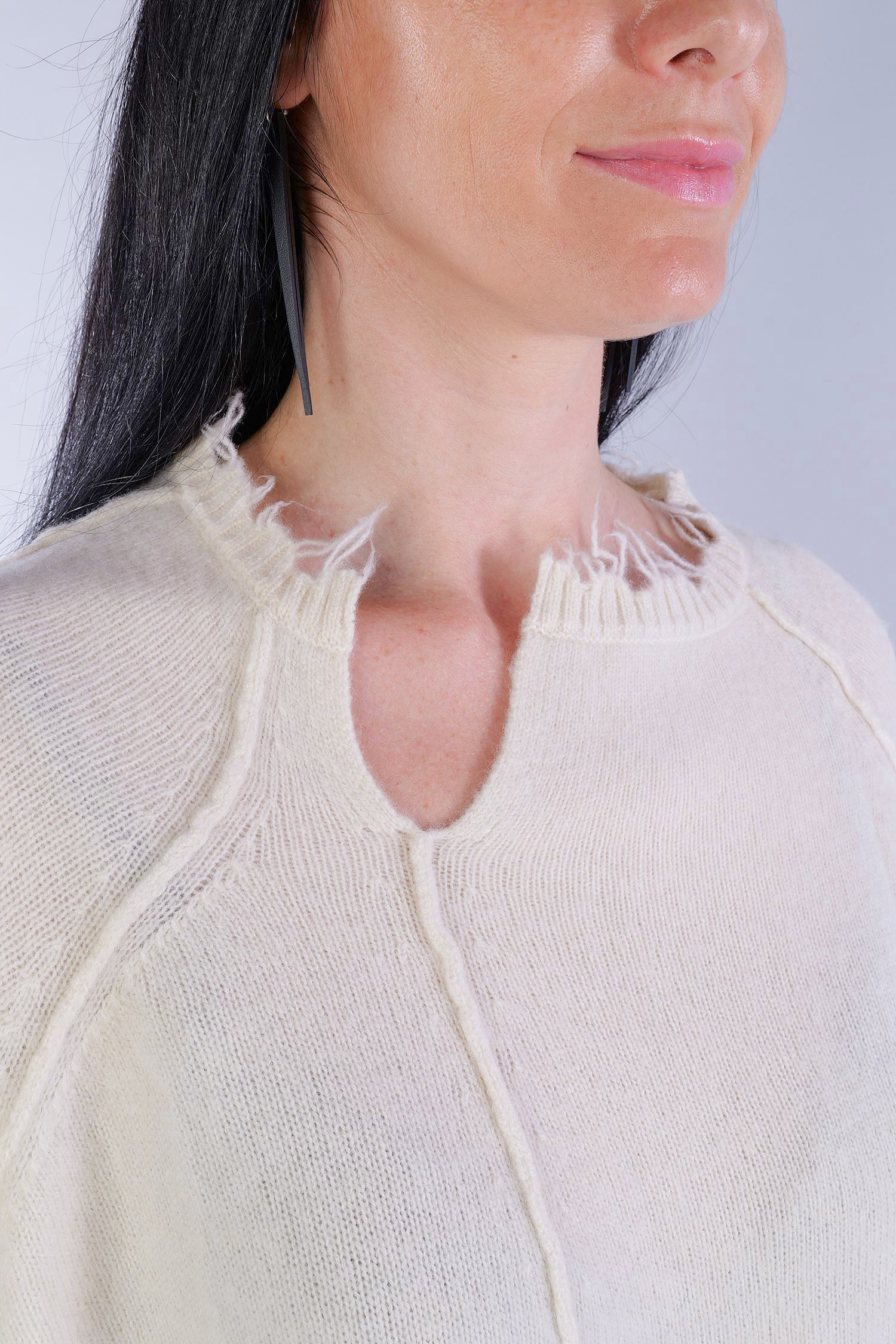 Details: - Asymmetrically long hem - Round neck with cuts - Cozy and light knit made of virgin wool and yak - Frayed endings - Raglan sleeves - Decorative seams towards the outside - Rib knit on endings - Slight A-line - Hem with cut at the front