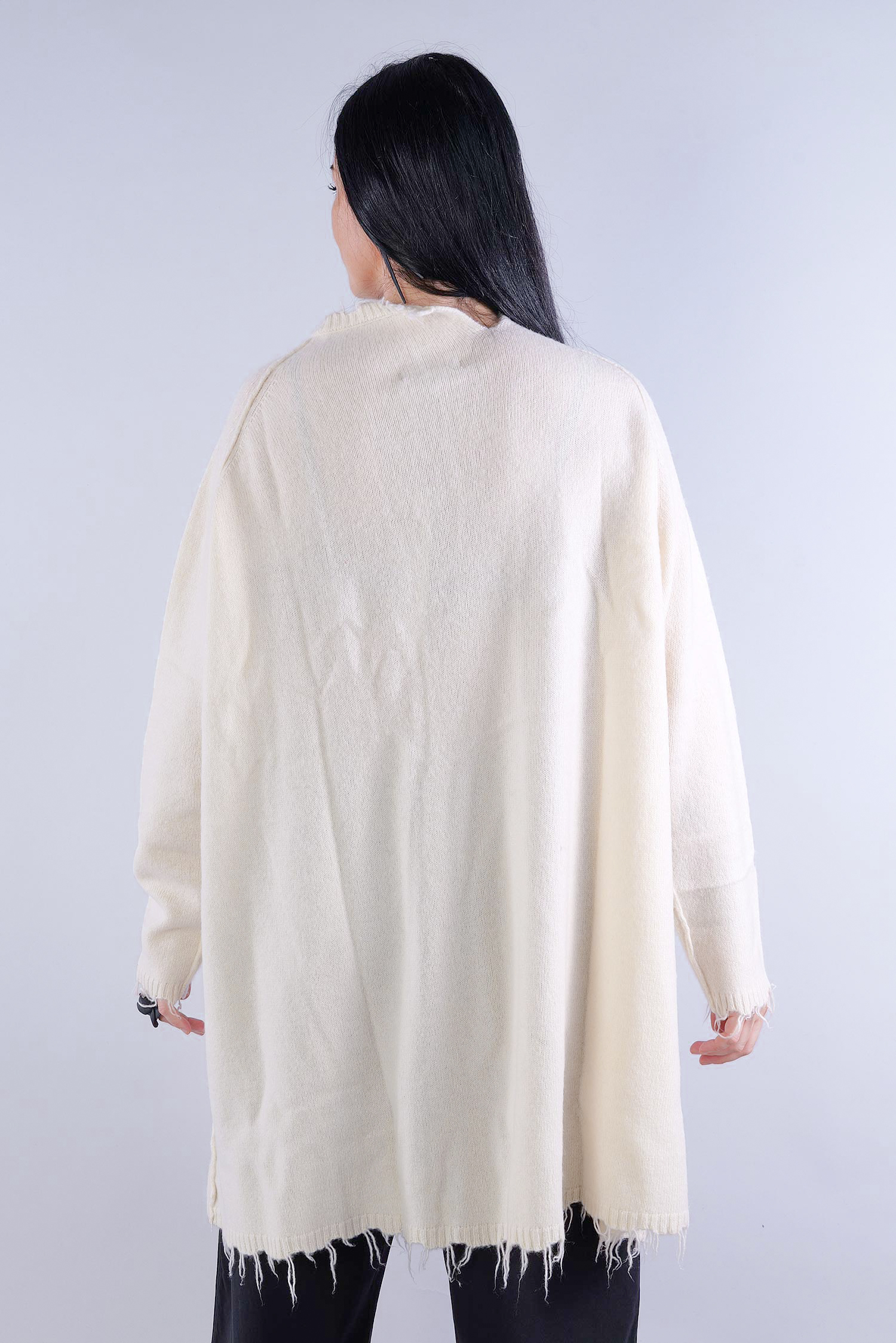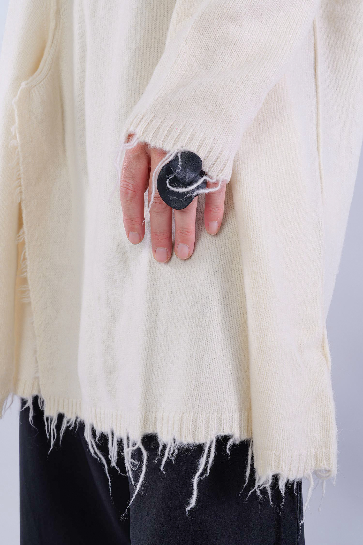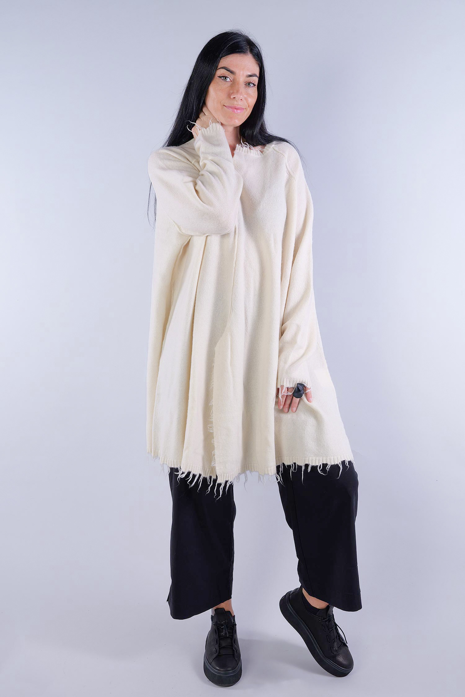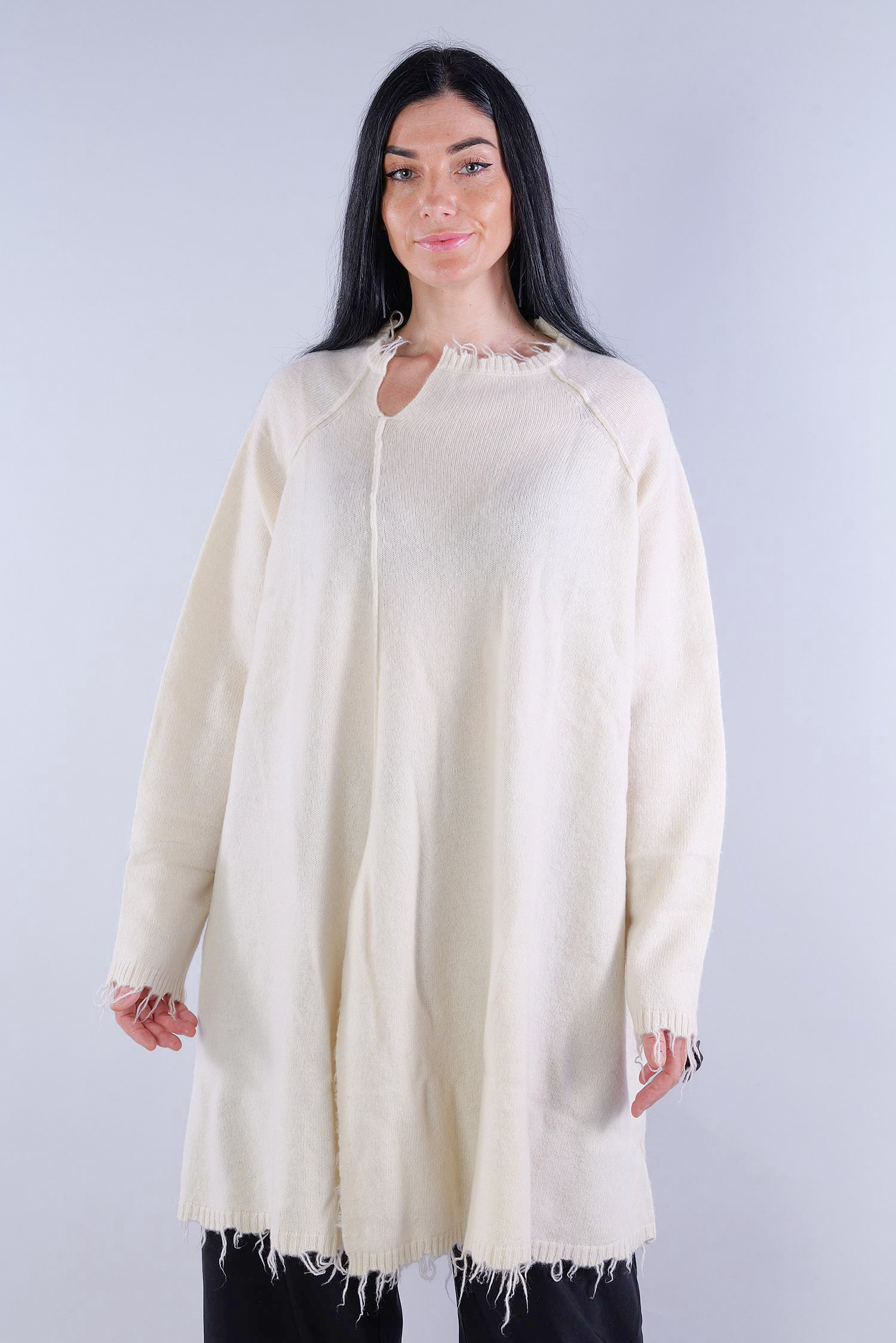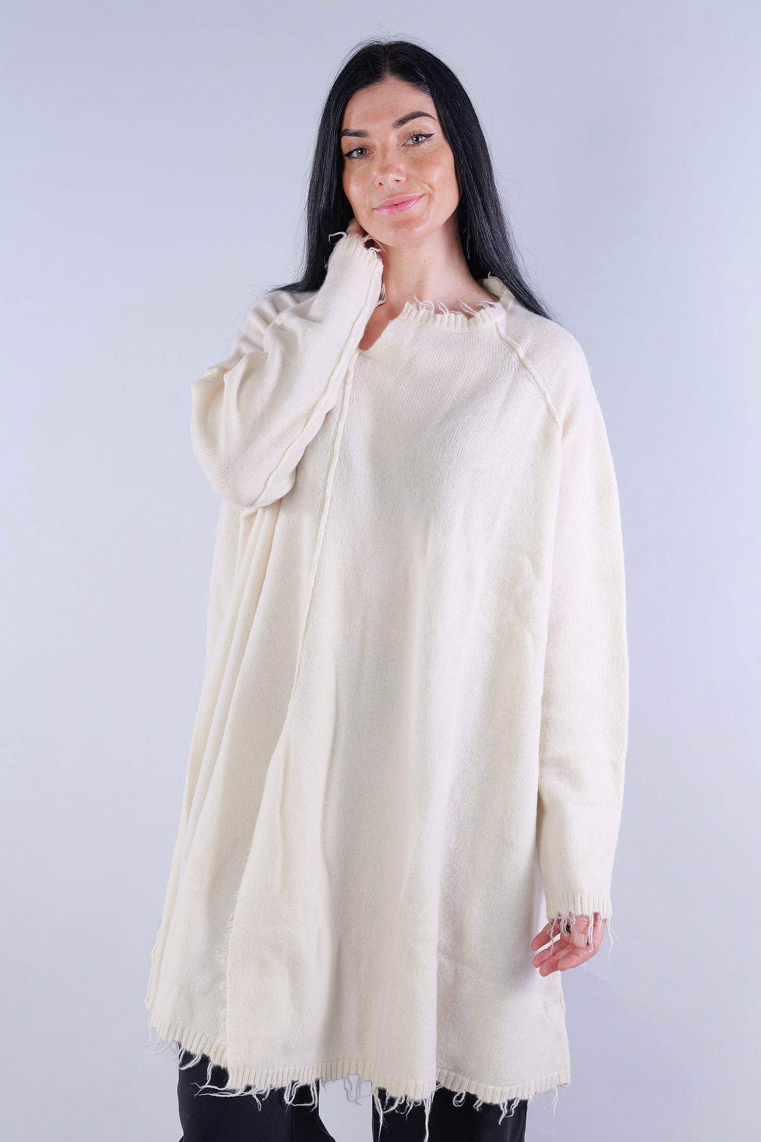 Details: - Asymmetrically long hem - Round neck with cuts - Cozy and light knit made of virgin wool and yak - Frayed endings - Raglan sleeves - Decorative seams towards the outside - Rib knit on endings - Slight A-line - Hem with cut at the front