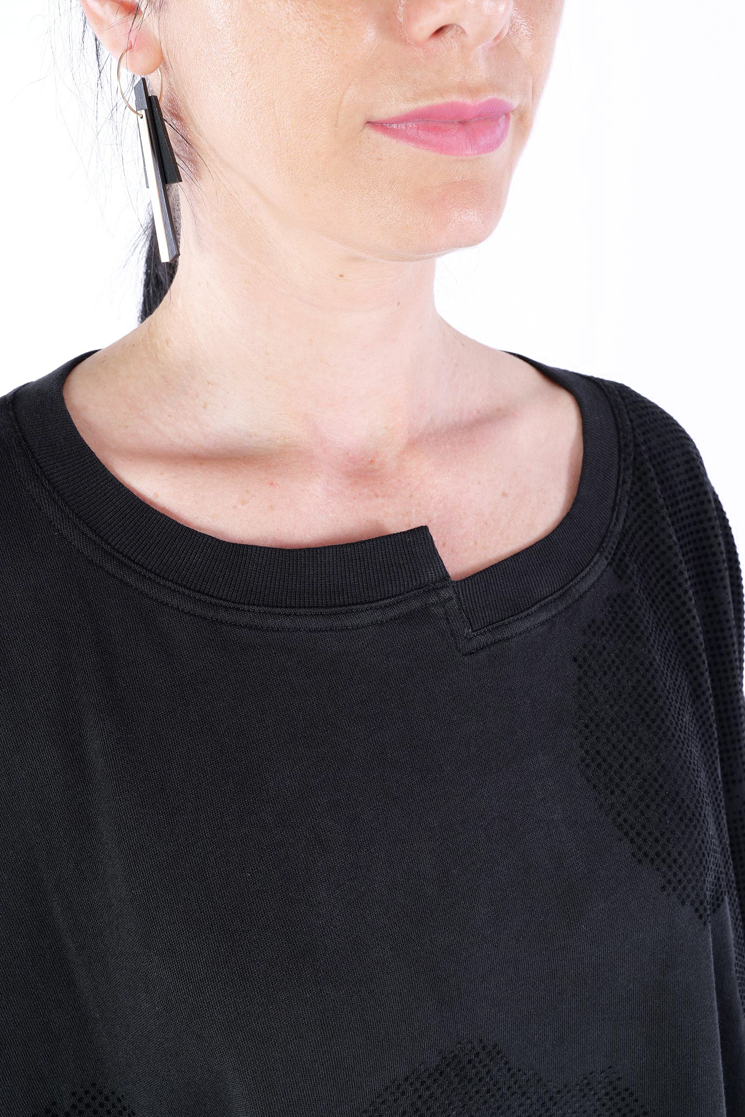 Details: - Asymmetrical round neck with rib jersey - Extended shoulder - Long sleeves - Open edges rolled up at the bottom of hem and on sleeves - Side pockets - Elastic sweat material - Tulip-shaped oversize cut