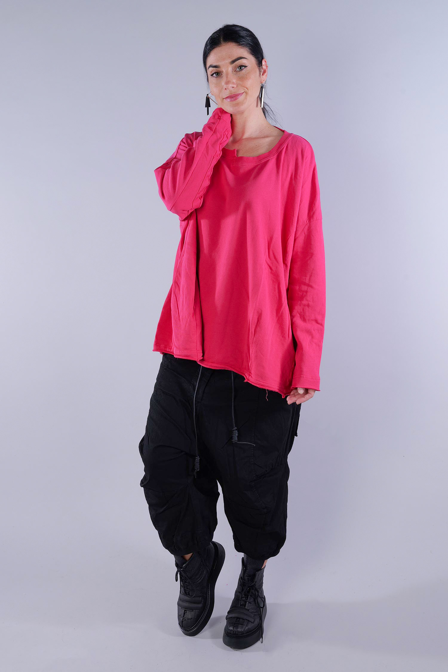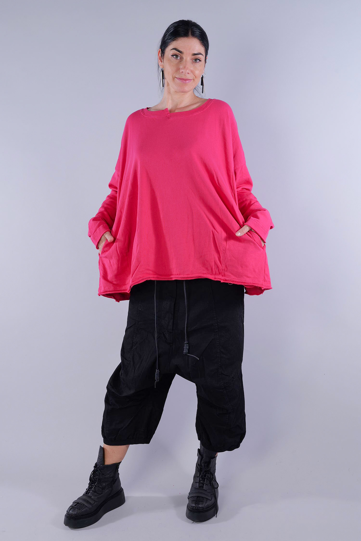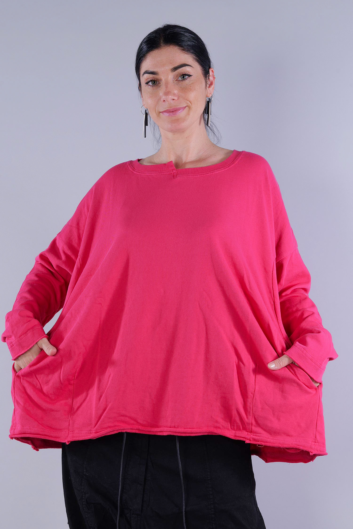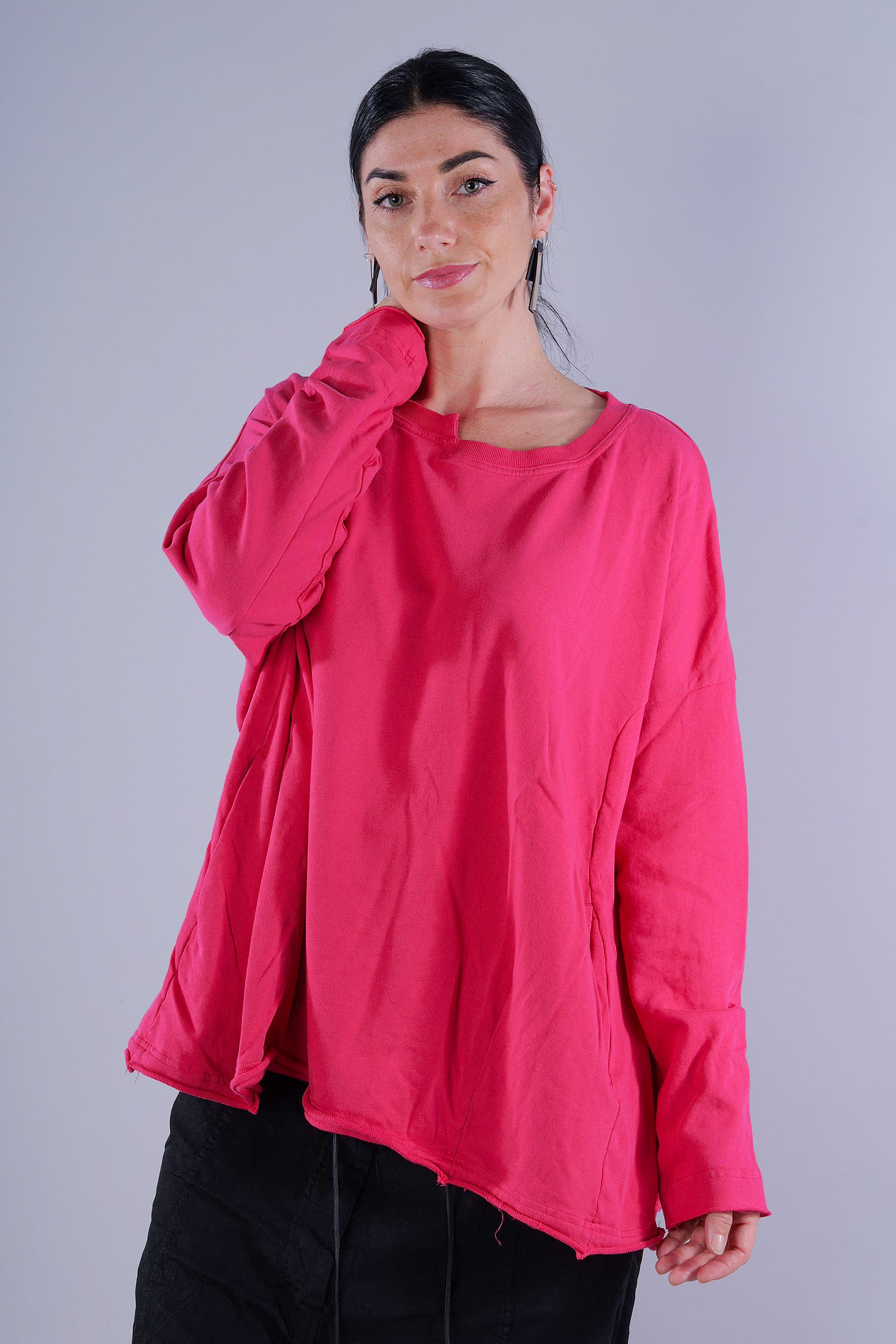 Details: - Extended shoulder - Long sleeve - Tulip-shaped oversize cut - Asymmetrical round neck - Side pockets - Rib jersey details on neckline - Open edges rolled up on hem and sleeves - Sweat material