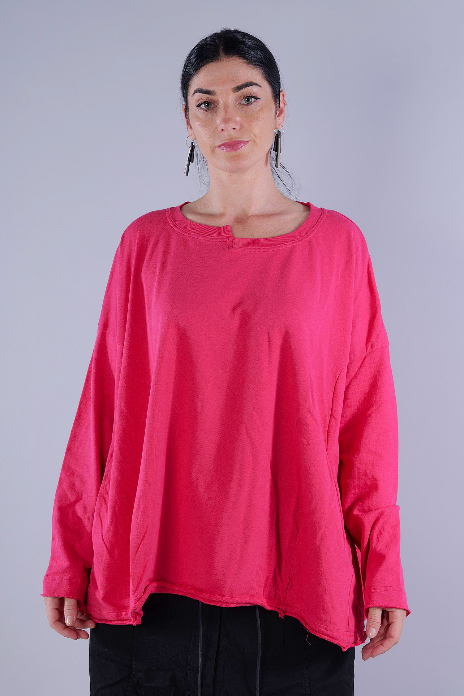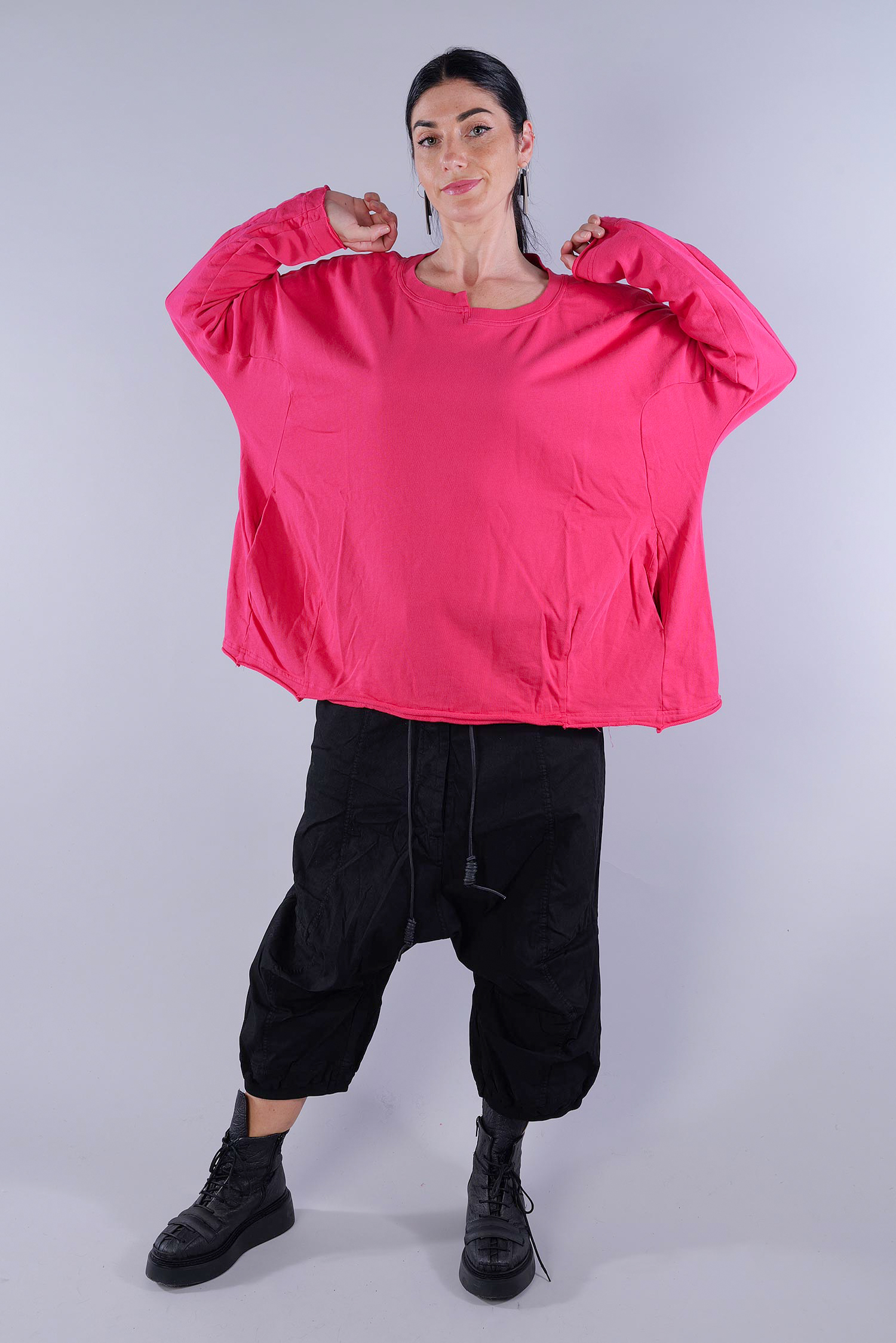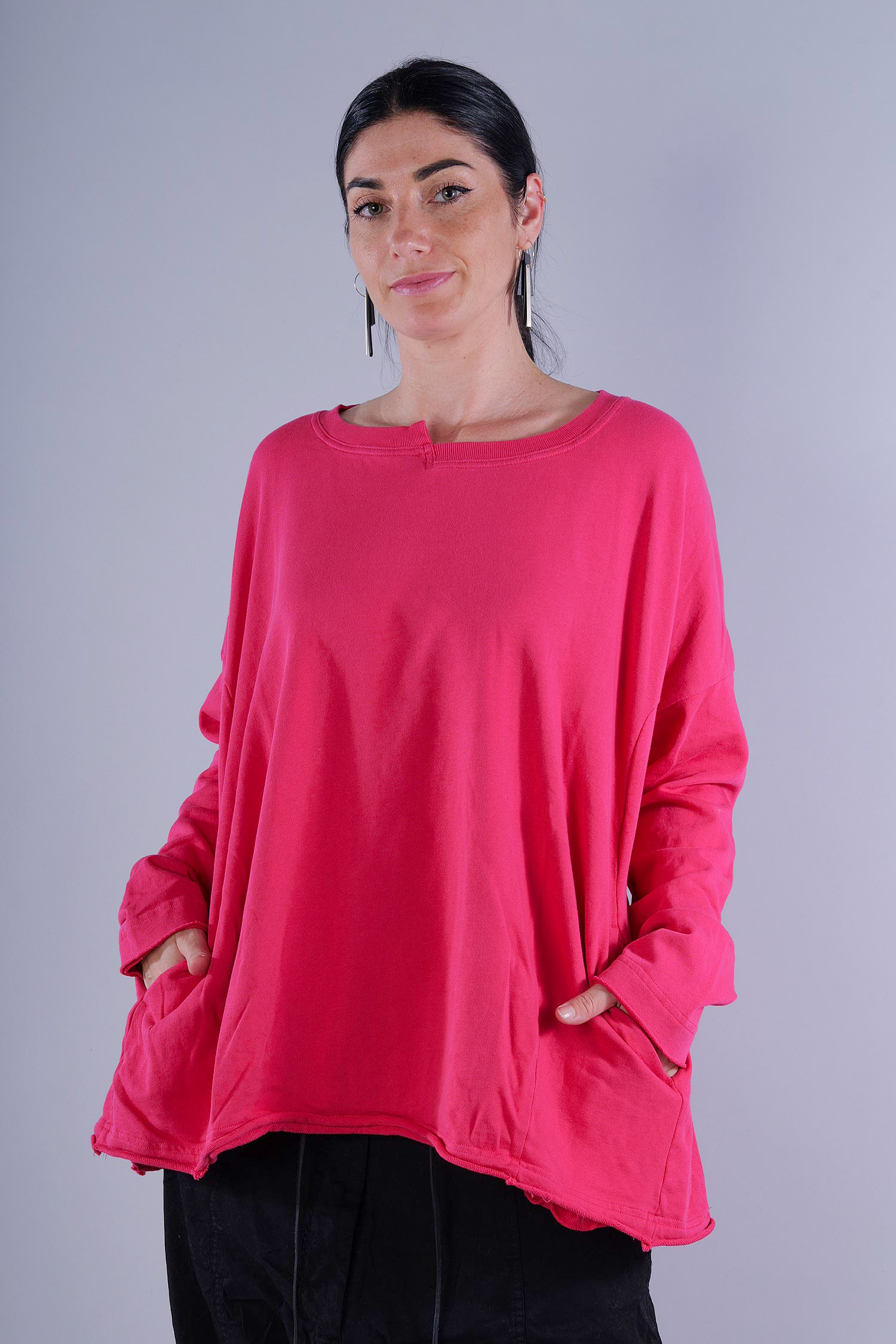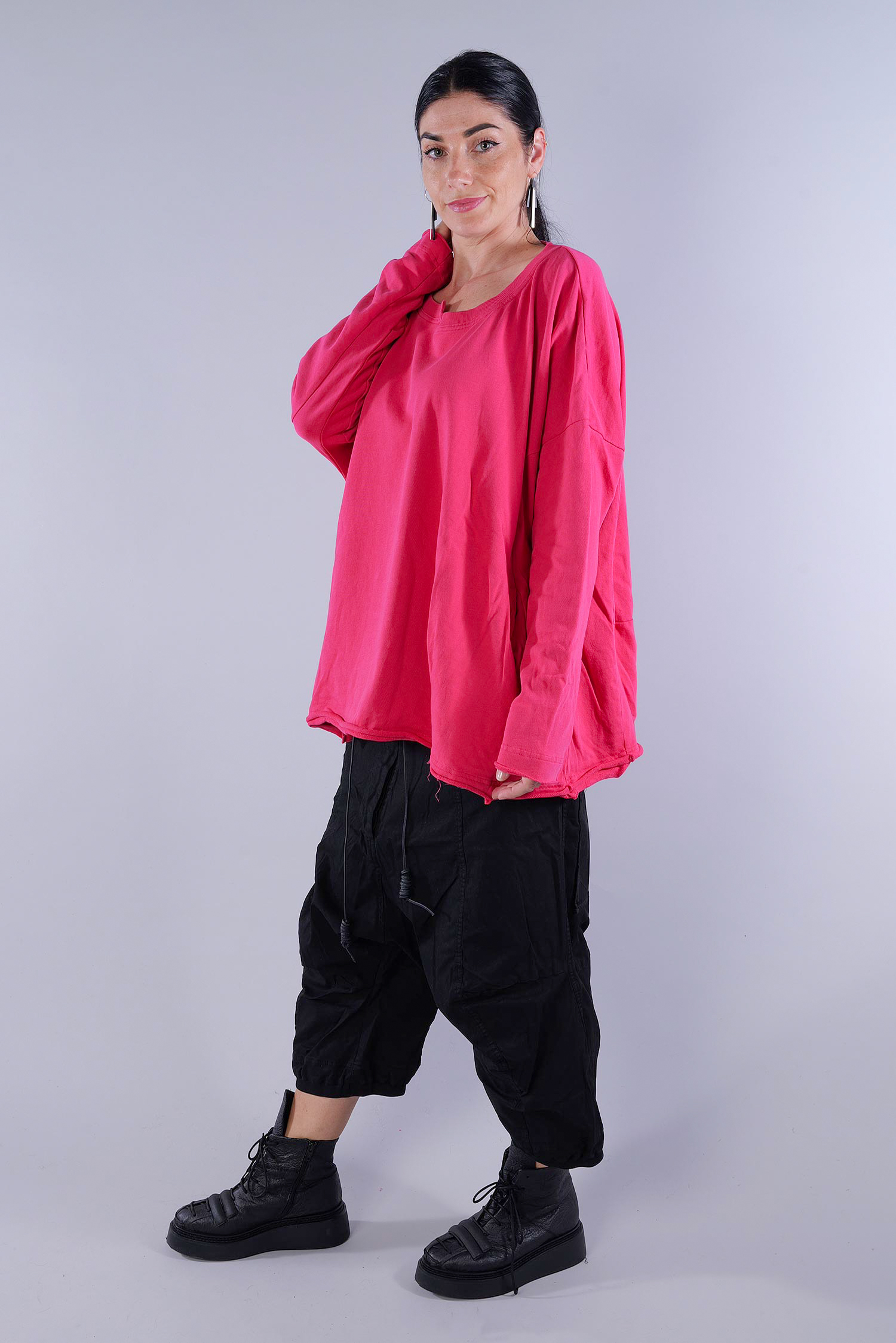 Details: - Extended shoulder - Long sleeve - Tulip-shaped oversize cut - Asymmetrical round neck - Side pockets - Rib jersey details on neckline - Open edges rolled up on hem and sleeves - Sweat material