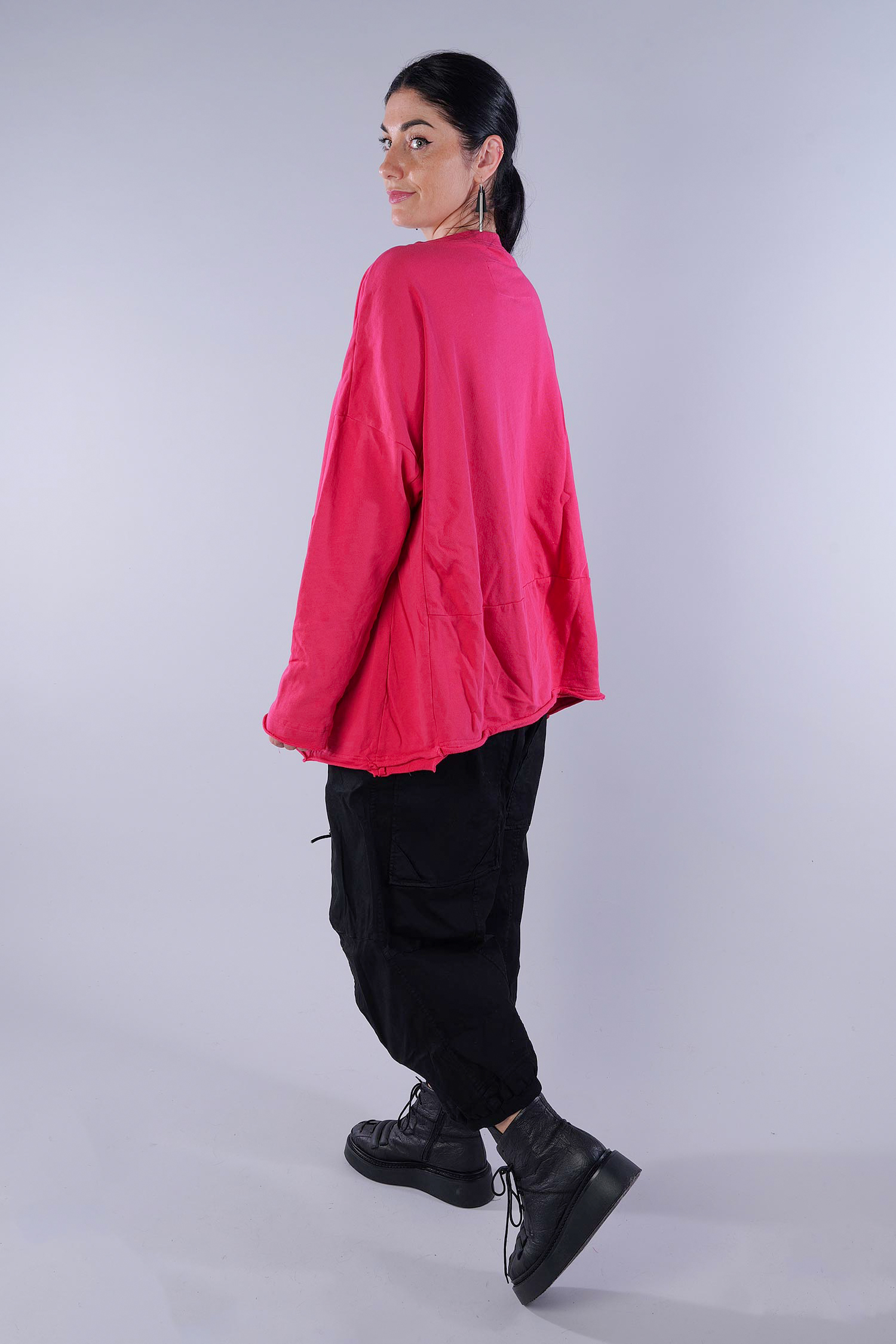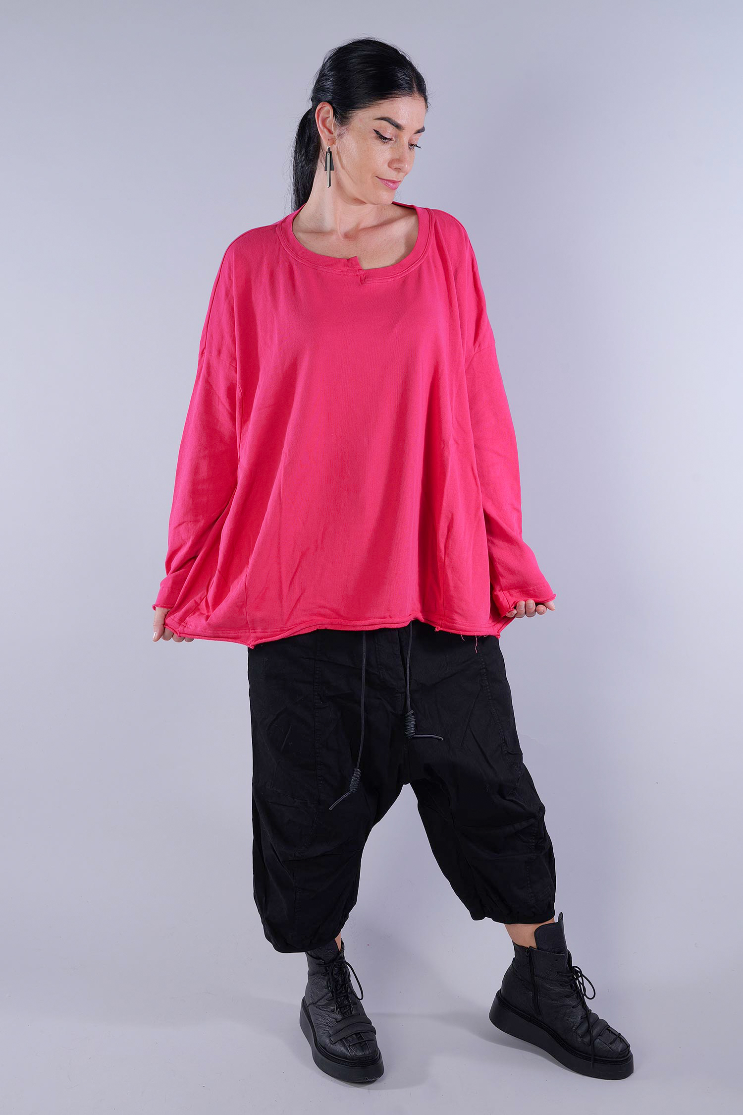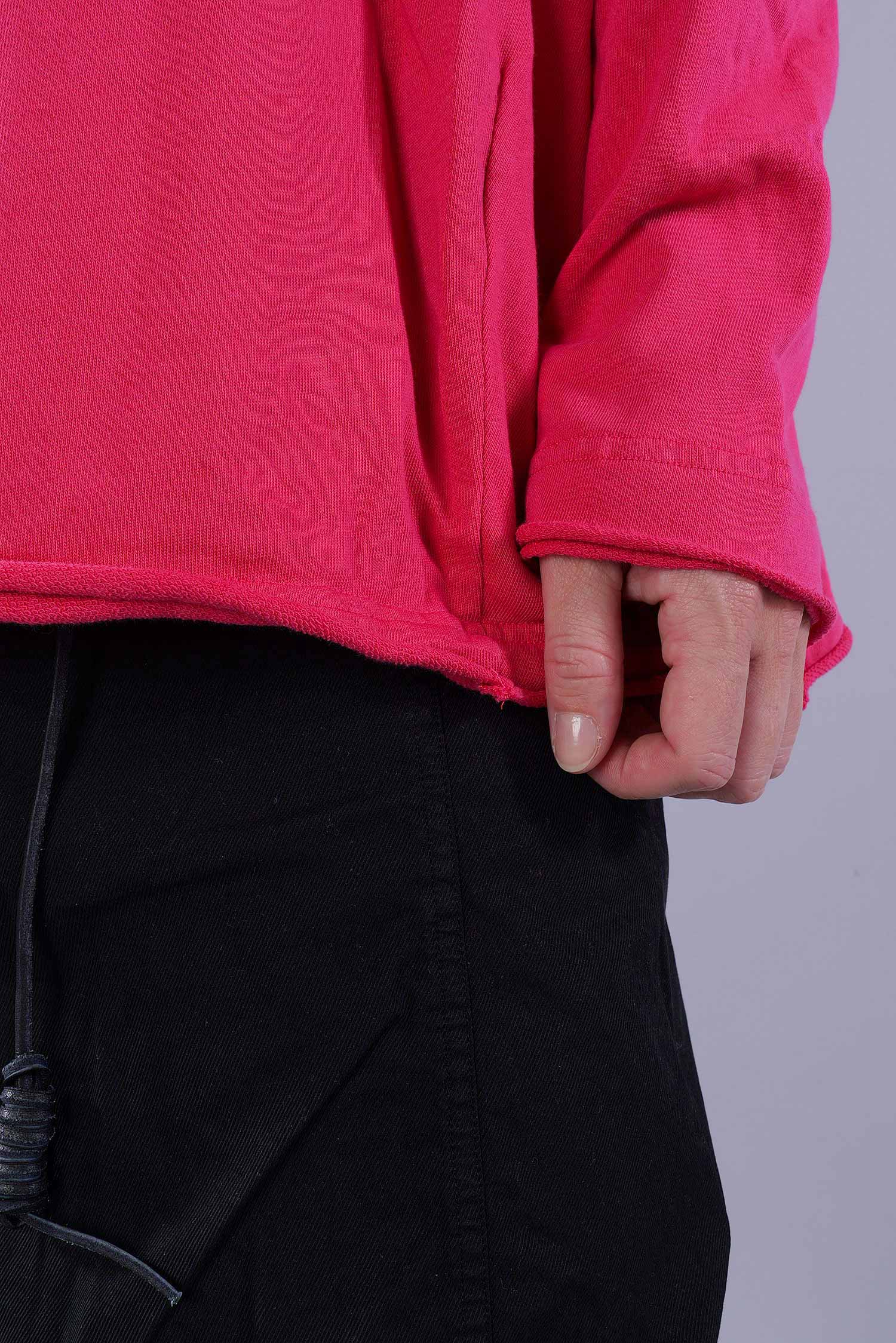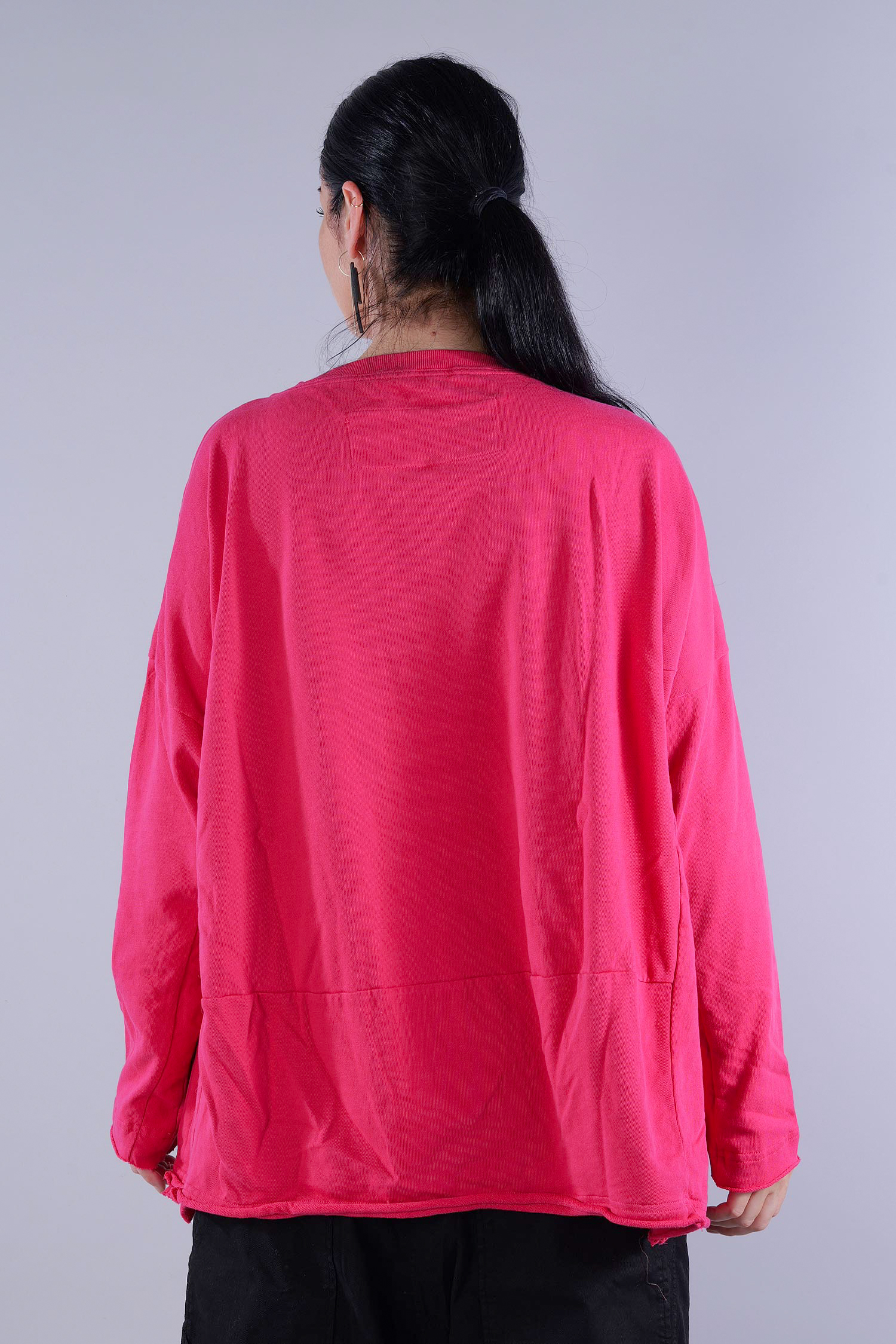 Details: - Extended shoulder - Long sleeve - Tulip-shaped oversize cut - Asymmetrical round neck - Side pockets - Rib jersey details on neckline - Open edges rolled up on hem and sleeves - Sweat material