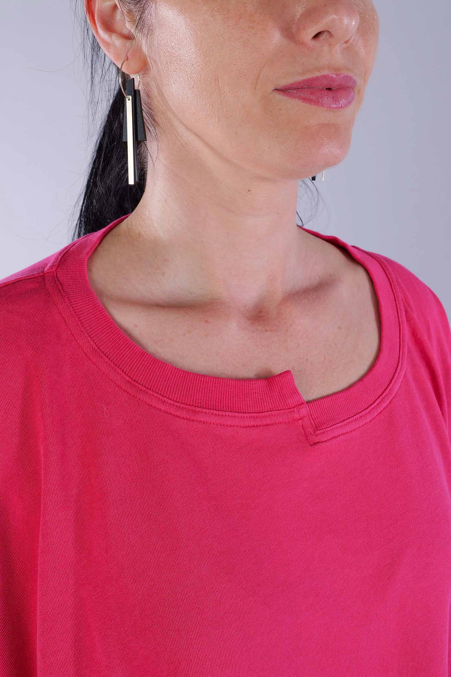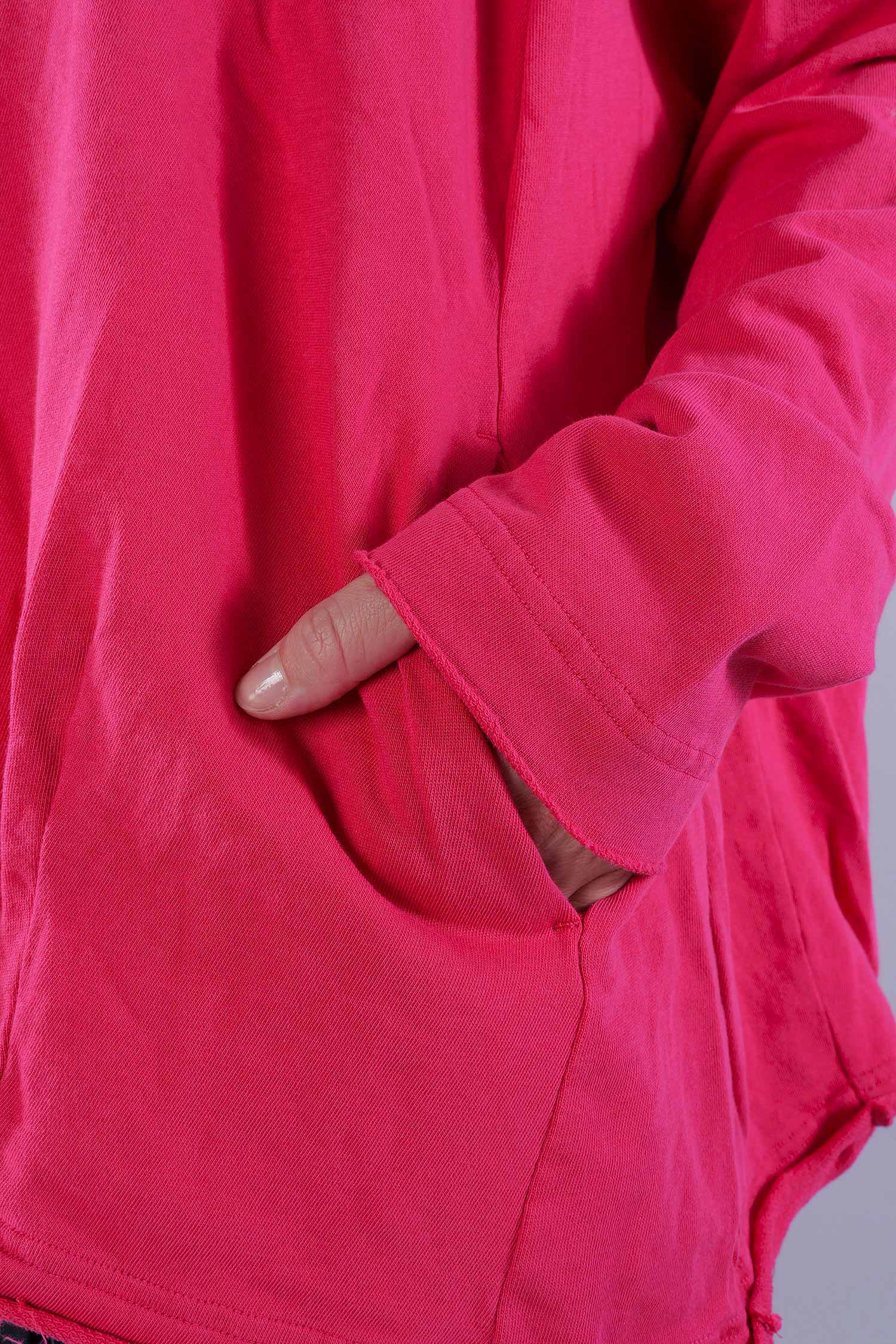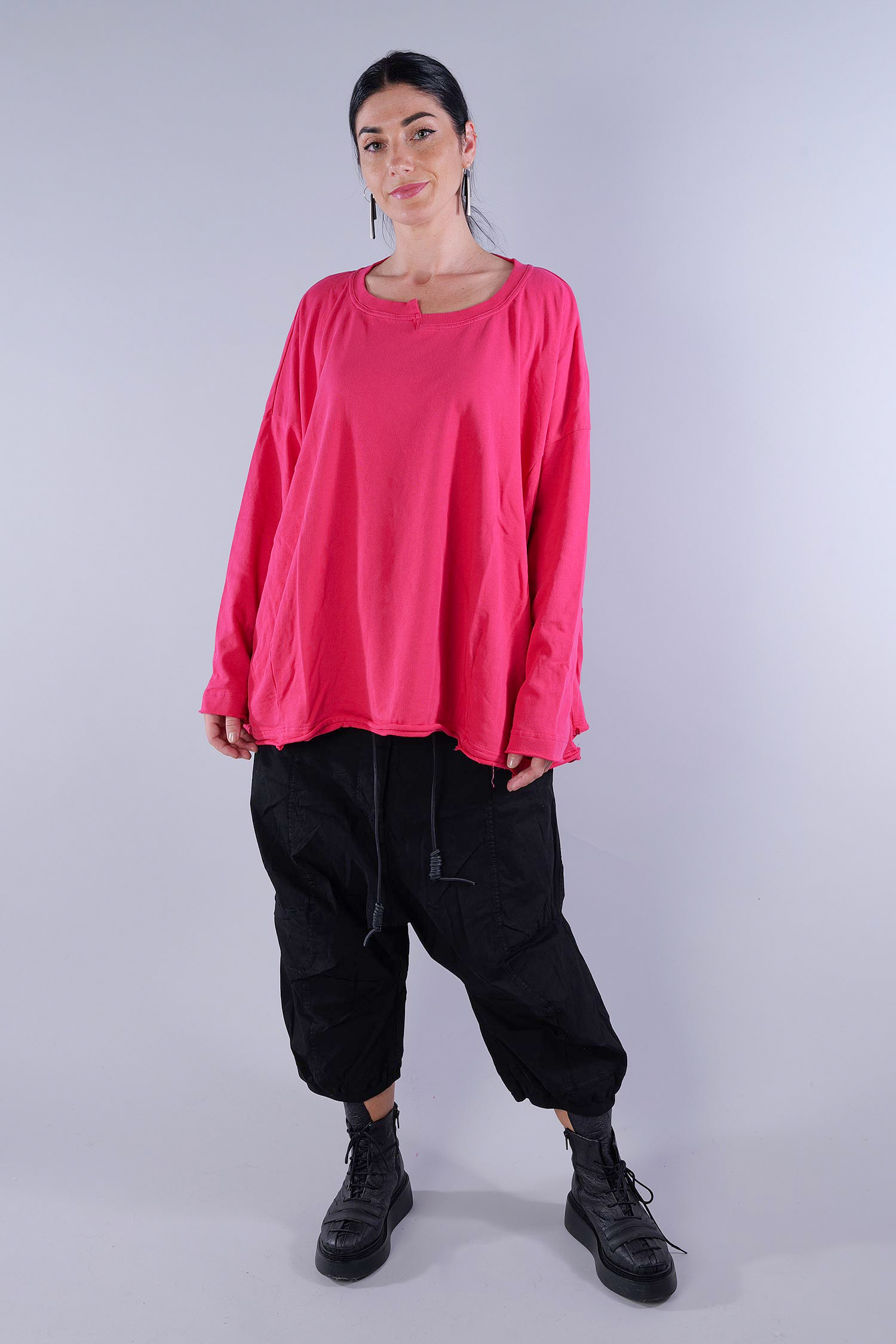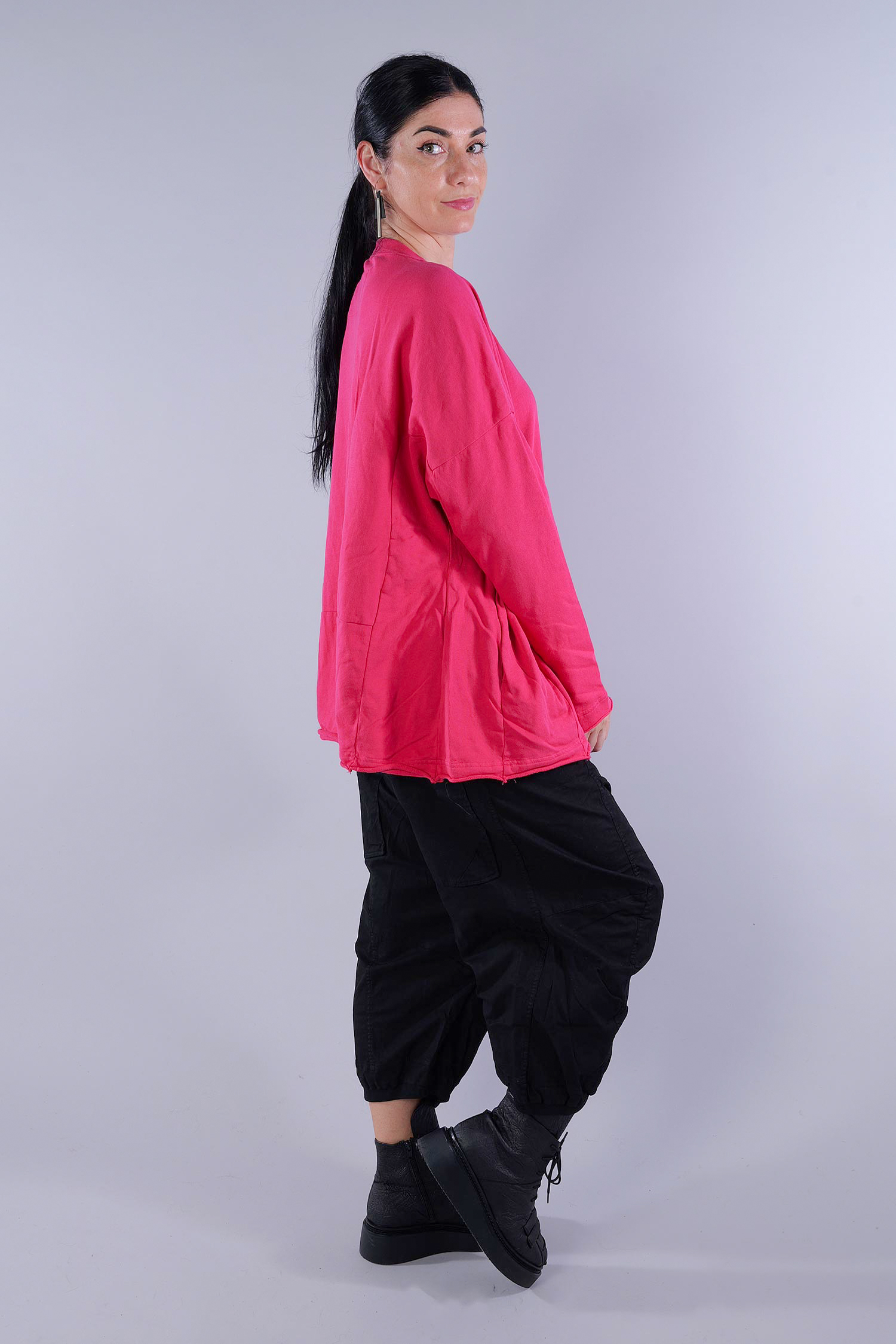 Details: - Extended shoulder - Long sleeve - Tulip-shaped oversize cut - Asymmetrical round neck - Side pockets - Rib jersey details on neckline - Open edges rolled up on hem and sleeves - Sweat material