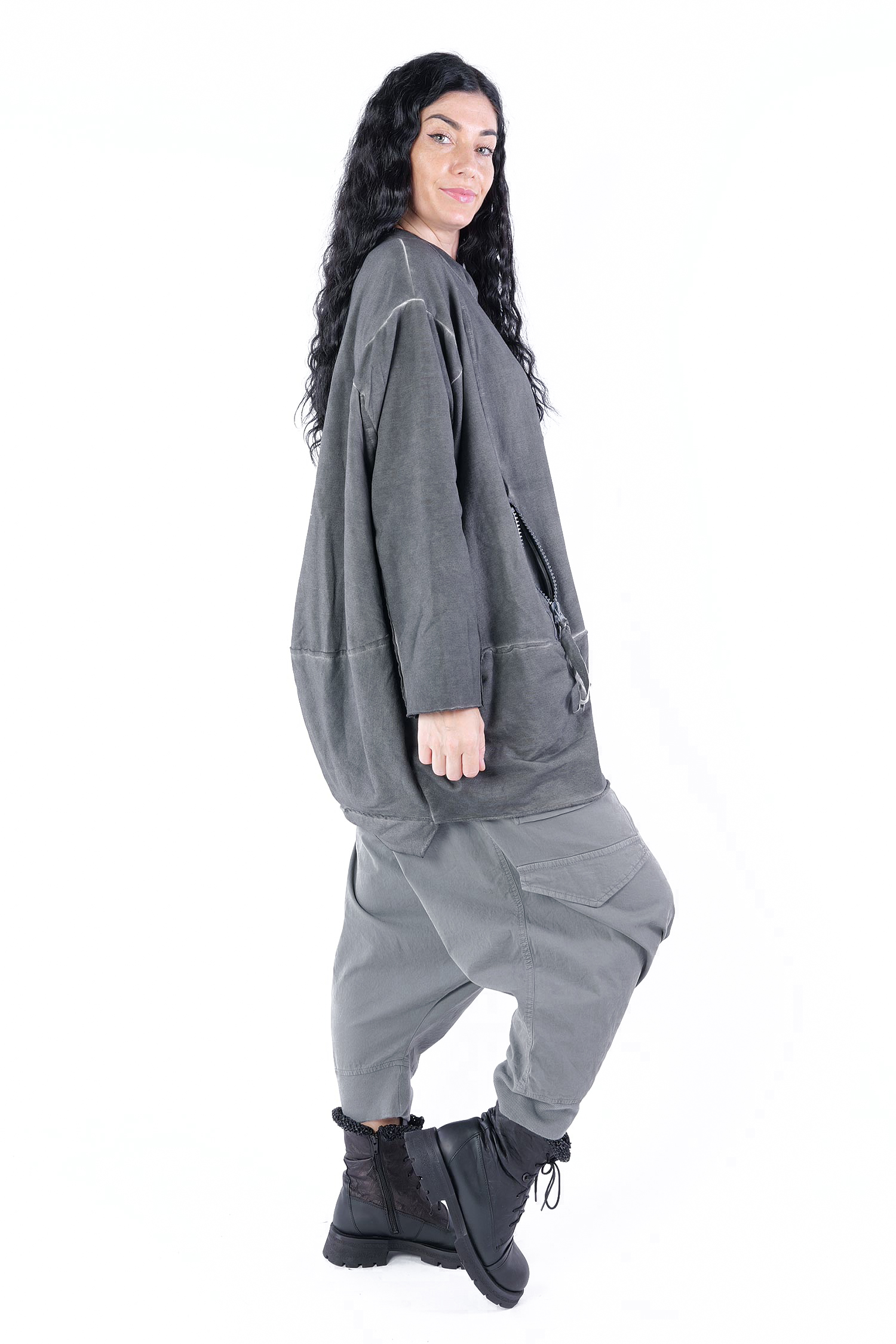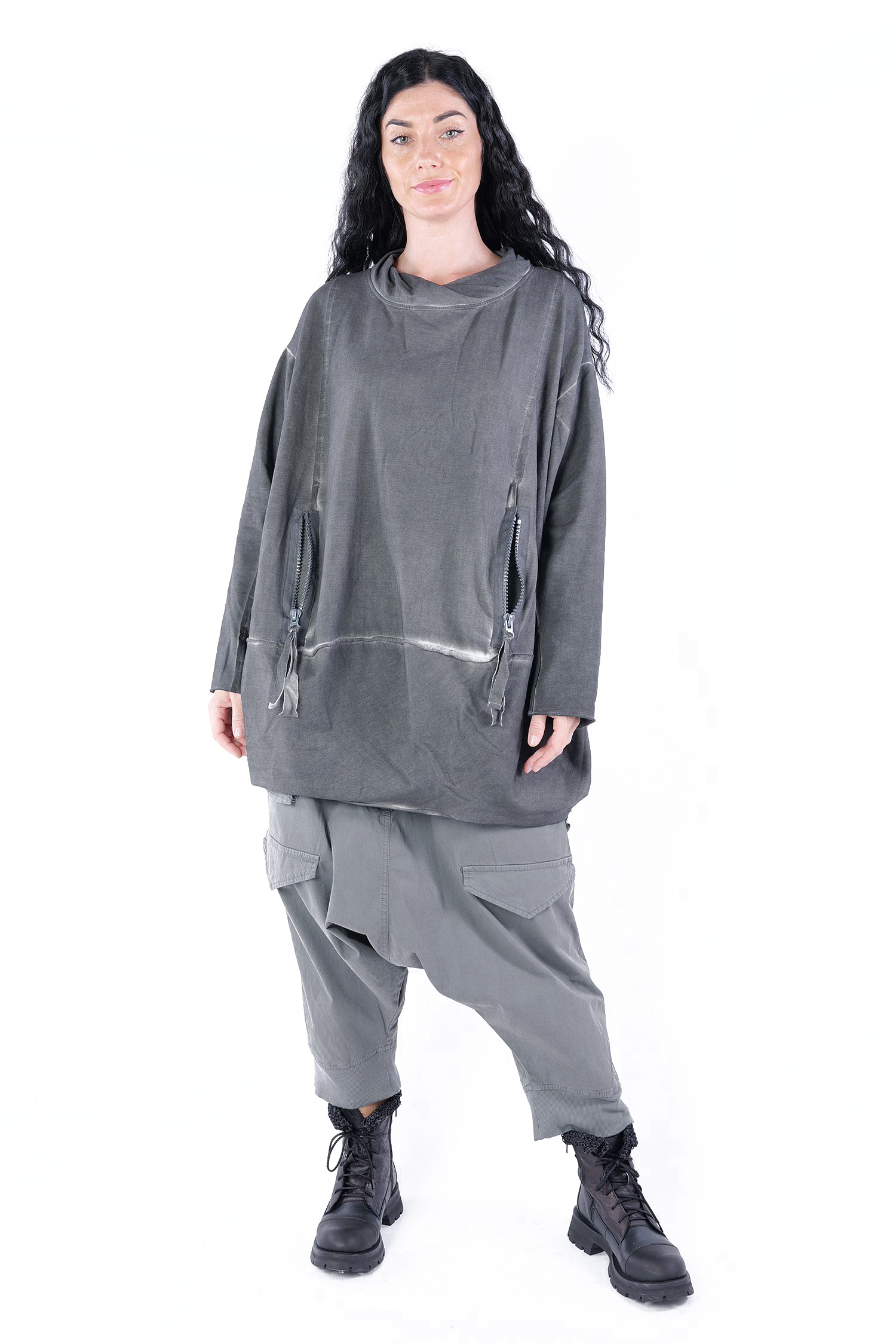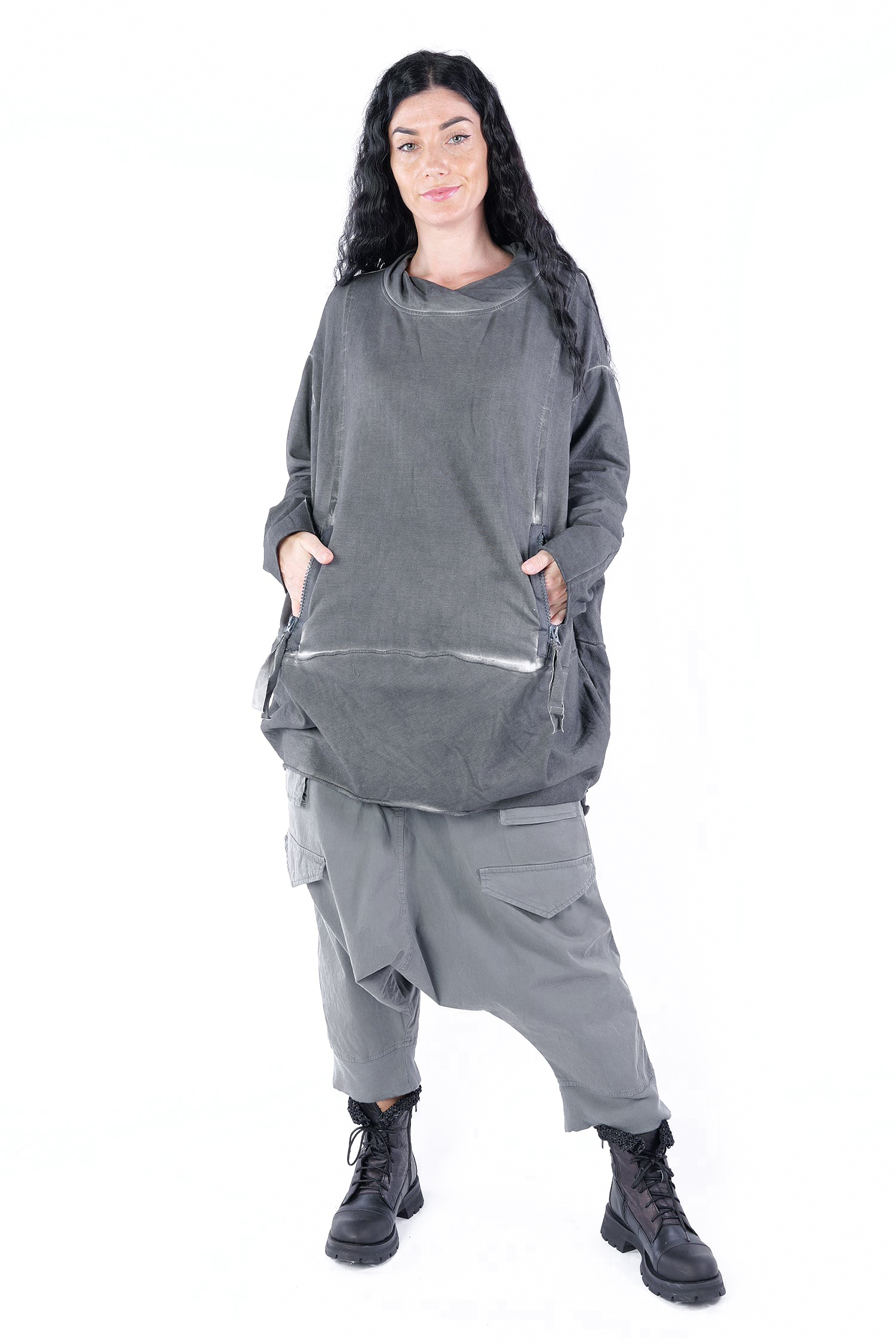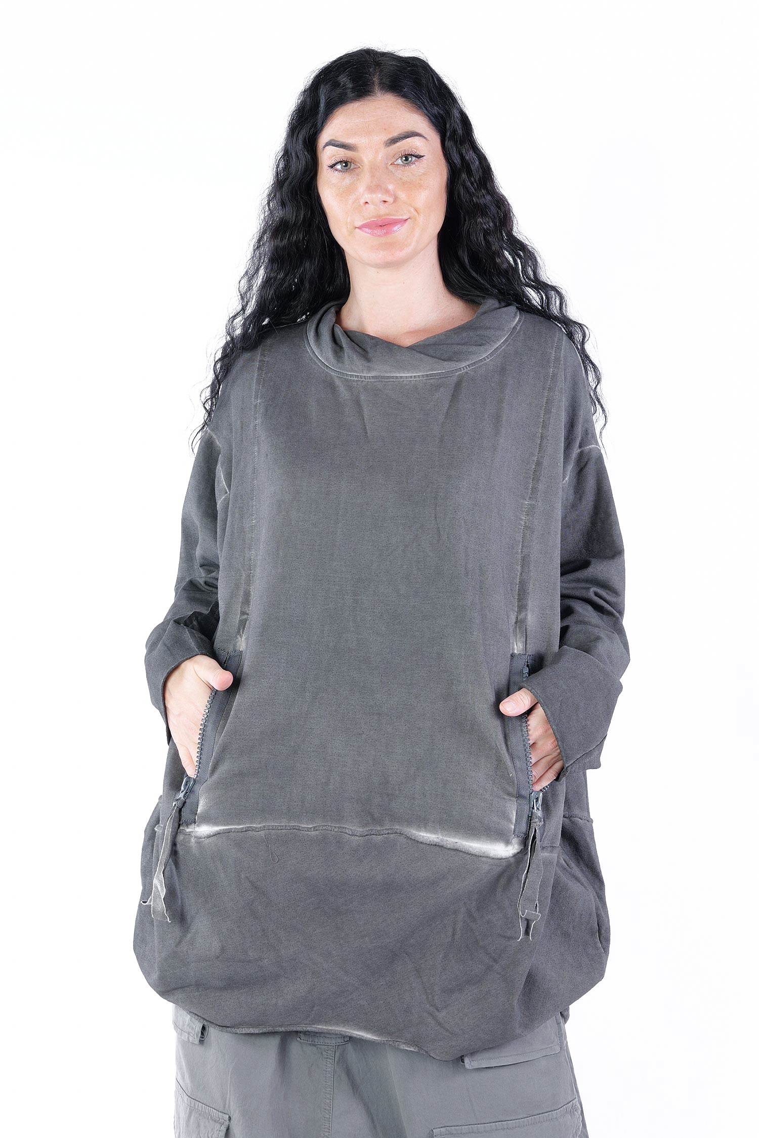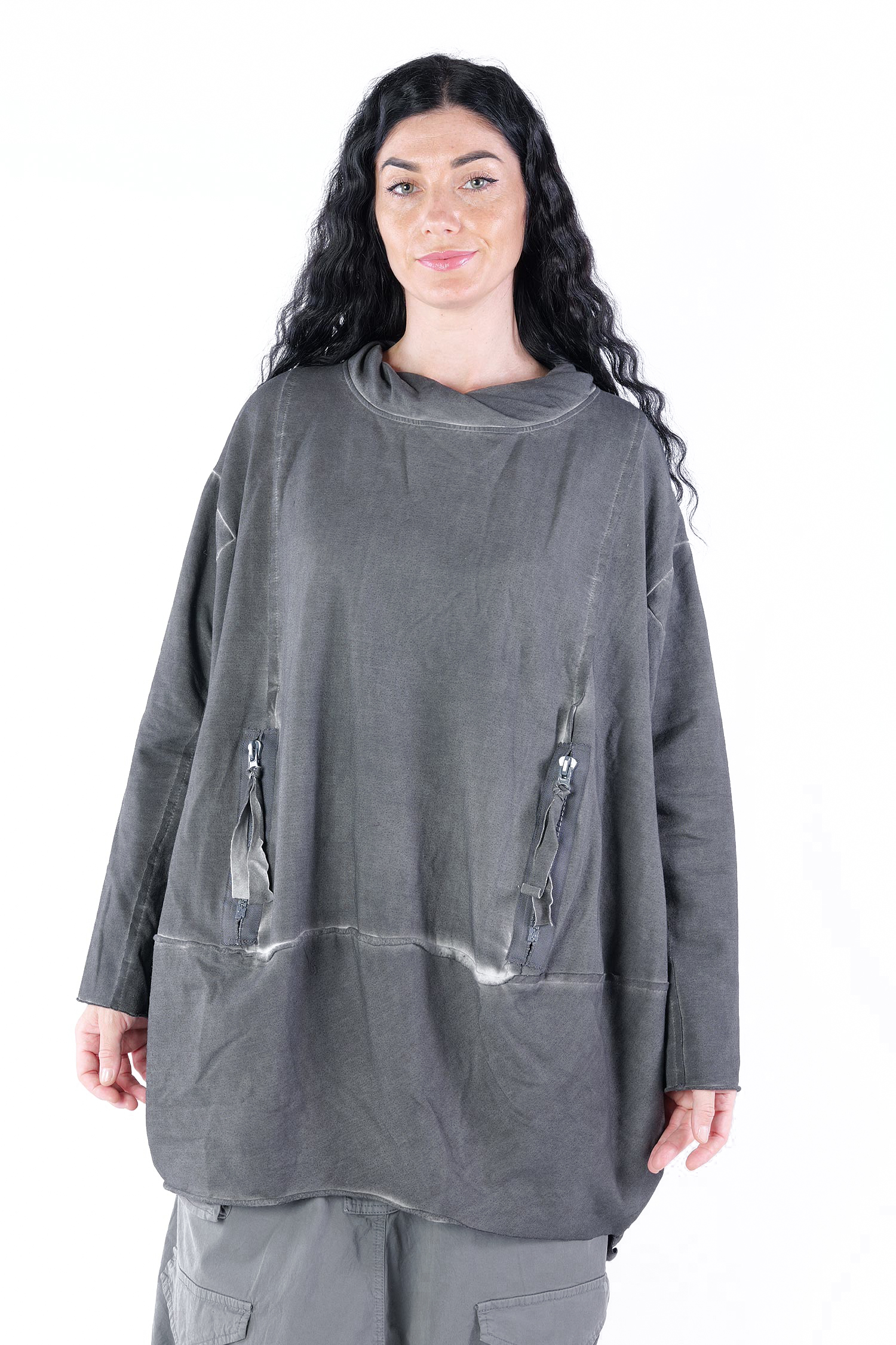 Details: - Zip pockets - Collar twisted in itself - Extended shoulder - O-shaped - Sweat material, cozy and napped inside - Oversize - Open edges