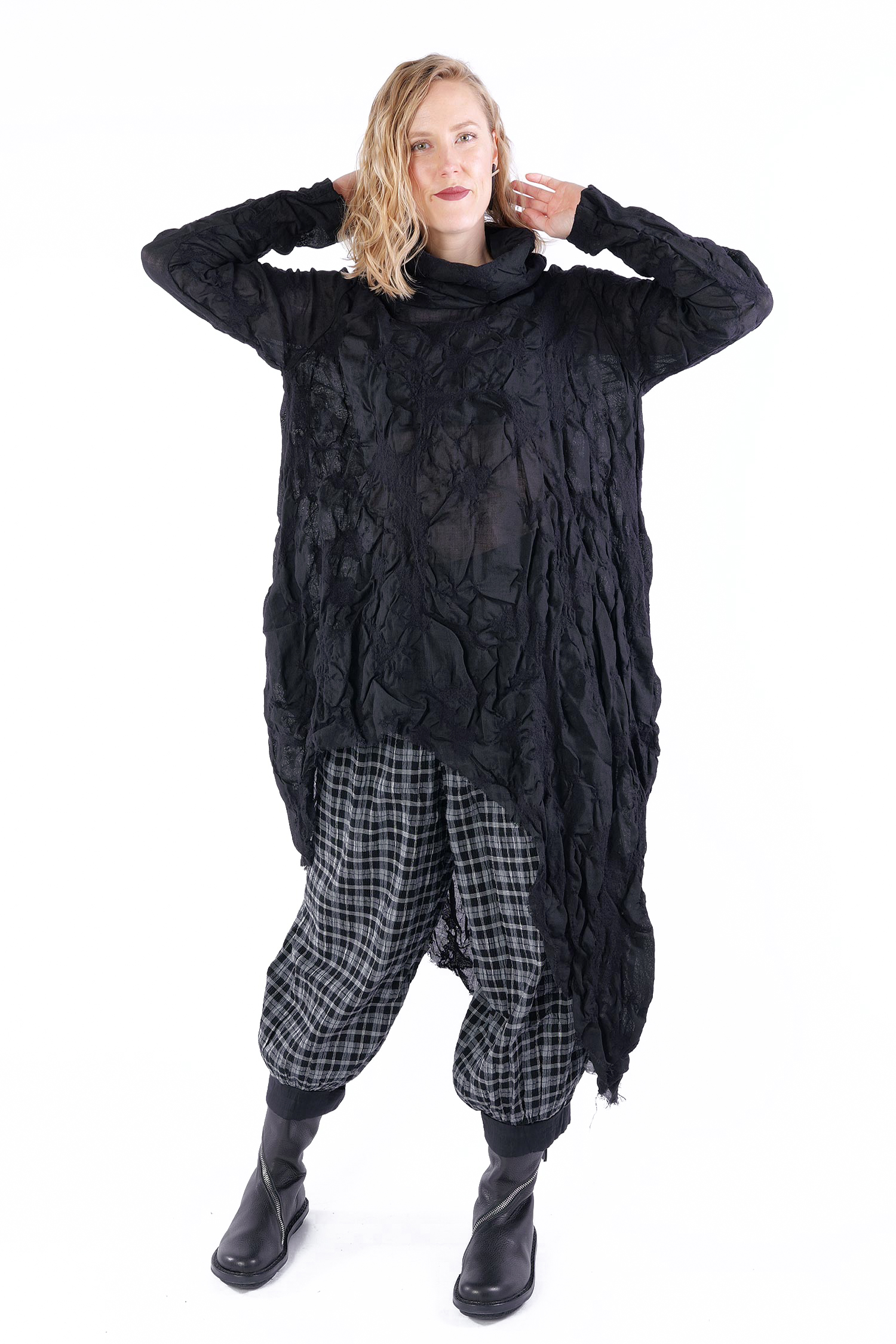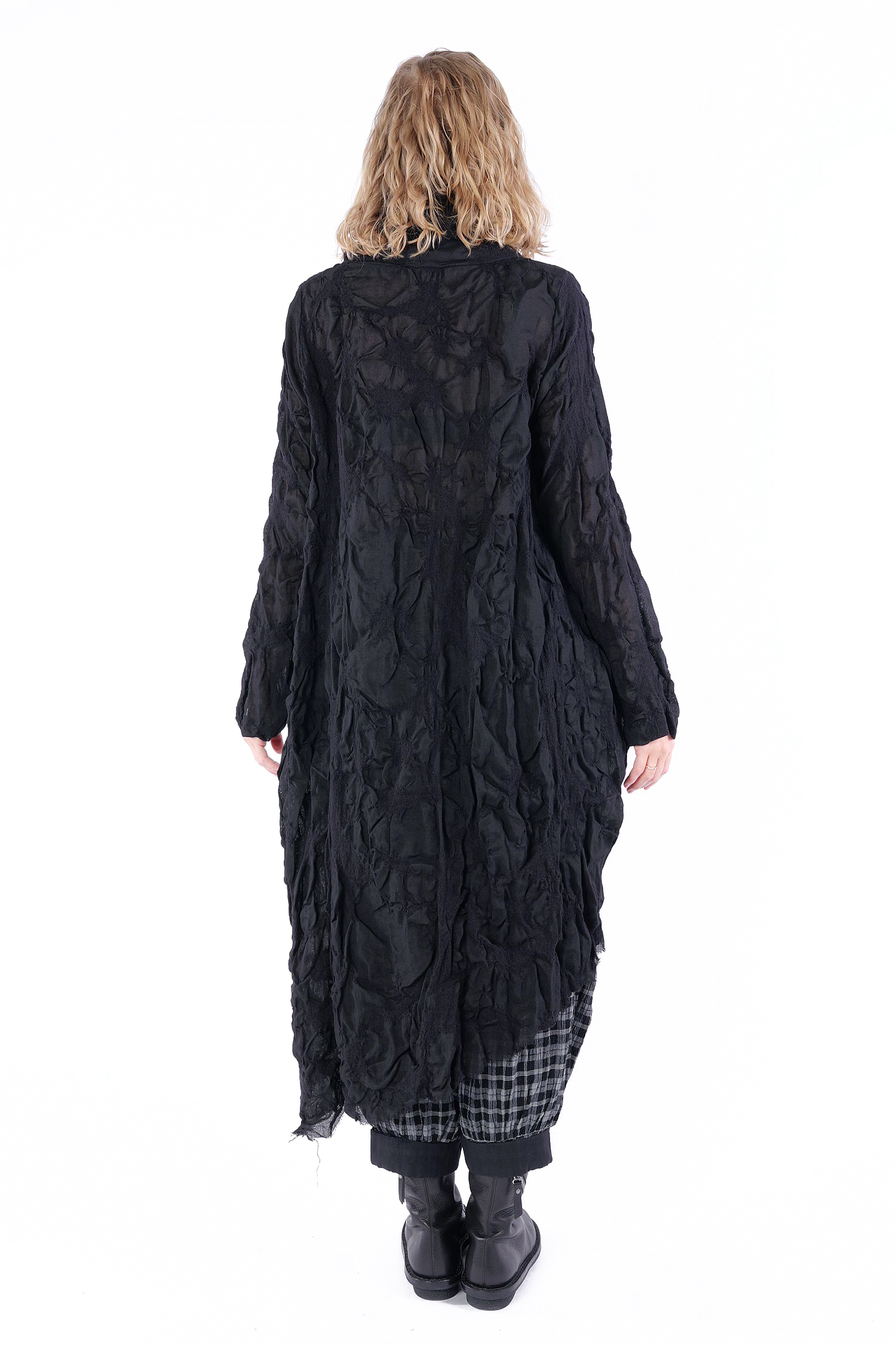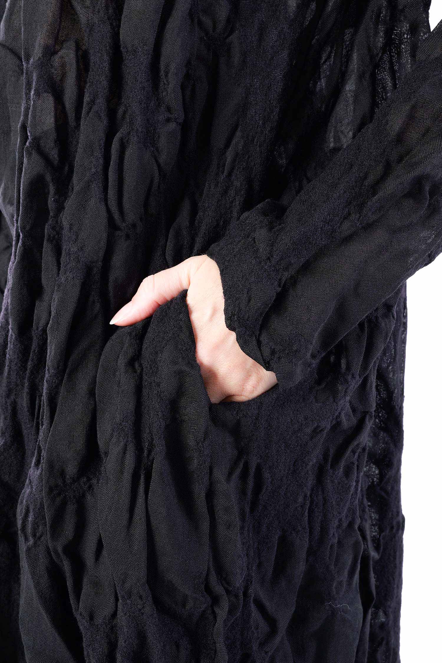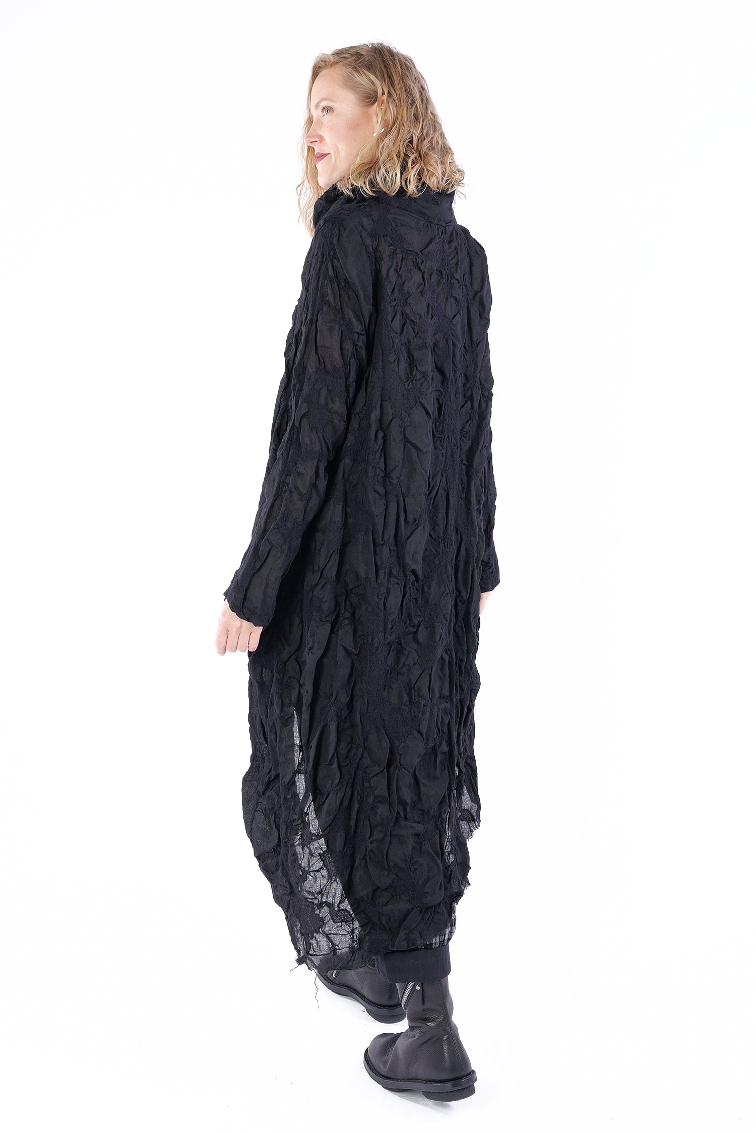 Details: - Semi-transparent wool fabric with structure - Loose collar - Asymmetrical hem - Side and back longer - Long sleeves - Side pockets - Open frayed edges - Oversize - Tulip-shaped cut