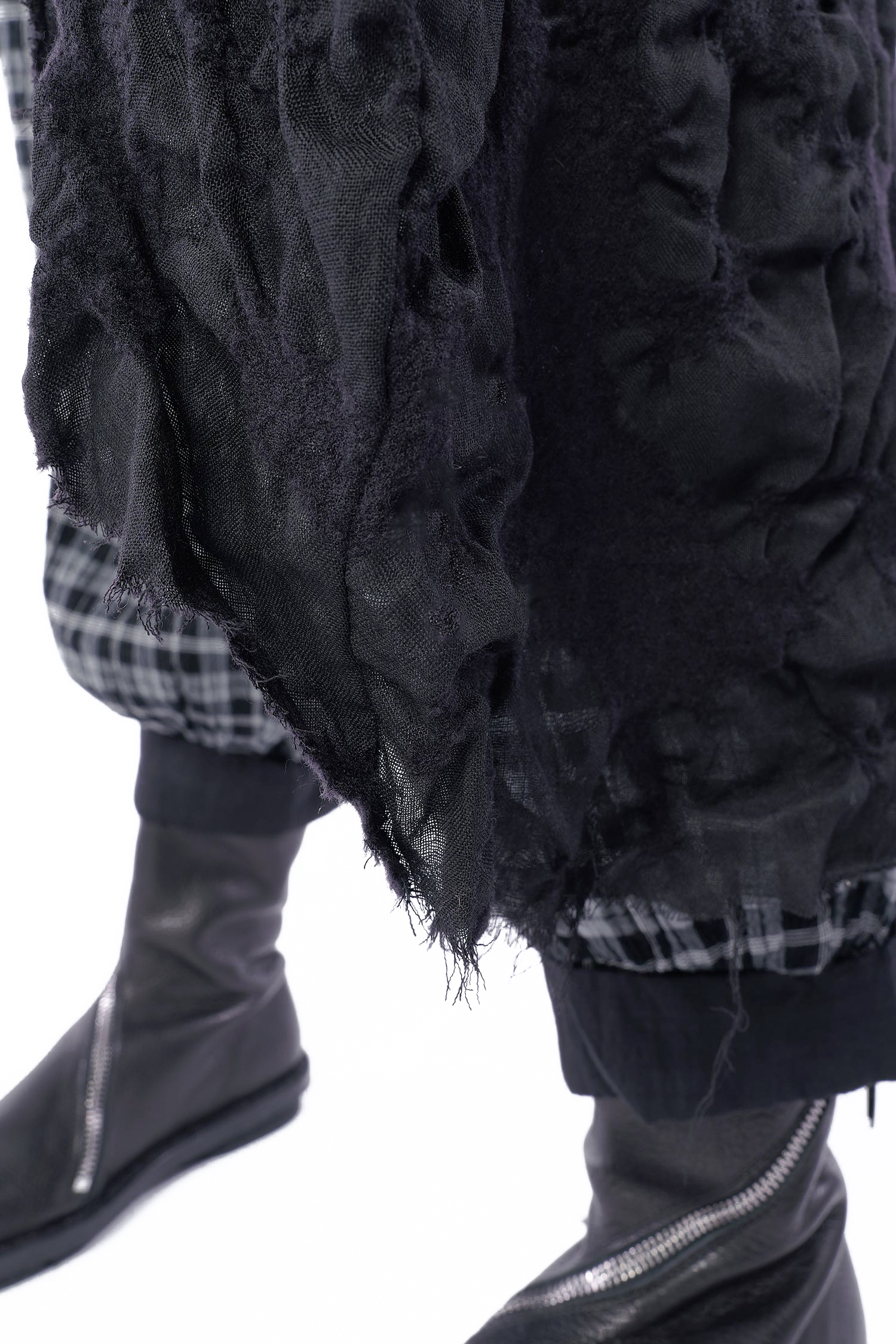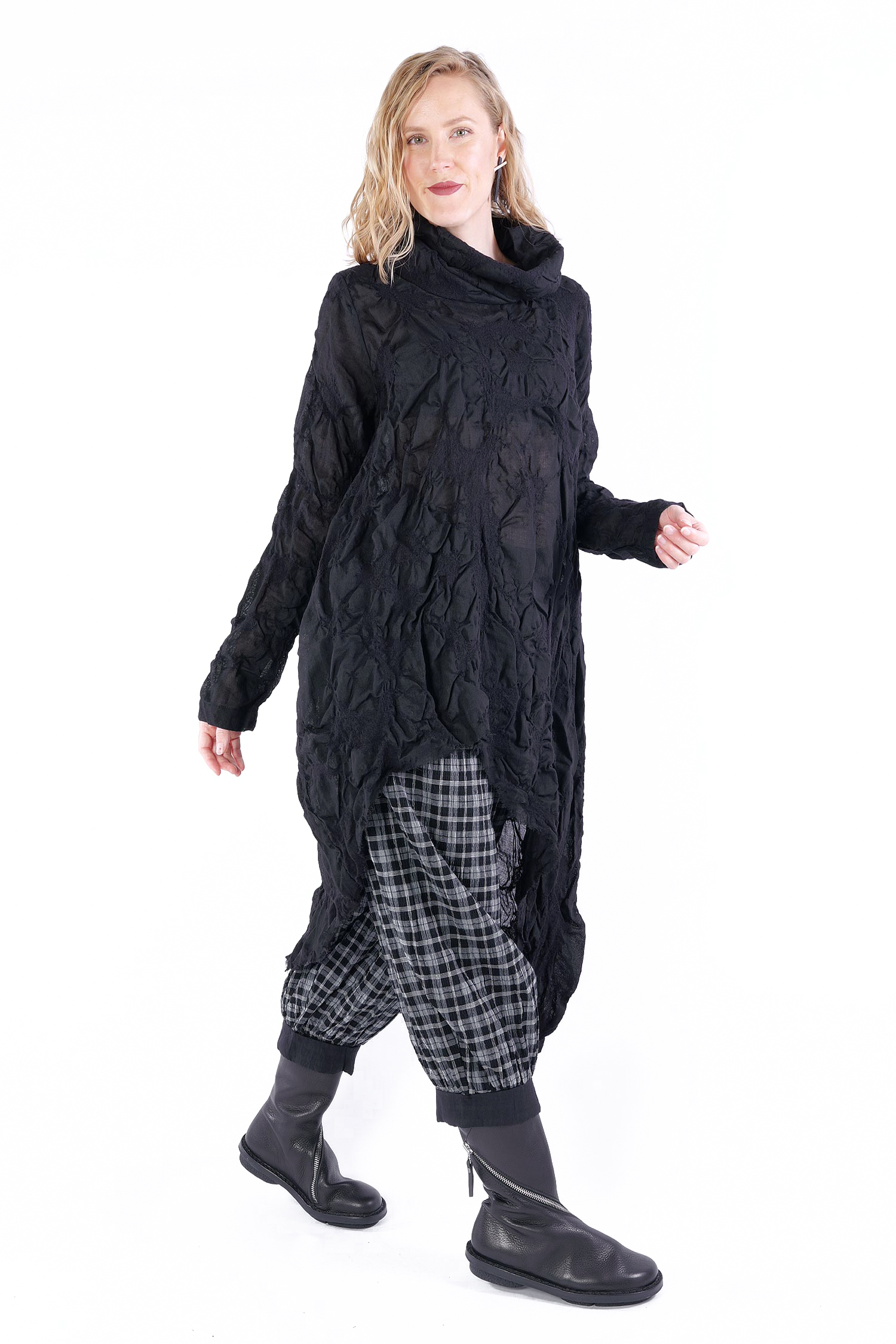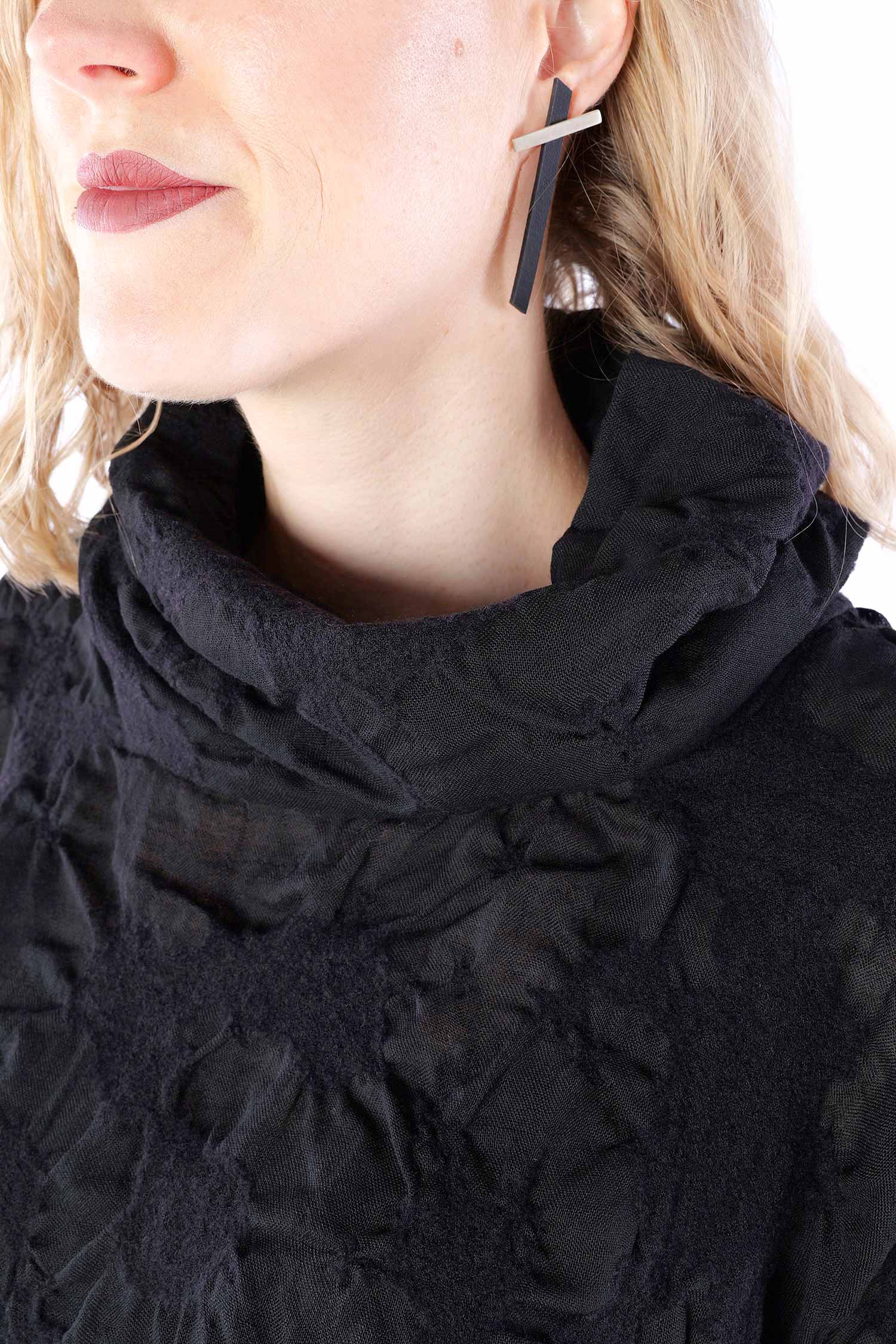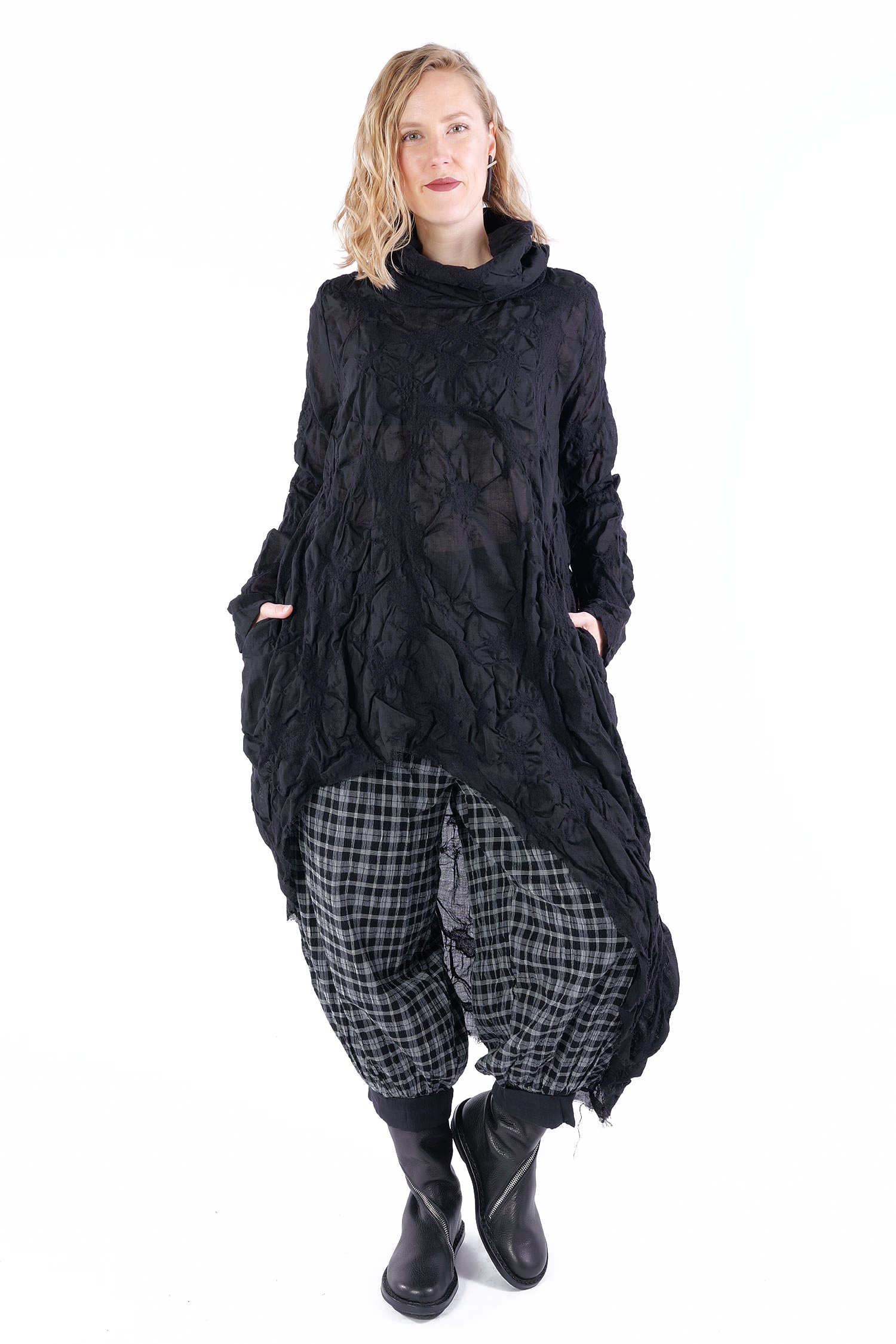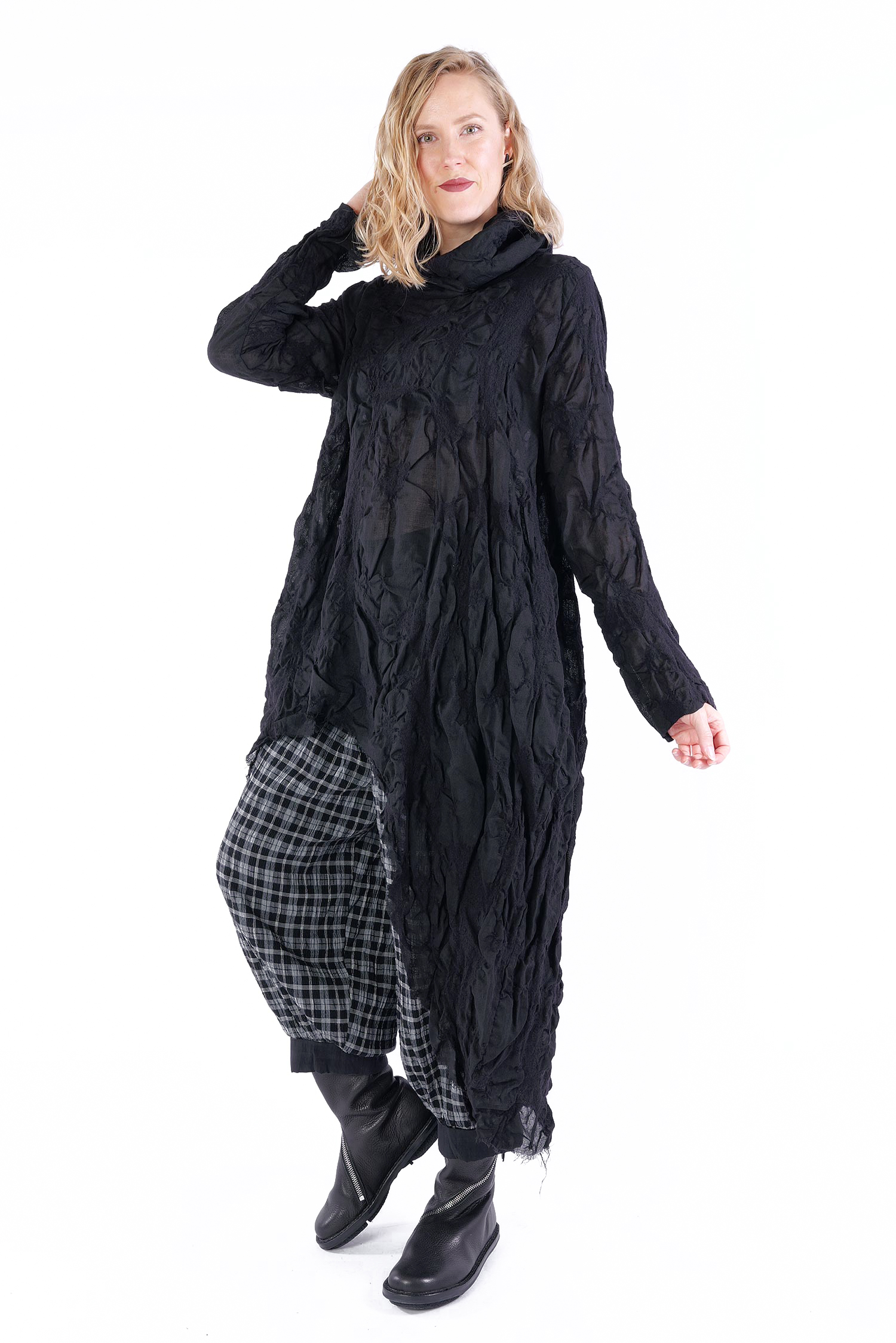 Details: - Semi-transparent wool fabric with structure - Loose collar - Asymmetrical hem - Side and back longer - Long sleeves - Side pockets - Open frayed edges - Oversize - Tulip-shaped cut