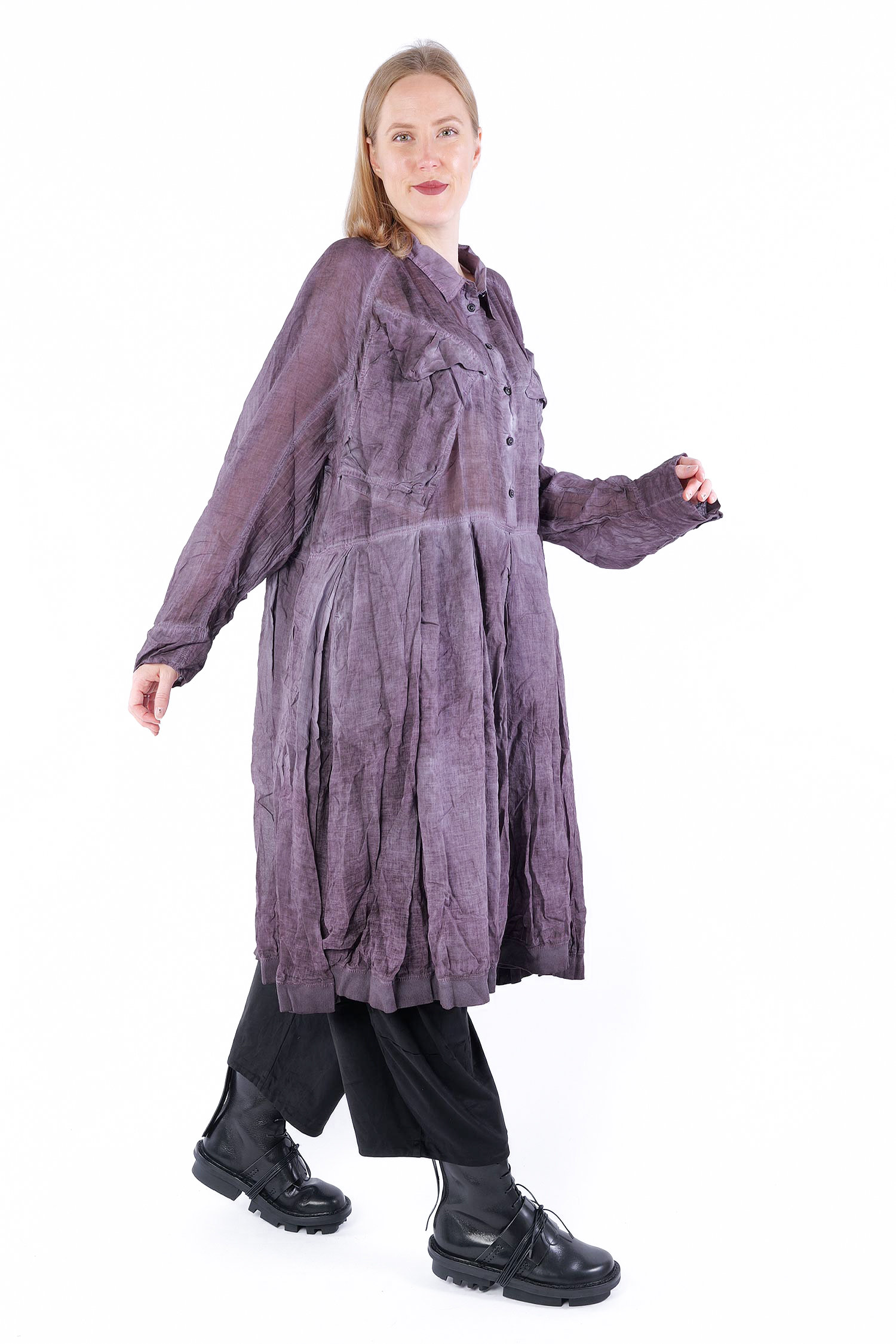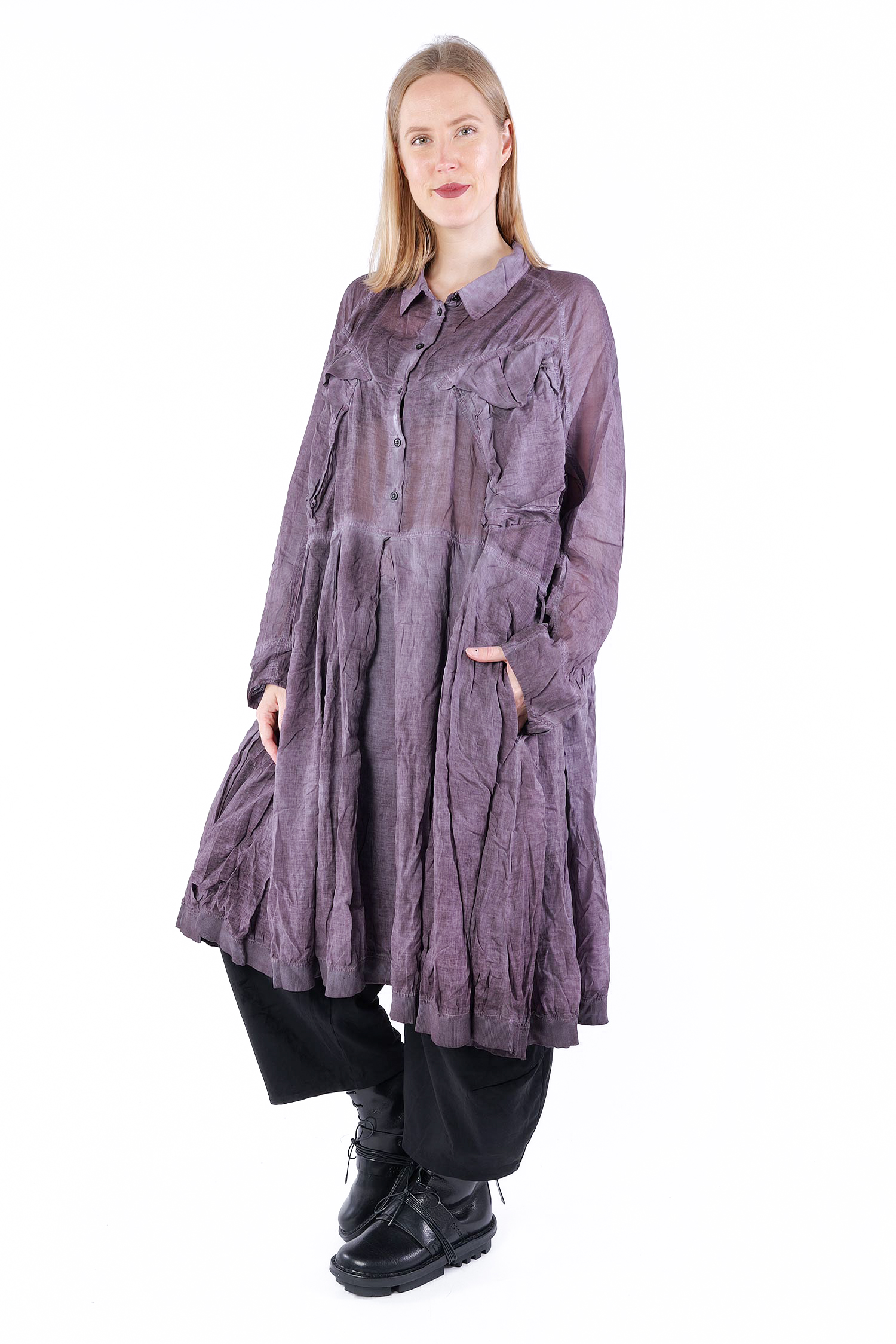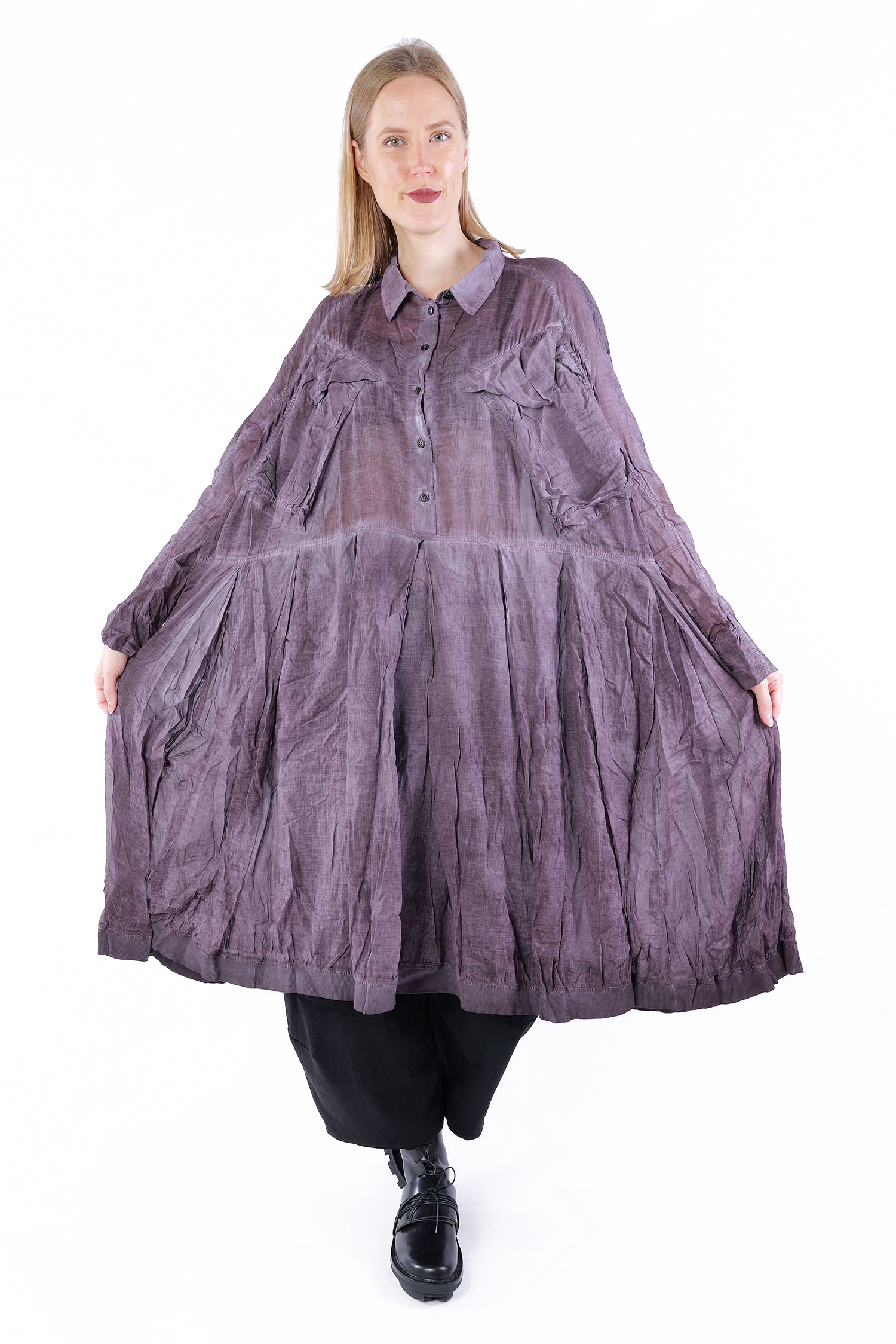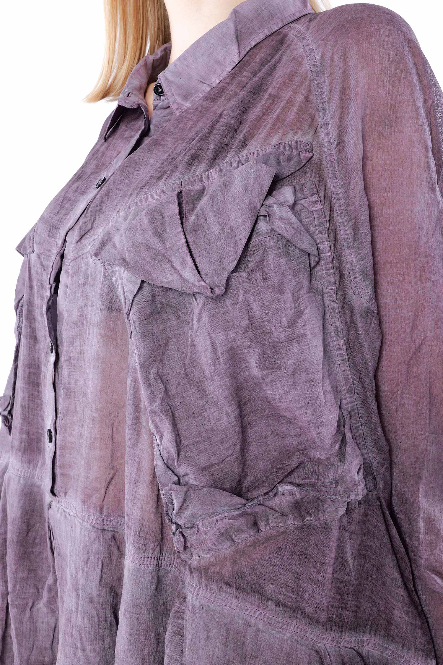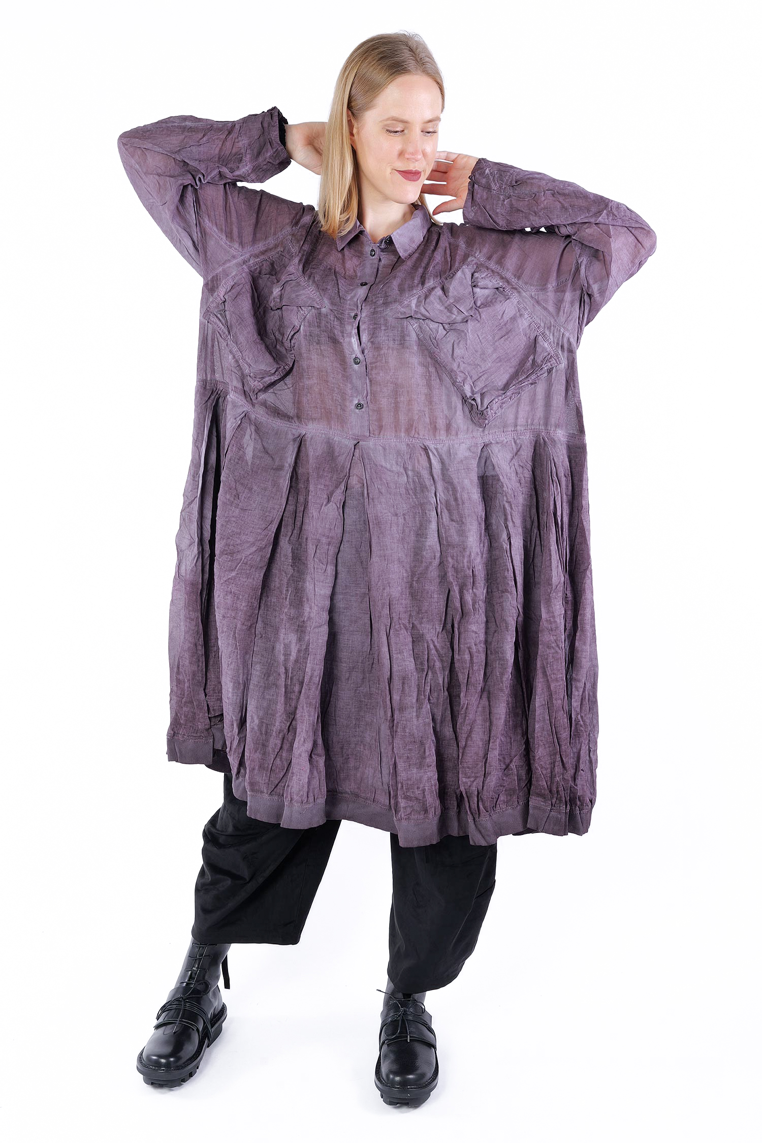 Details: - Skirt-part with pleats - Tulip-shaped cut on sleeves - Collar - Hem with rib jersey - Large breast pockets with envelope-look and button - Button tape at the front - Raglan sleeves - Semi-transparent - Sleeves with cut and button (envelope-look)