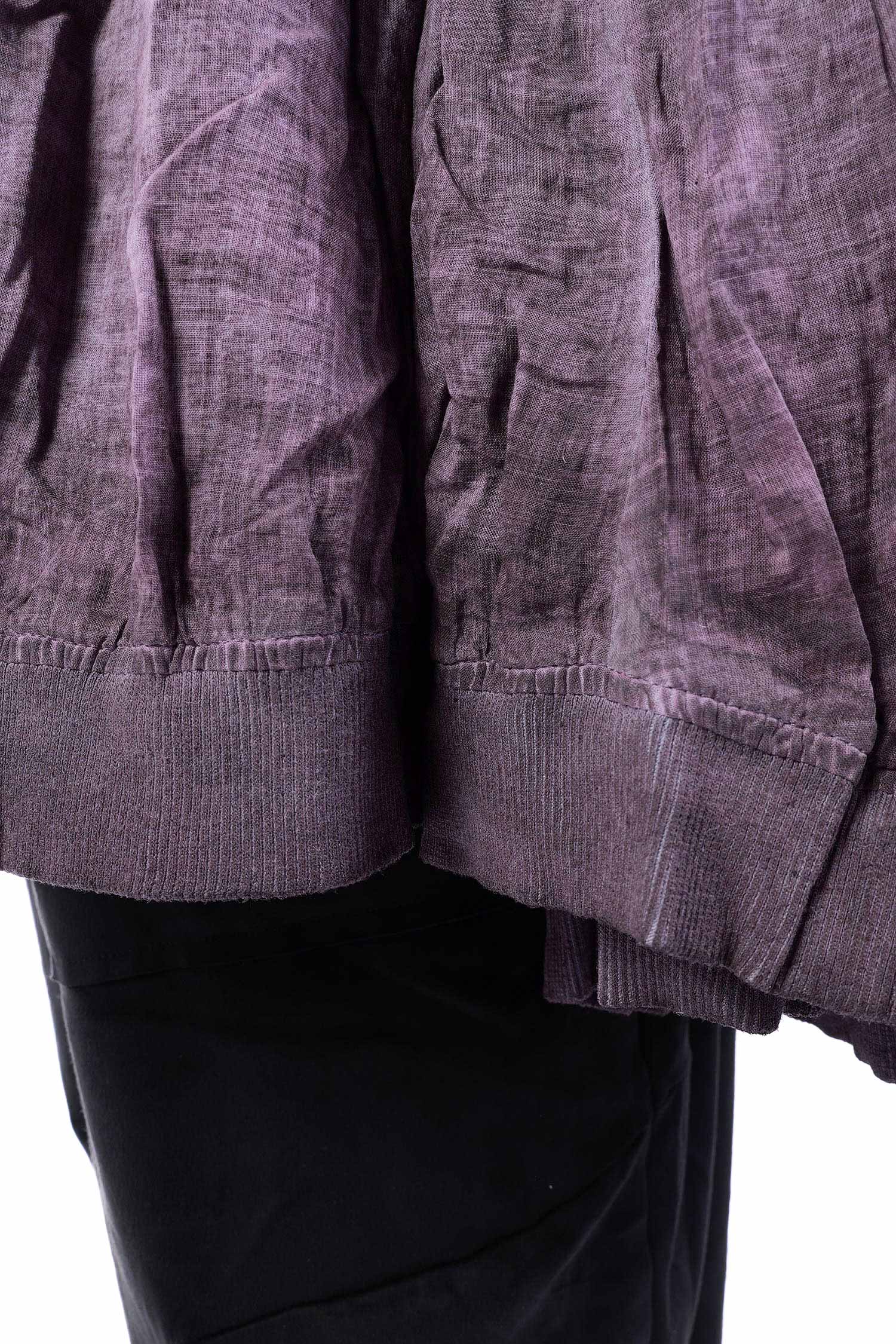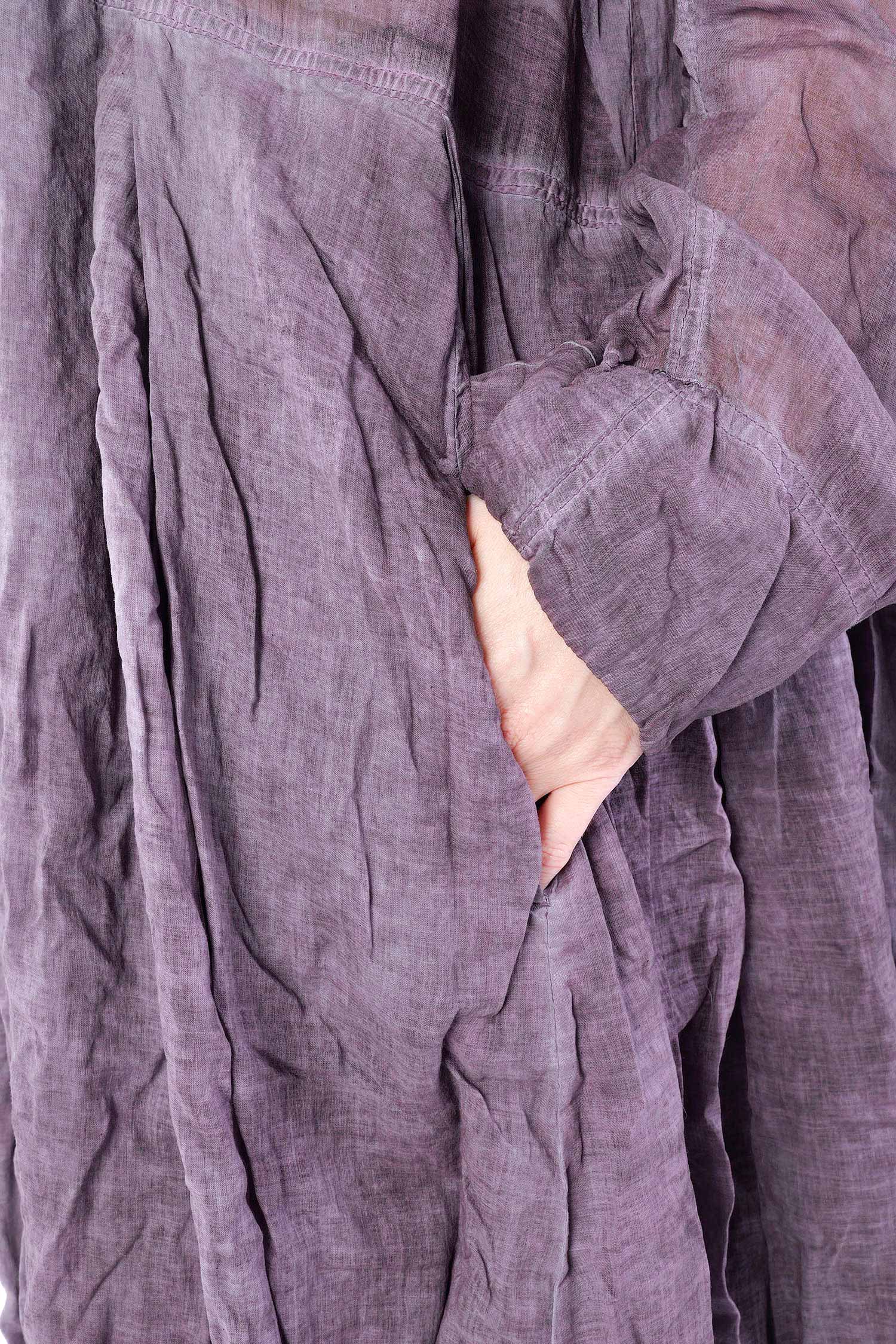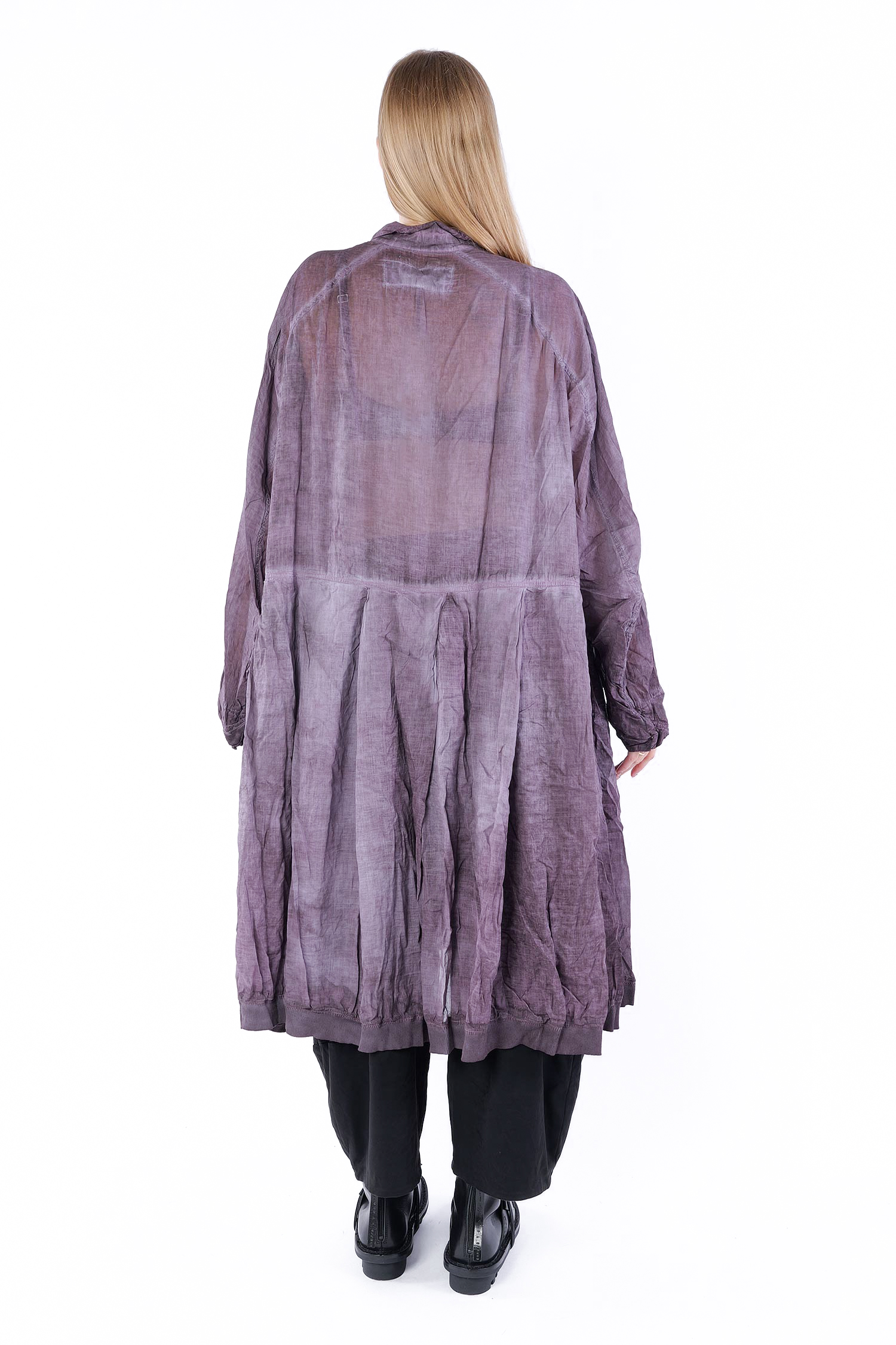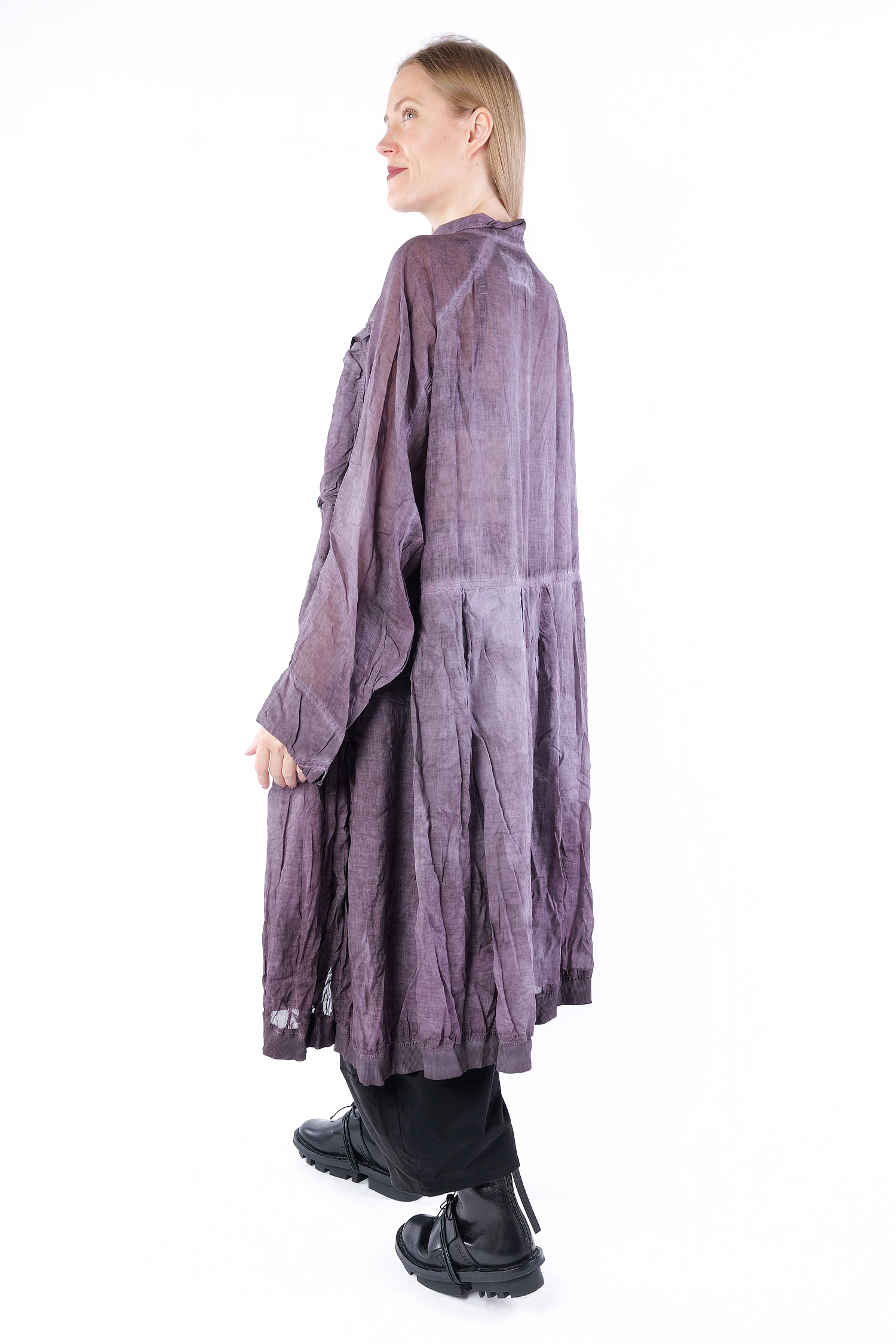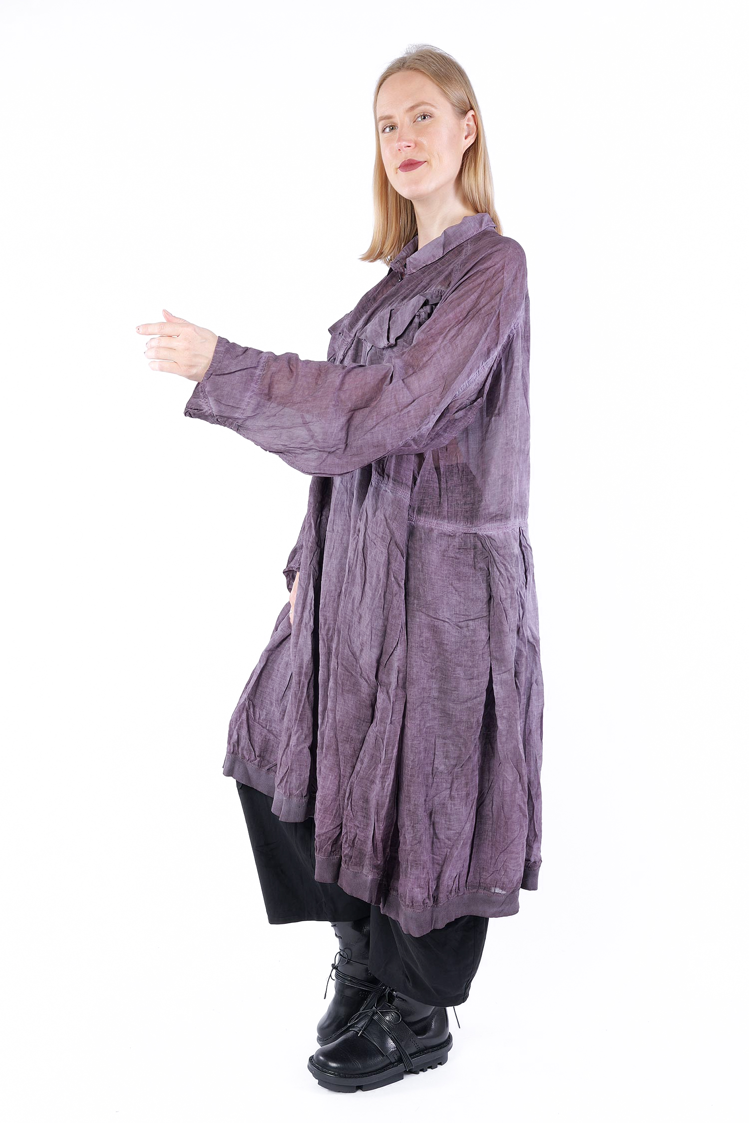 Details: - Skirt-part with pleats - Tulip-shaped cut on sleeves - Collar - Hem with rib jersey - Large breast pockets with envelope-look and button - Button tape at the front - Raglan sleeves - Semi-transparent - Sleeves with cut and button (envelope-look)