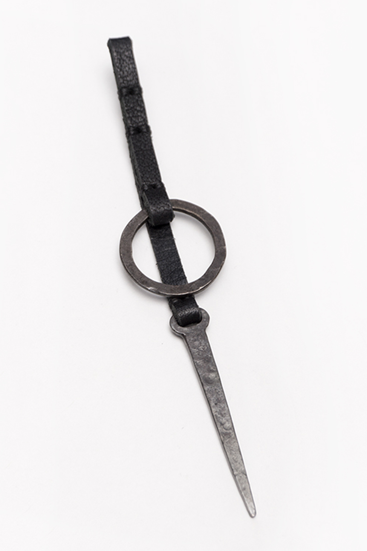 - Long leather string with silver tip and a leather string with silver circle in front of it