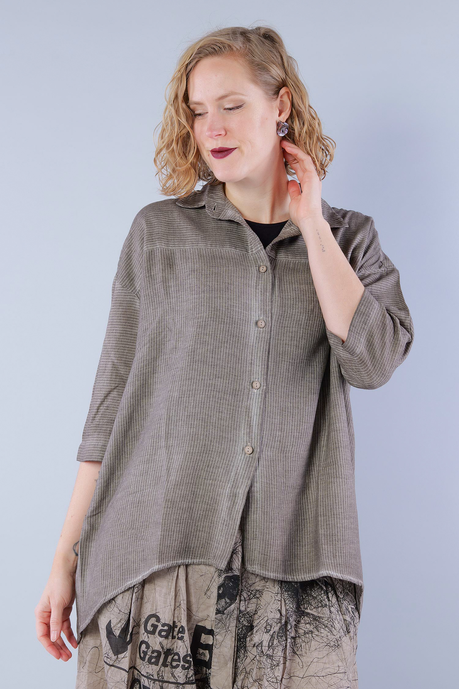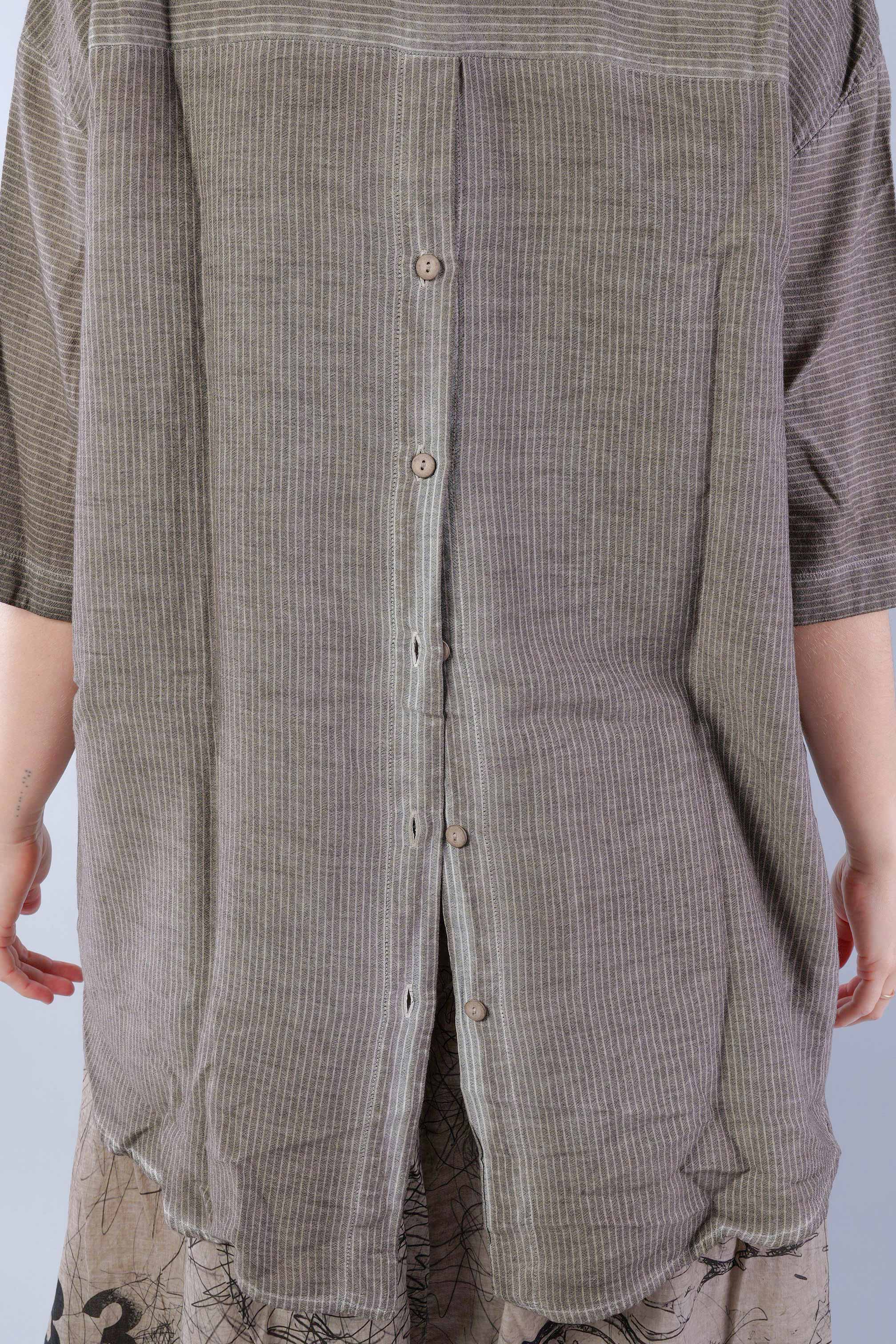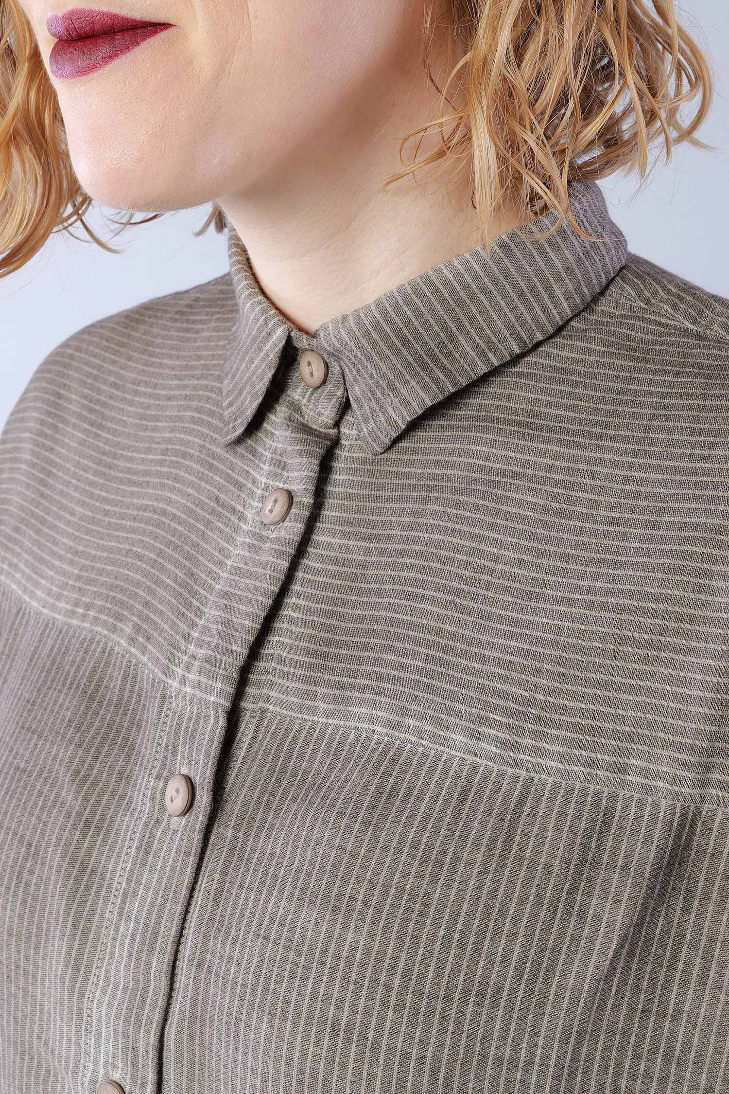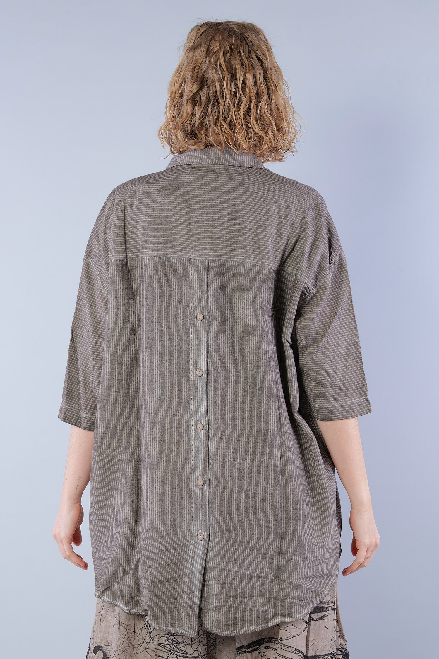 Details: - Soft and light cotton-viscose fabric - Button tape at the front - Button tape / cut at the back - Rounded-off hem - Trimmed edges - Collar - Fine stripes, used look - Elaborate old dye coloring - ¾ length sleeves