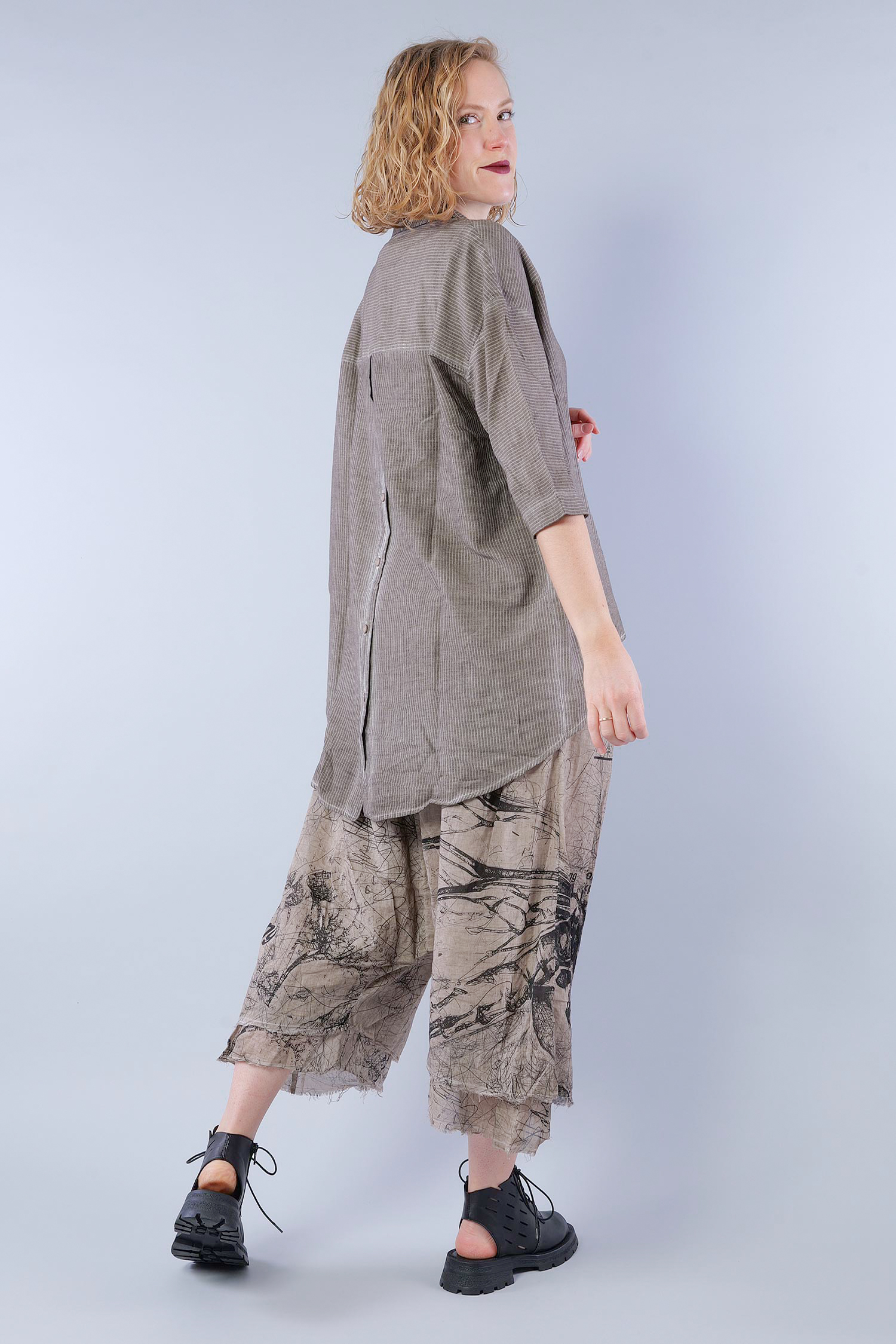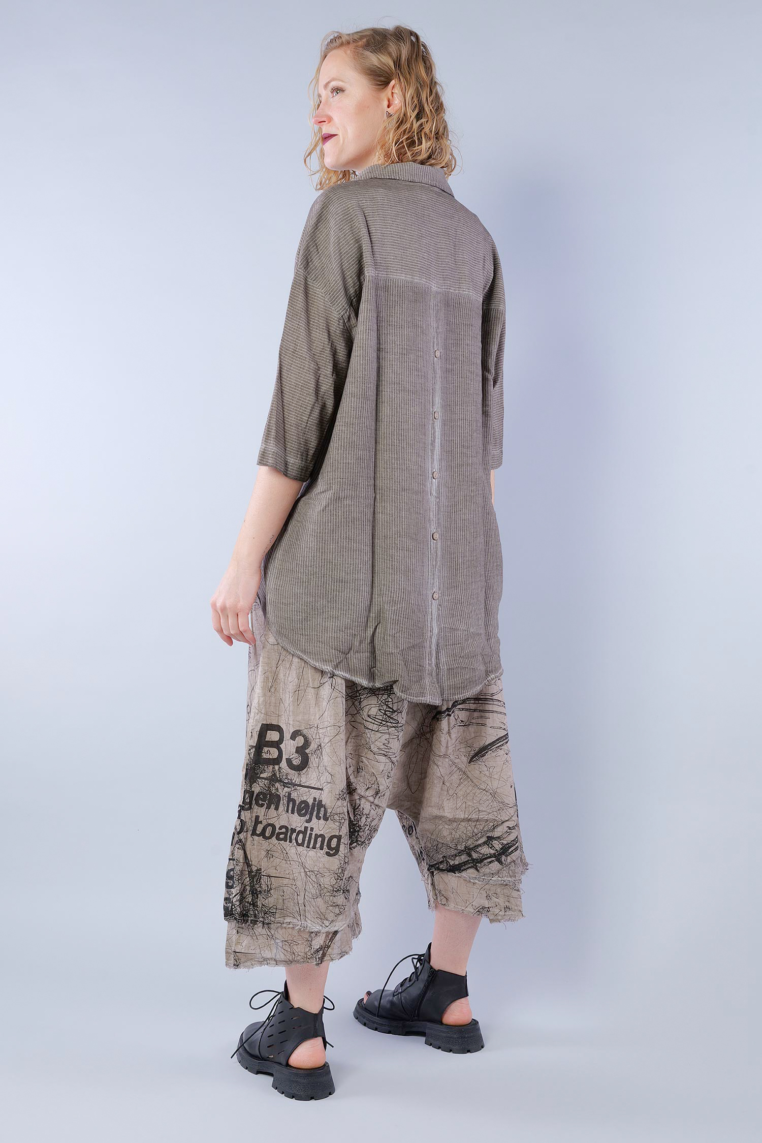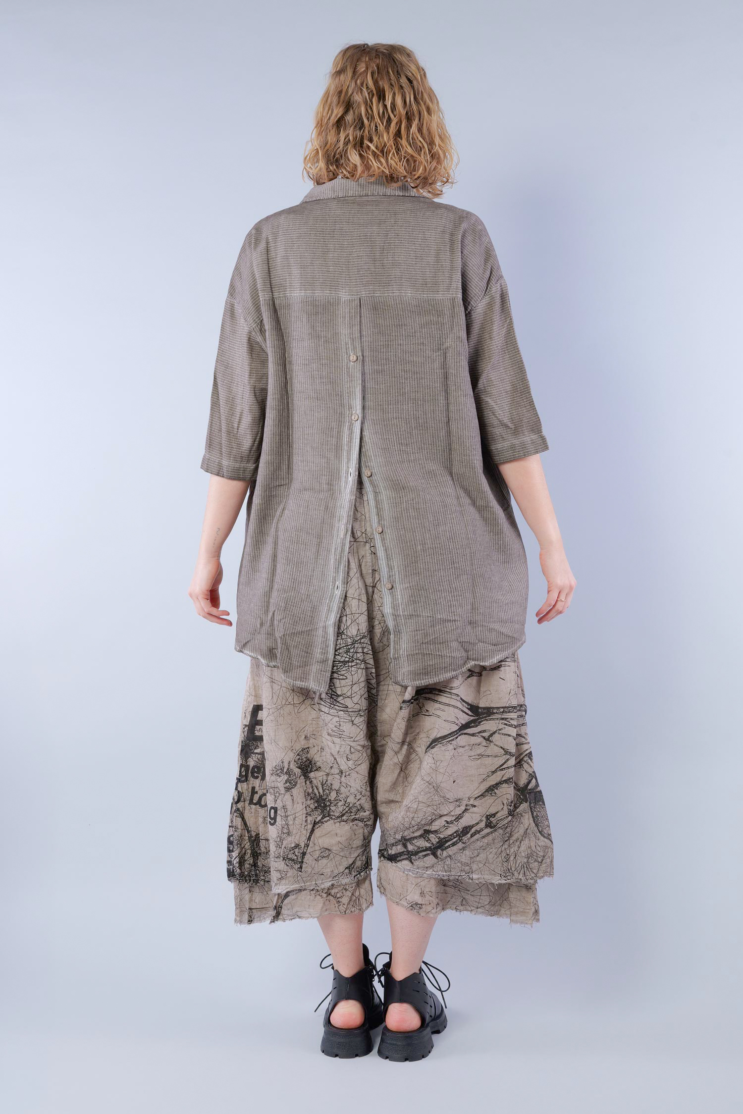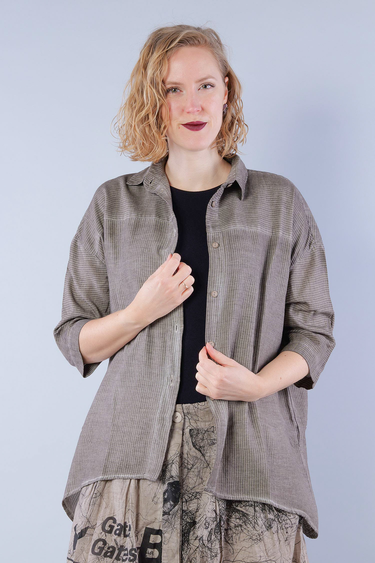 Details: - Soft and light cotton-viscose fabric - Button tape at the front - Button tape / cut at the back - Rounded-off hem - Trimmed edges - Collar - Fine stripes, used look - Elaborate old dye coloring - ¾ length sleeves