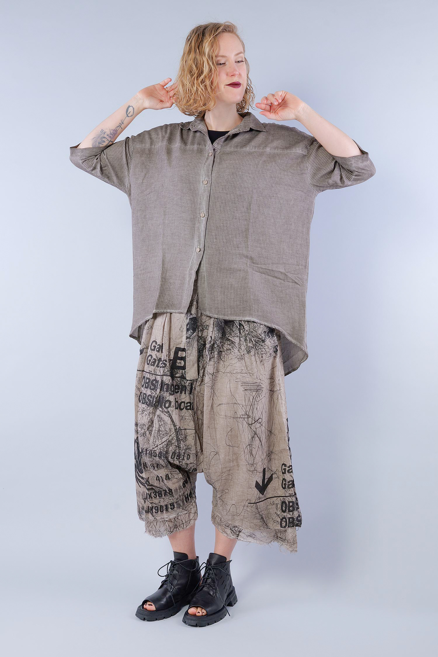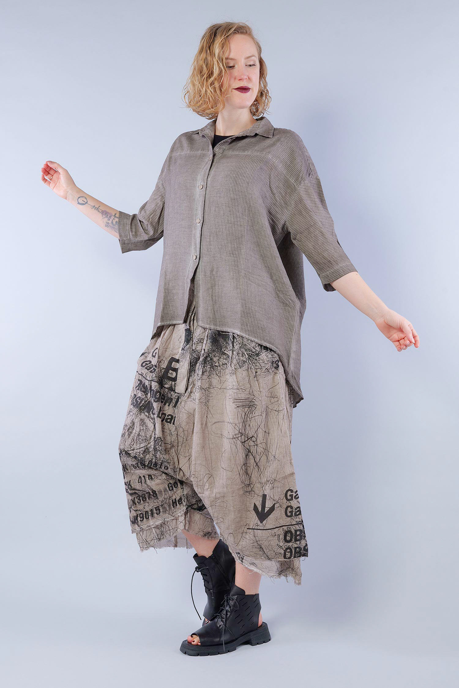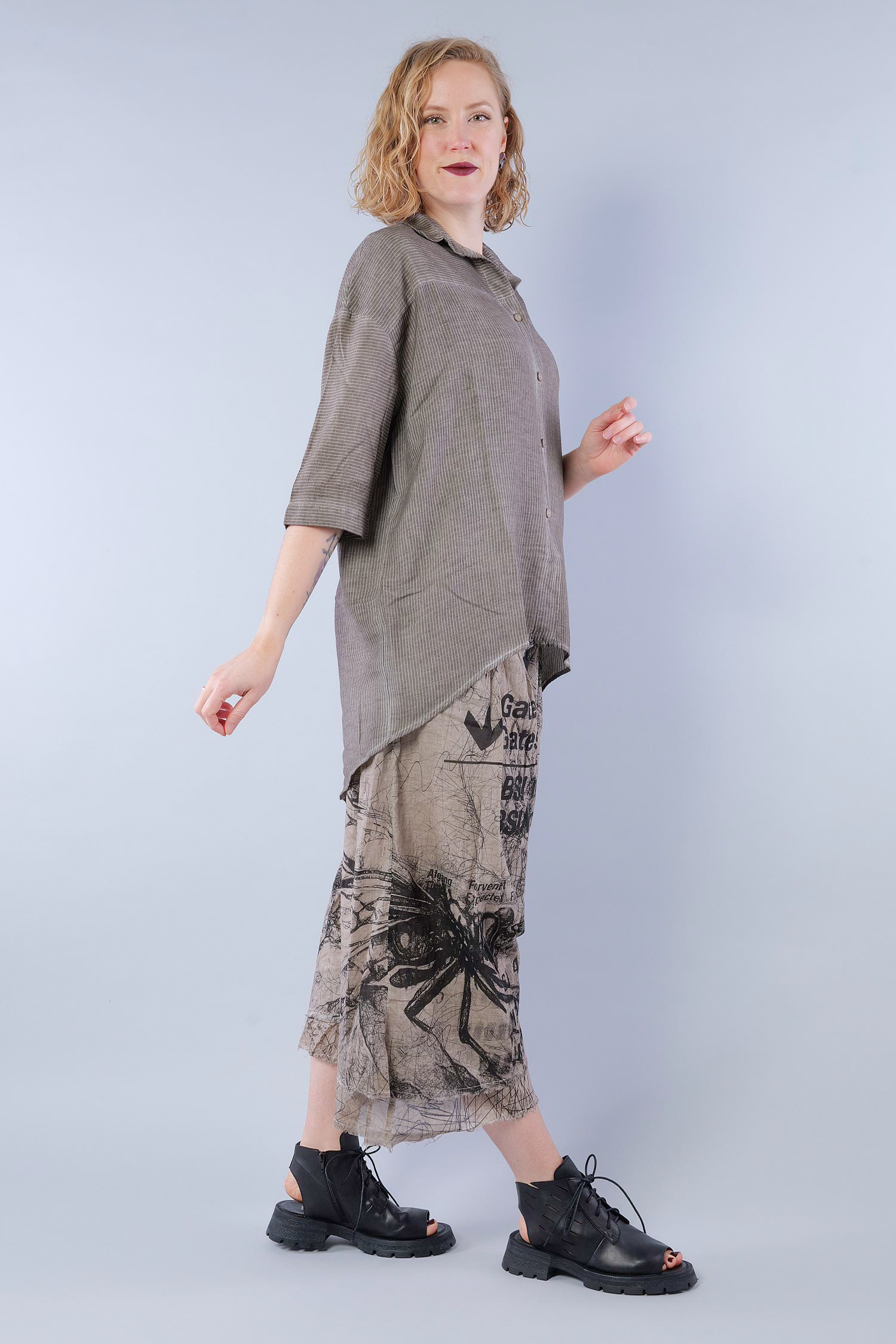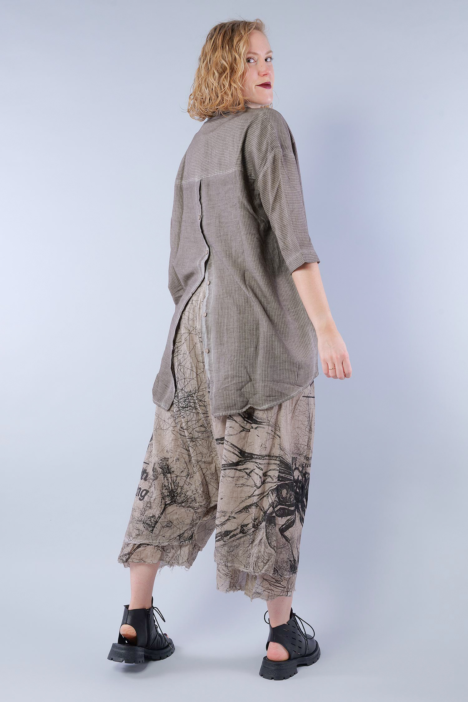 Details: - Soft and light cotton-viscose fabric - Button tape at the front - Button tape / cut at the back - Rounded-off hem - Trimmed edges - Collar - Fine stripes, used look - Elaborate old dye coloring - ¾ length sleeves