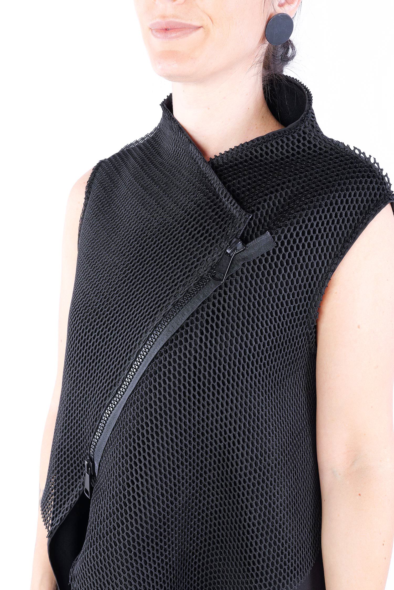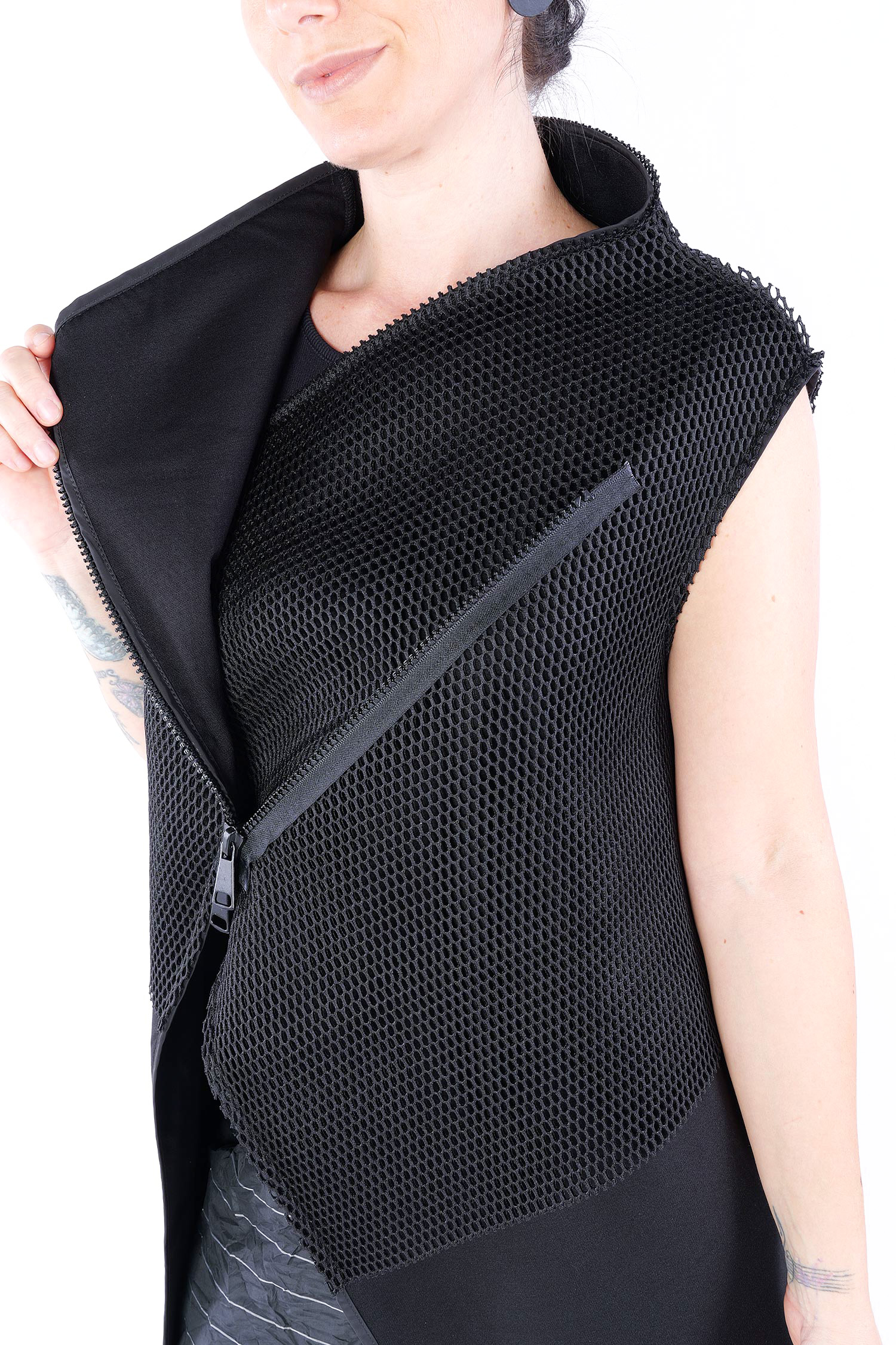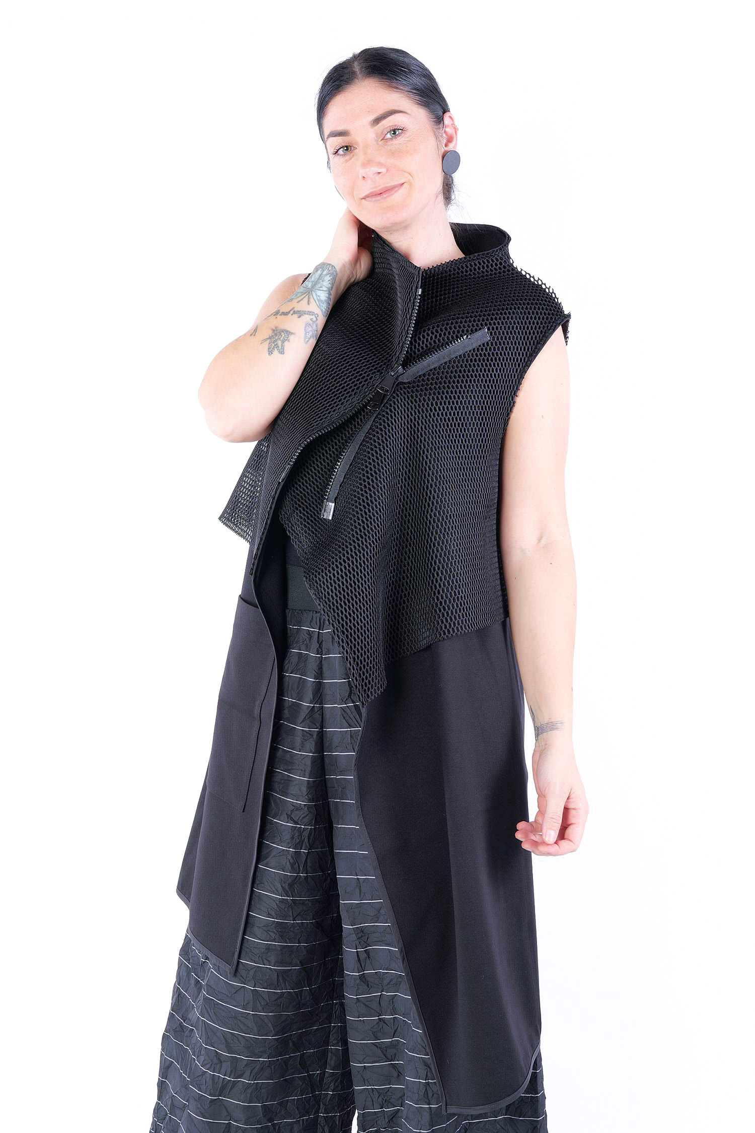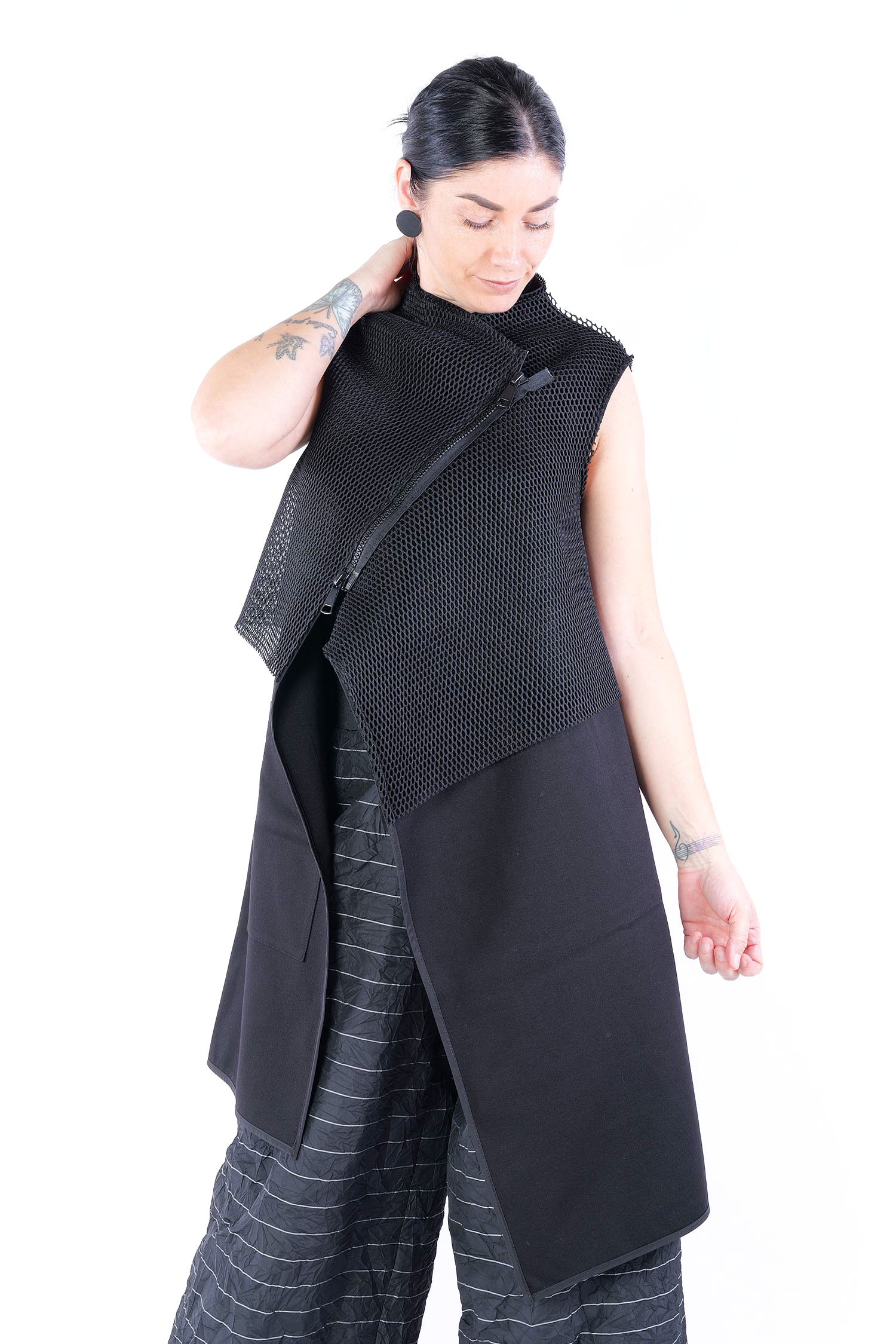 Details: - Thick two-way zipper - One attached pocket at the front - Asymmetrical cut - Fishnet over smooth sweat material - Slight A-line - Open edges on fishnet