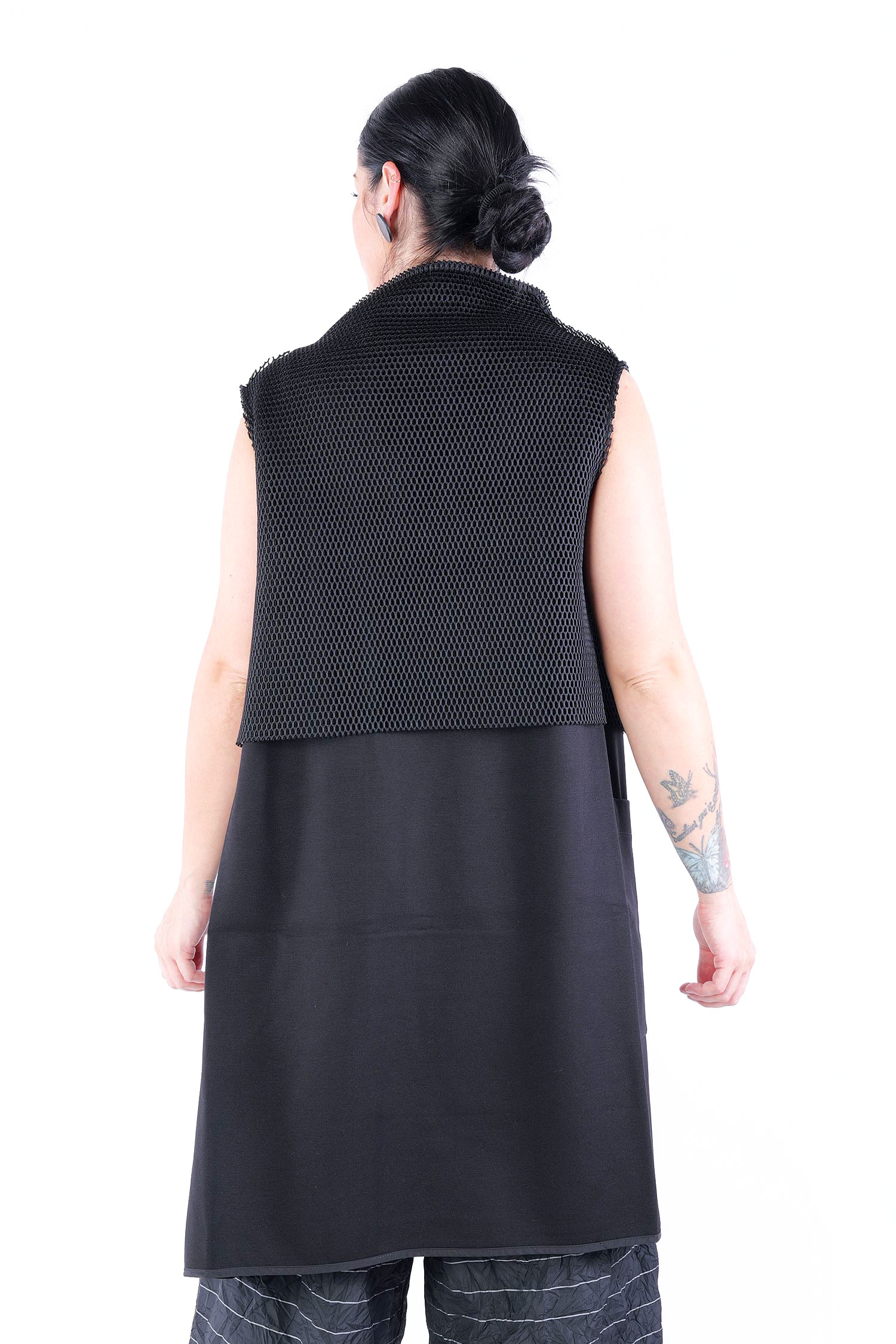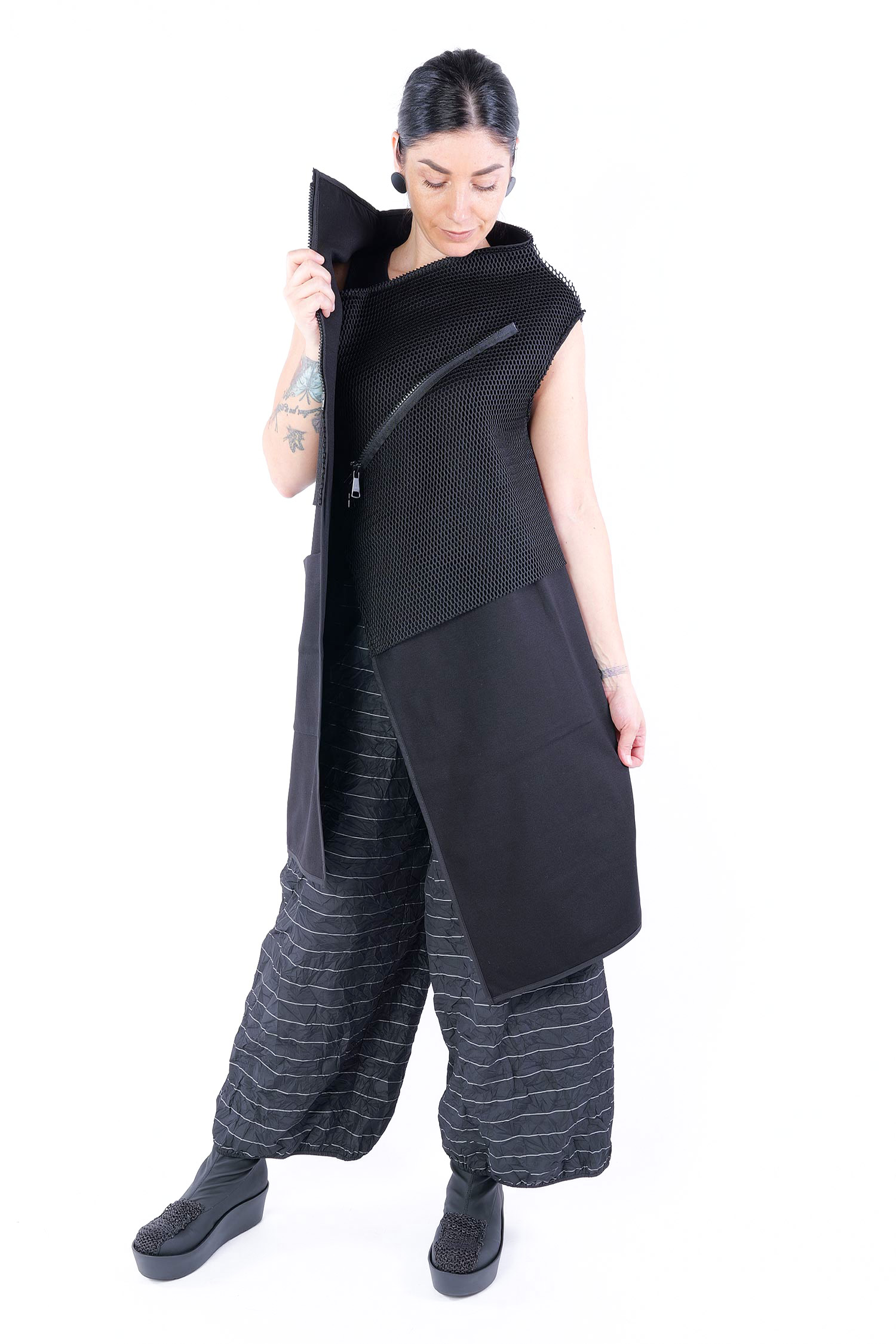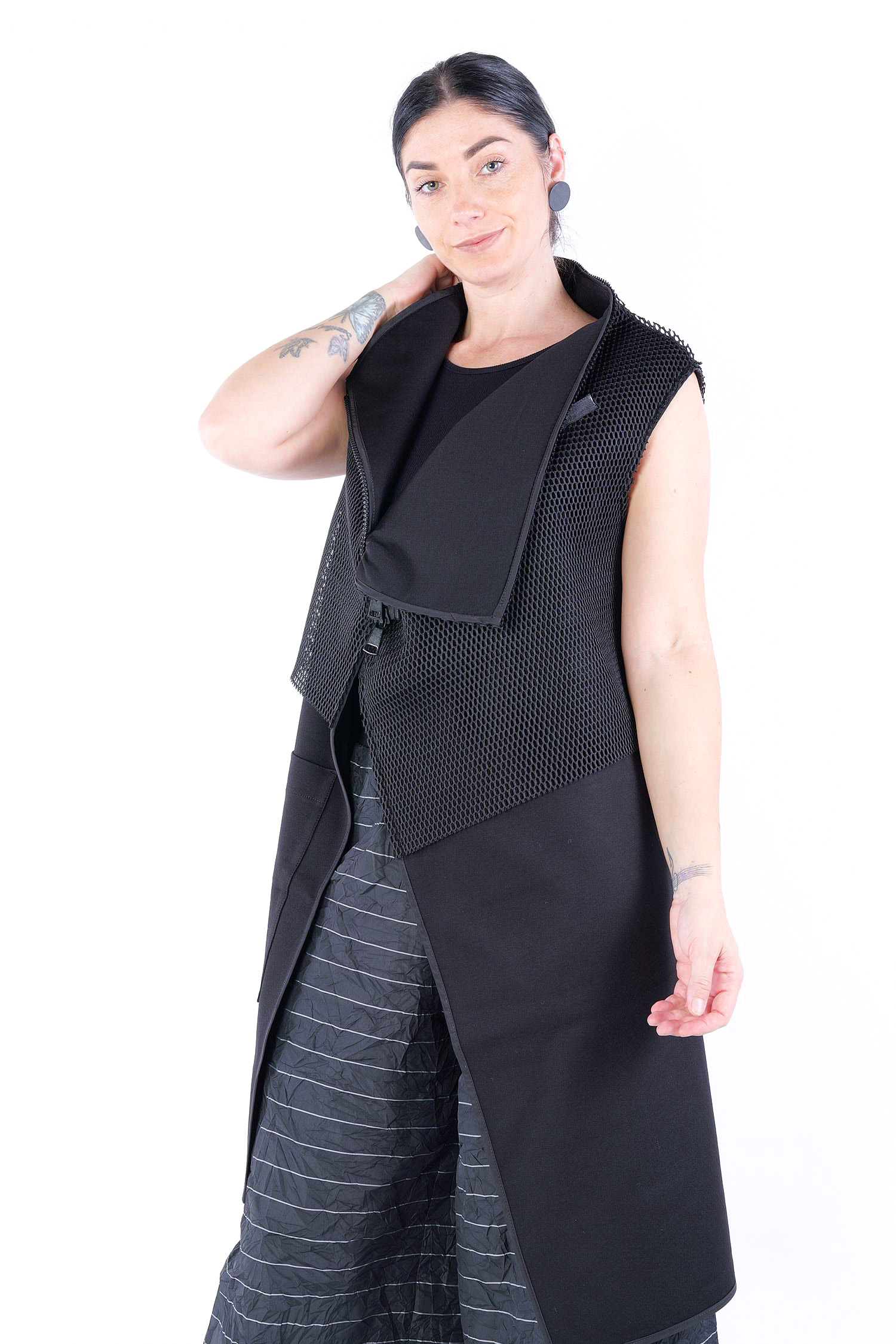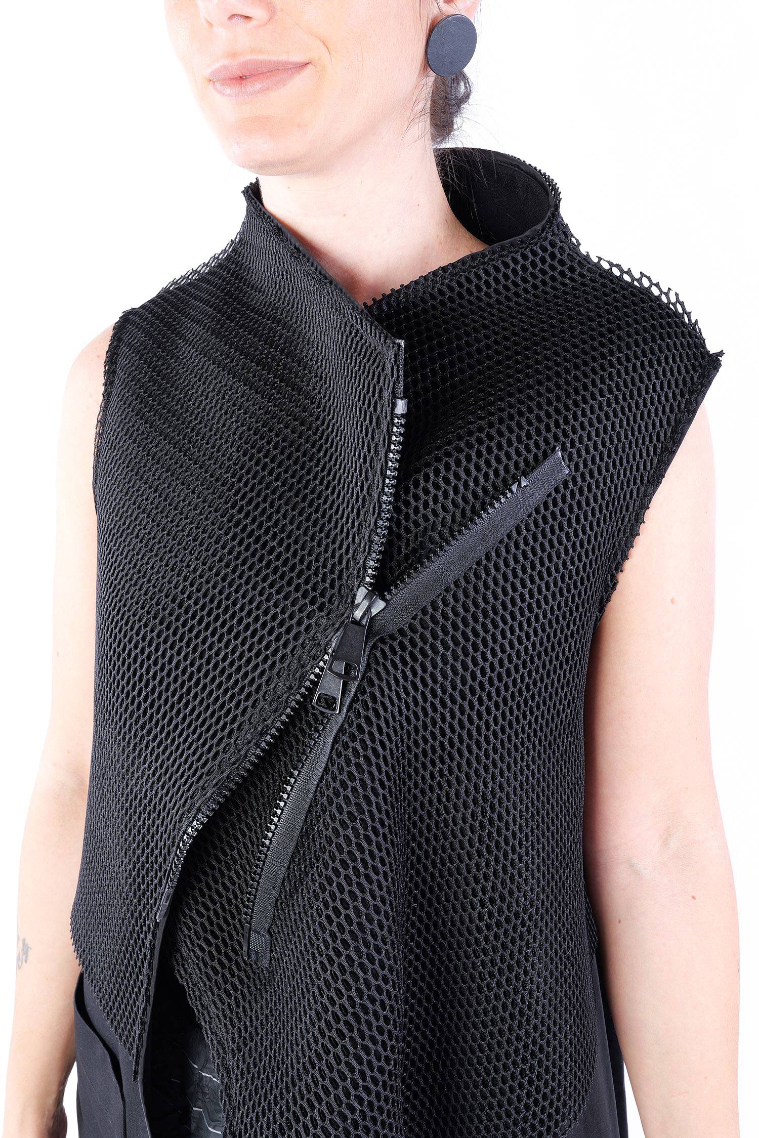 Details: - Thick two-way zipper - One attached pocket at the front - Asymmetrical cut - Fishnet over smooth sweat material - Slight A-line - Open edges on fishnet