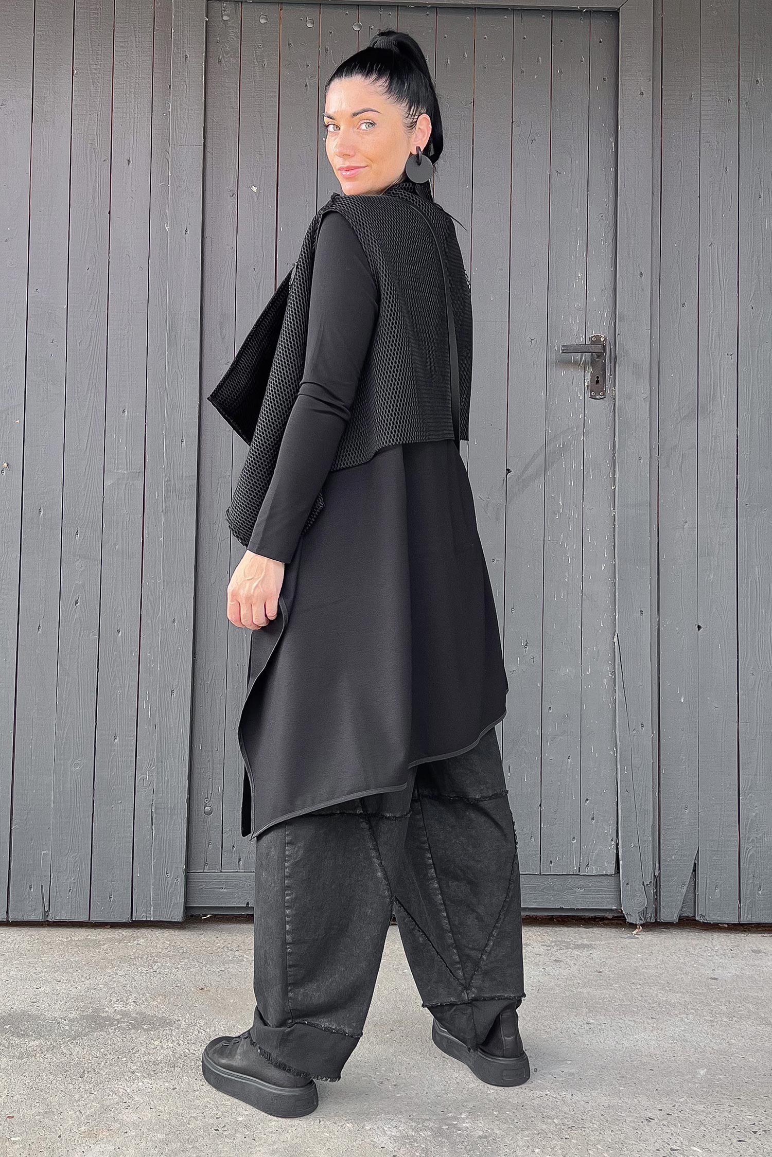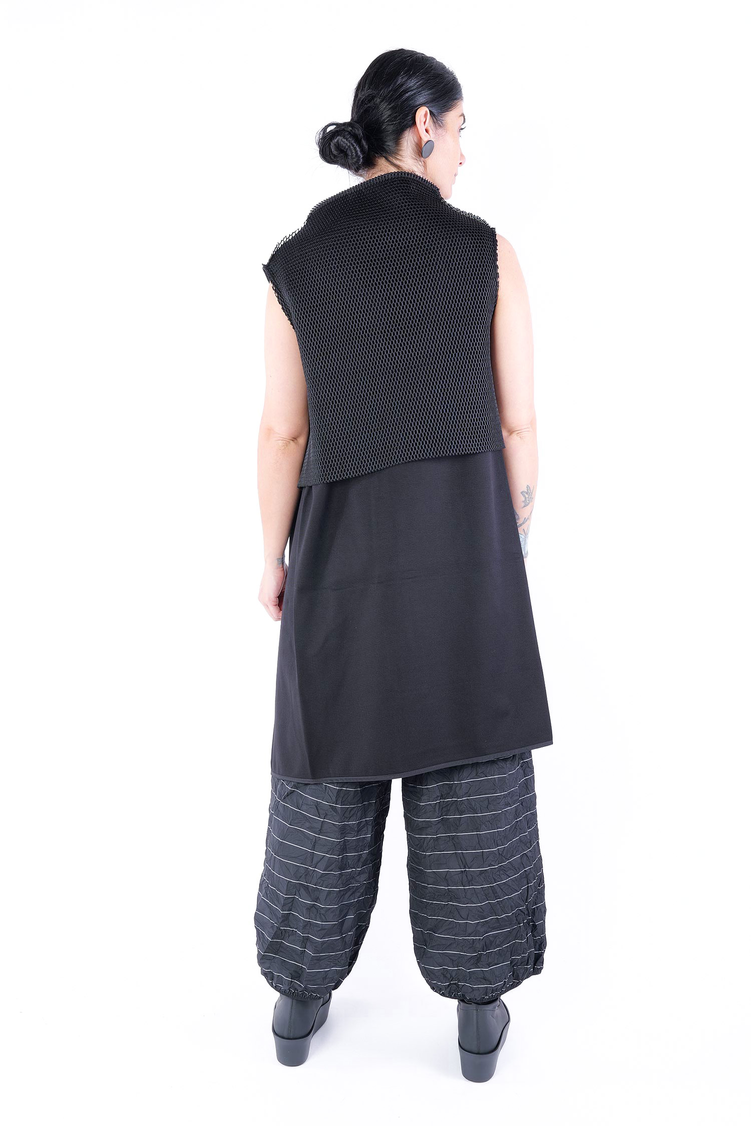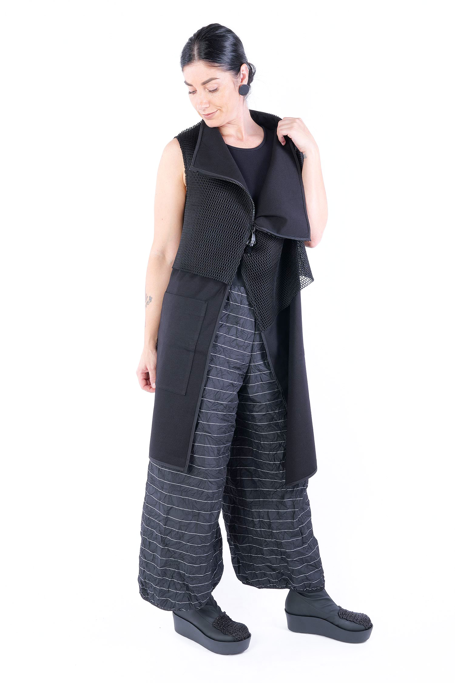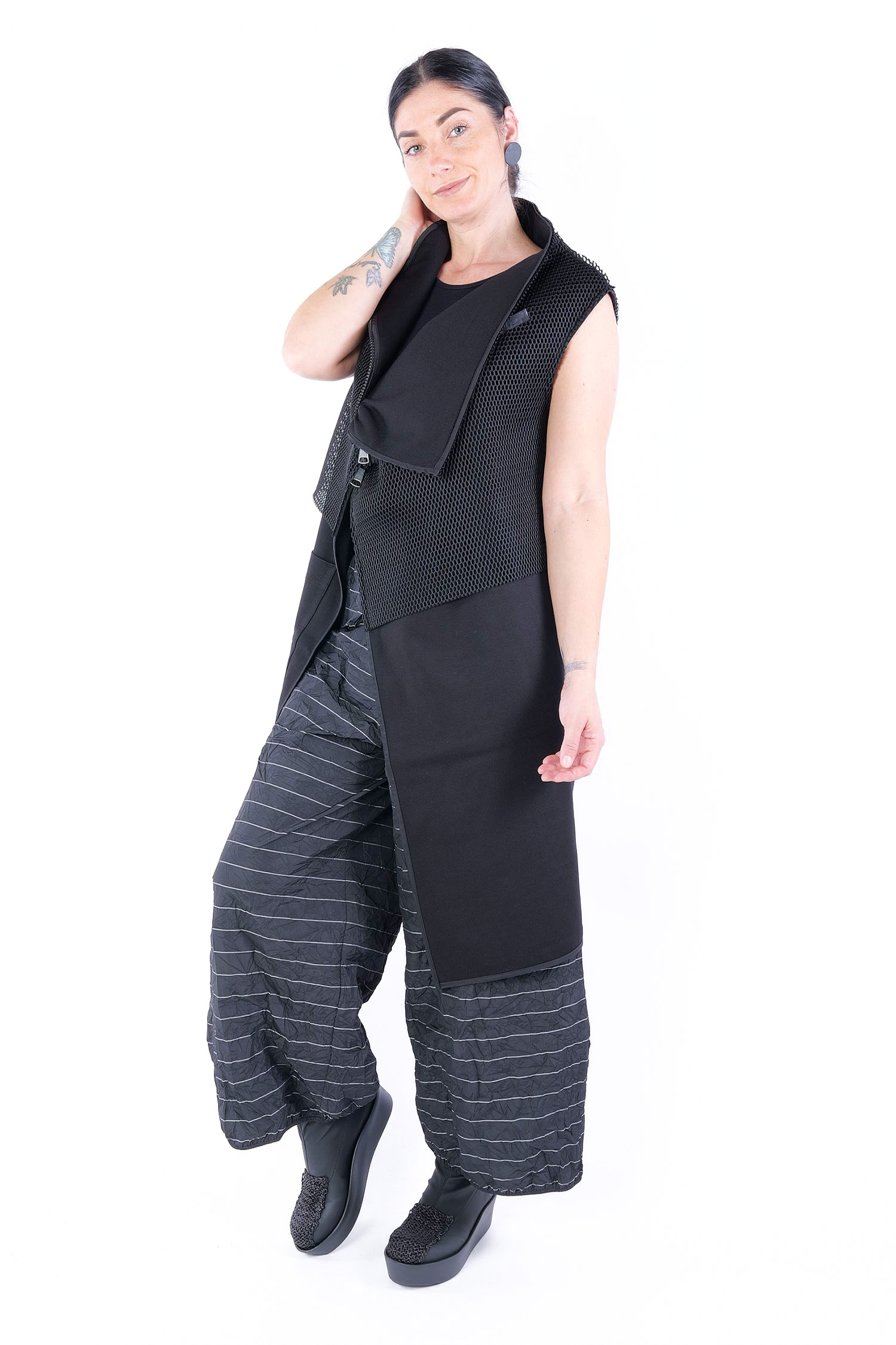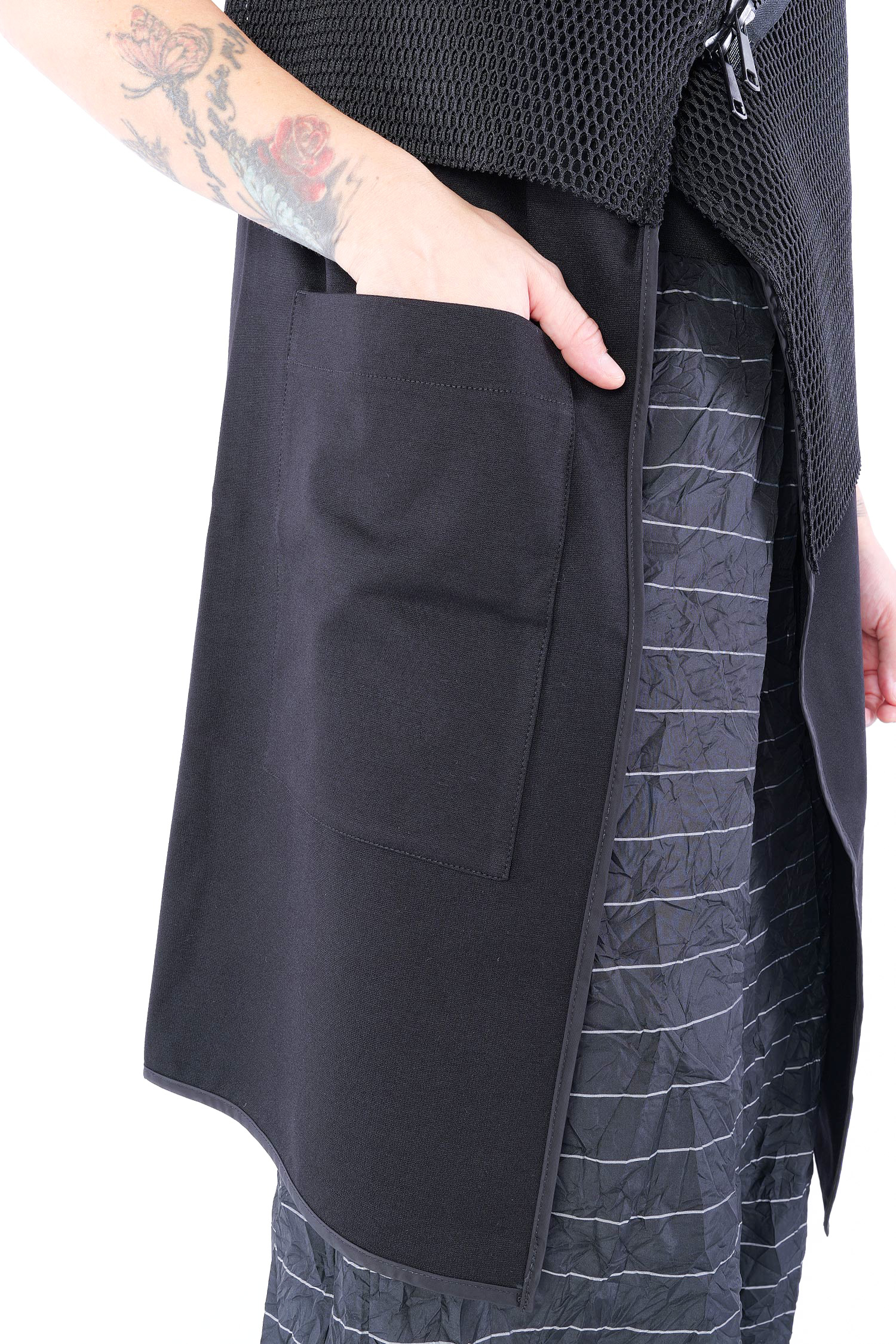 Details: - Thick two-way zipper - One attached pocket at the front - Asymmetrical cut - Fishnet over smooth sweat material - Slight A-line - Open edges on fishnet