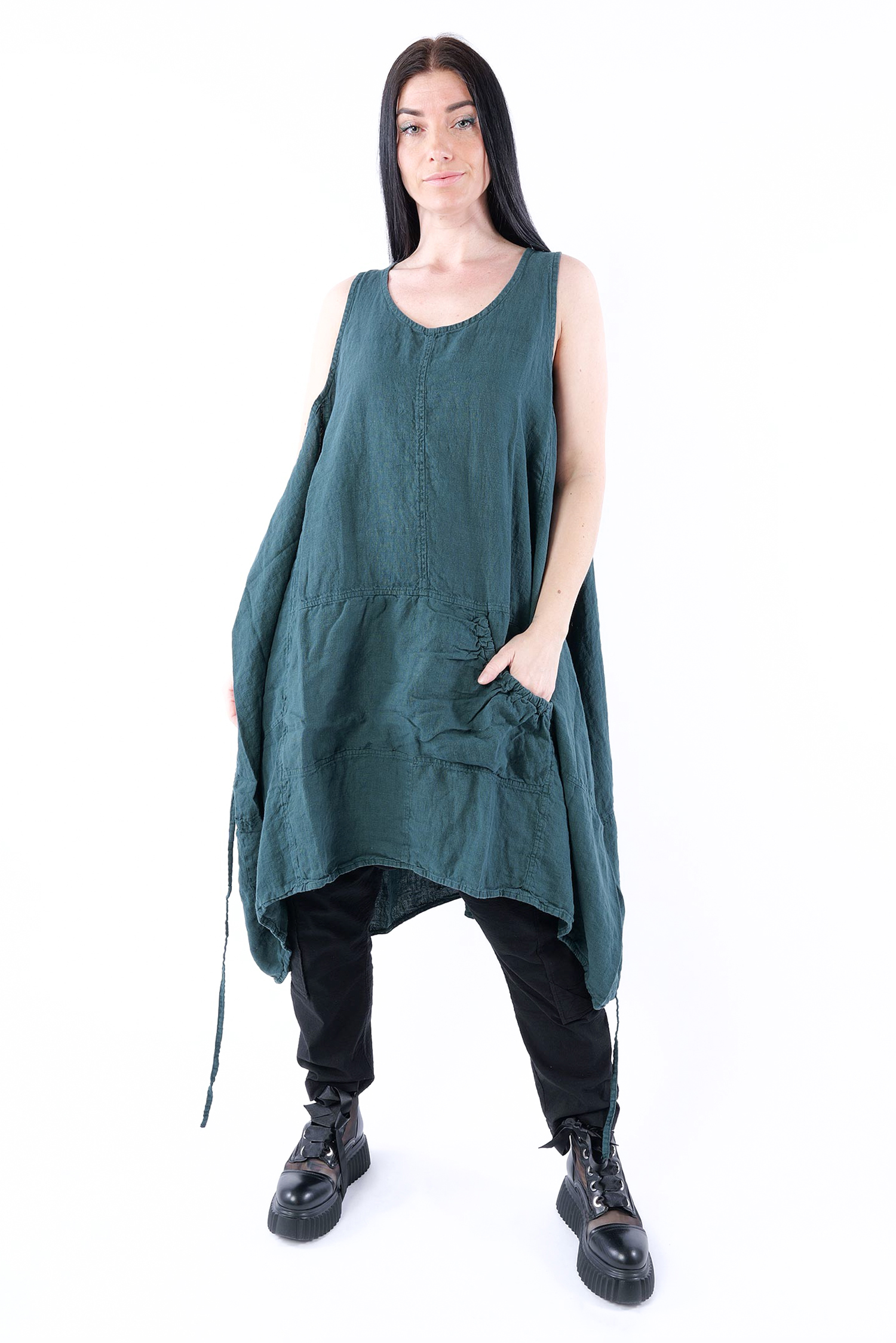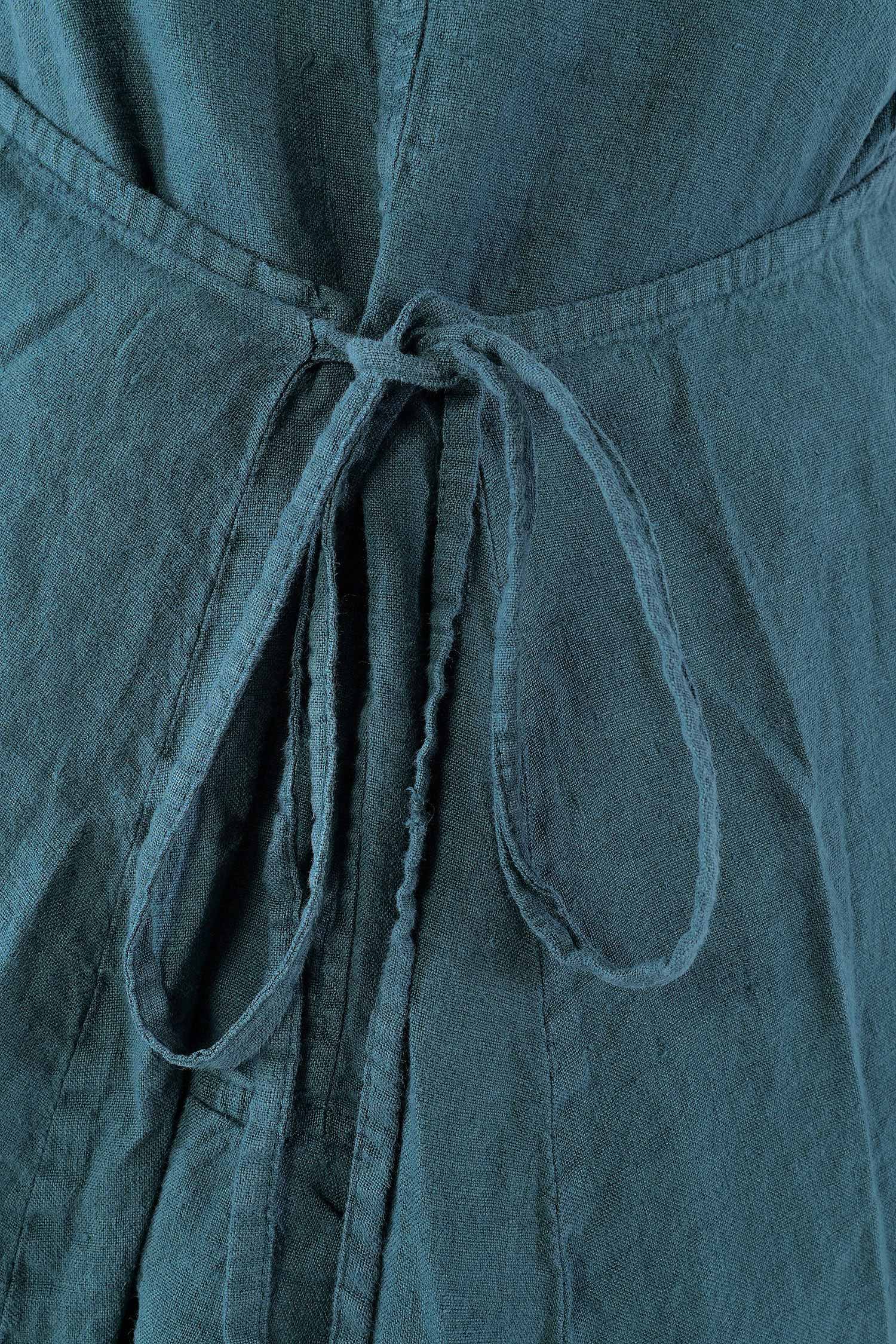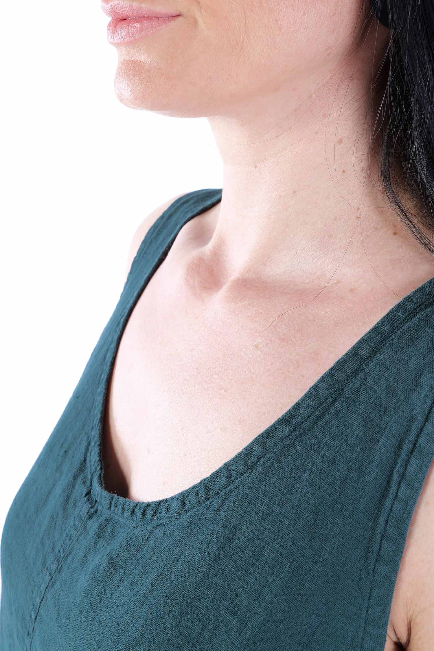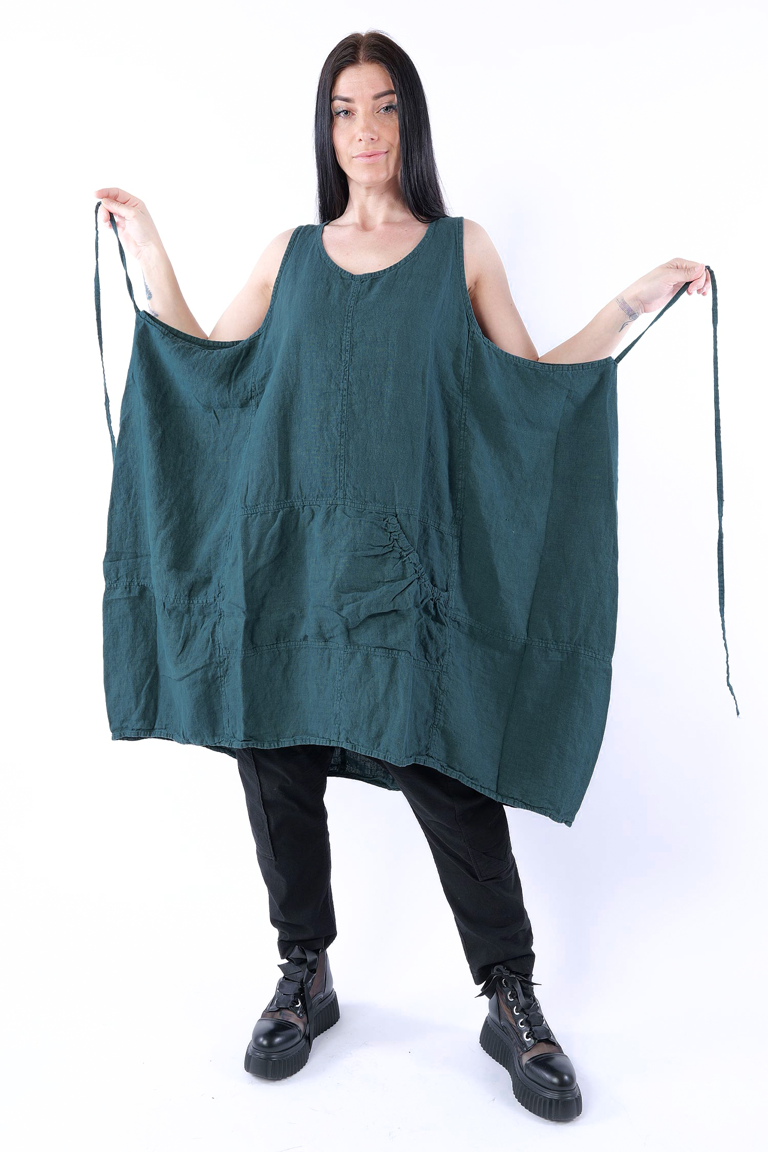 Details: - Linen - Low armhole - Strings to adjust width - Round neck - Front pocket with gathered material - Trimmed edges - Decorative seams - Wide straps - Slightly longer at the side