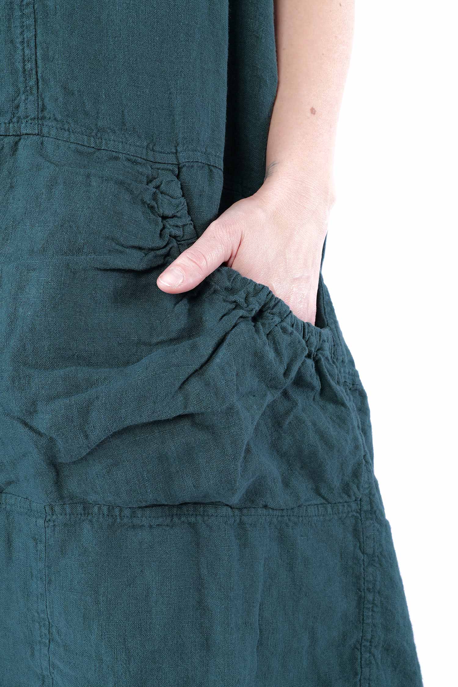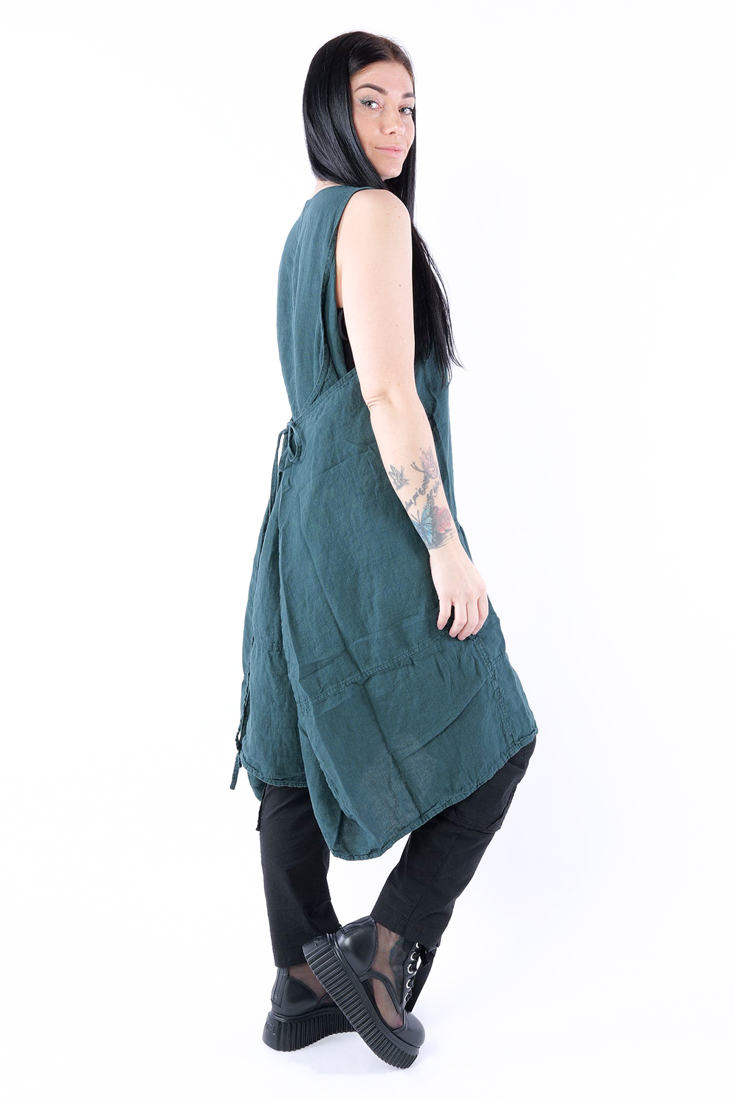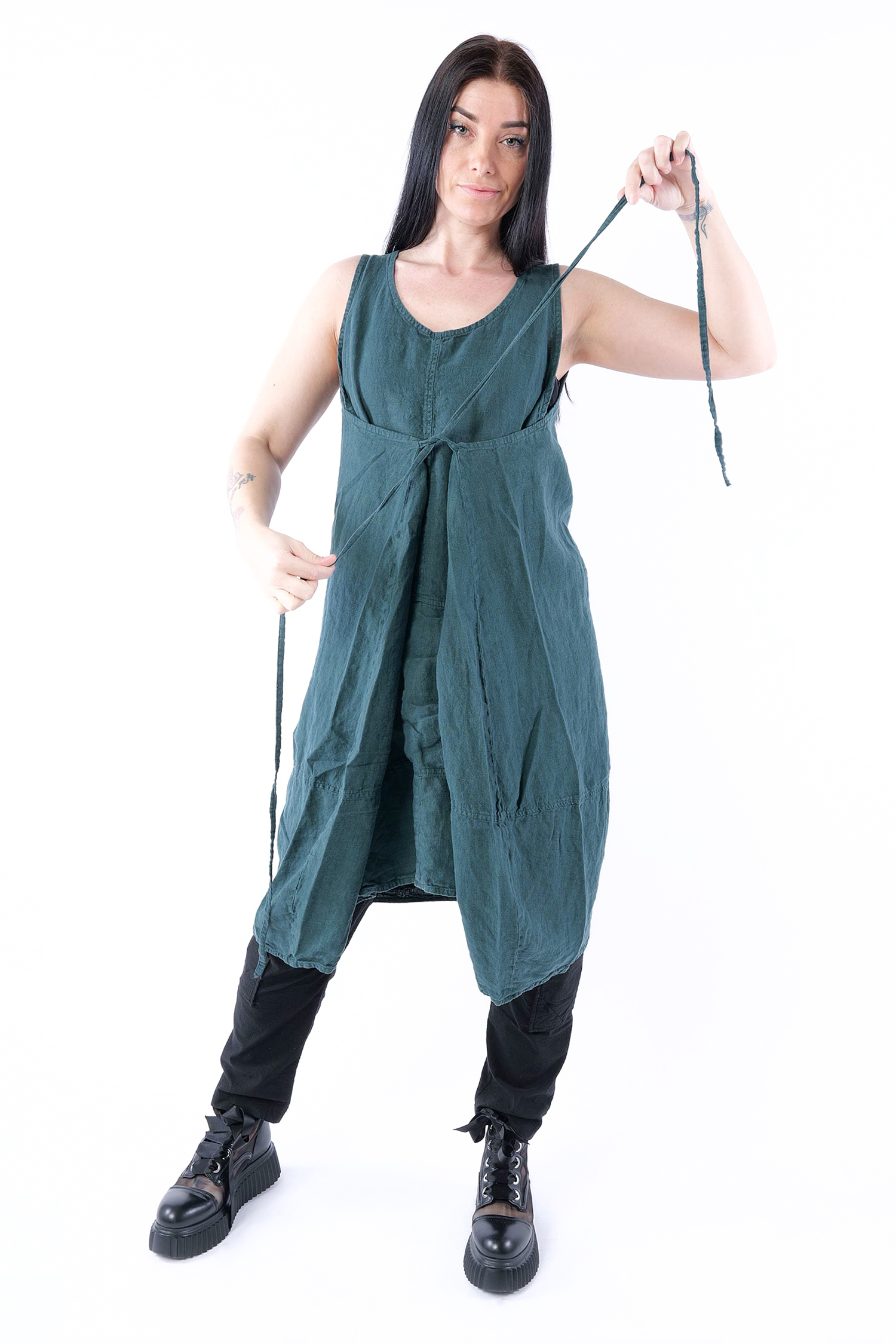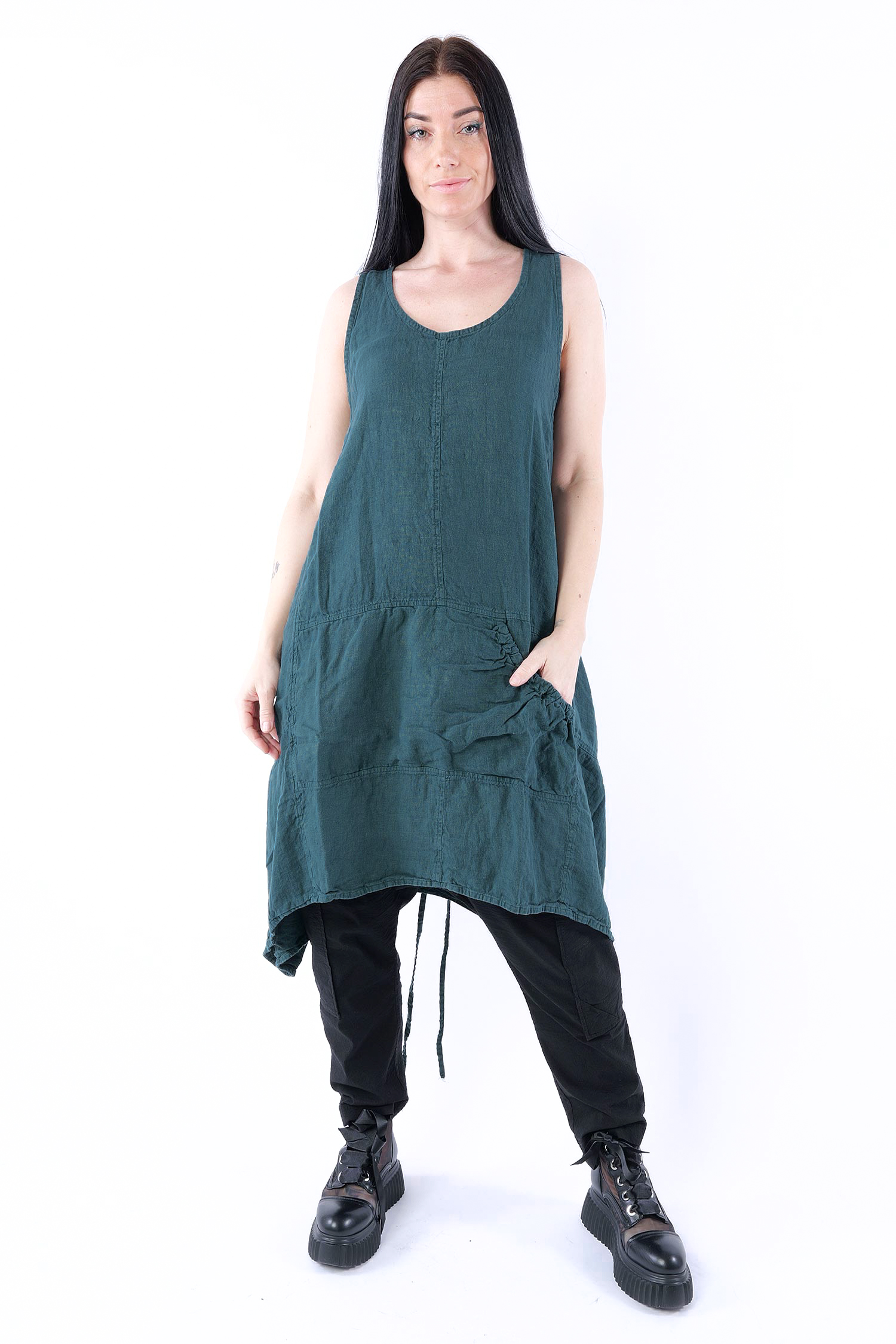 Details: - Linen - Low armhole - Strings to adjust width - Round neck - Front pocket with gathered material - Trimmed edges - Decorative seams - Wide straps - Slightly longer at the side