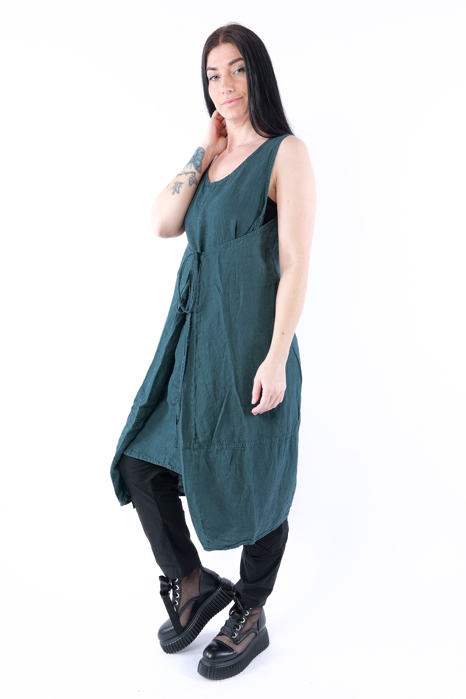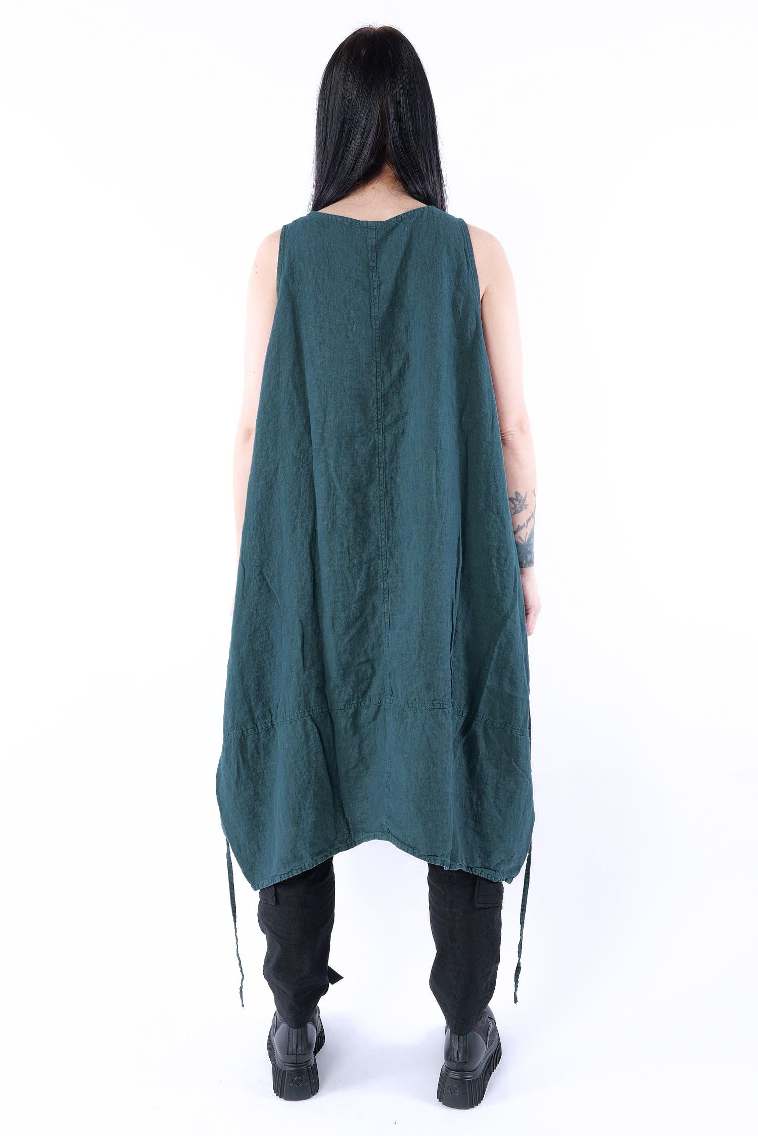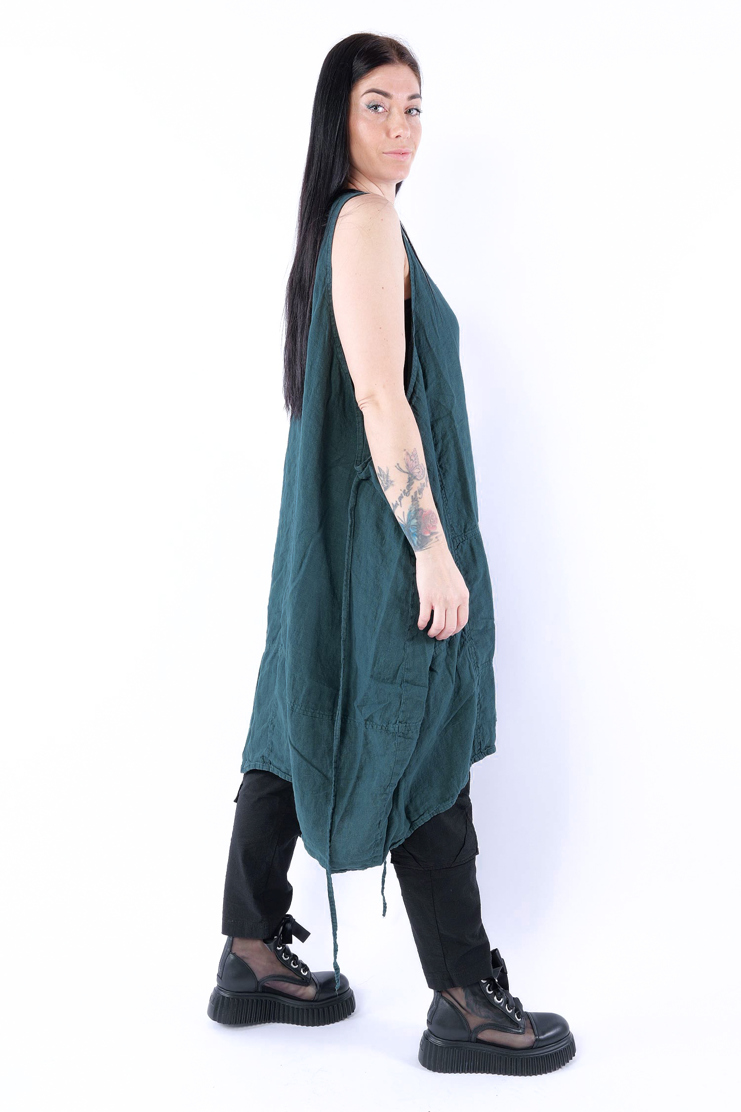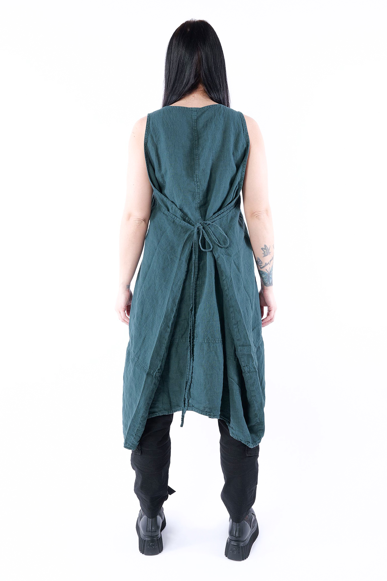 Details: - Linen - Low armhole - Strings to adjust width - Round neck - Front pocket with gathered material - Trimmed edges - Decorative seams - Wide straps - Slightly longer at the side
