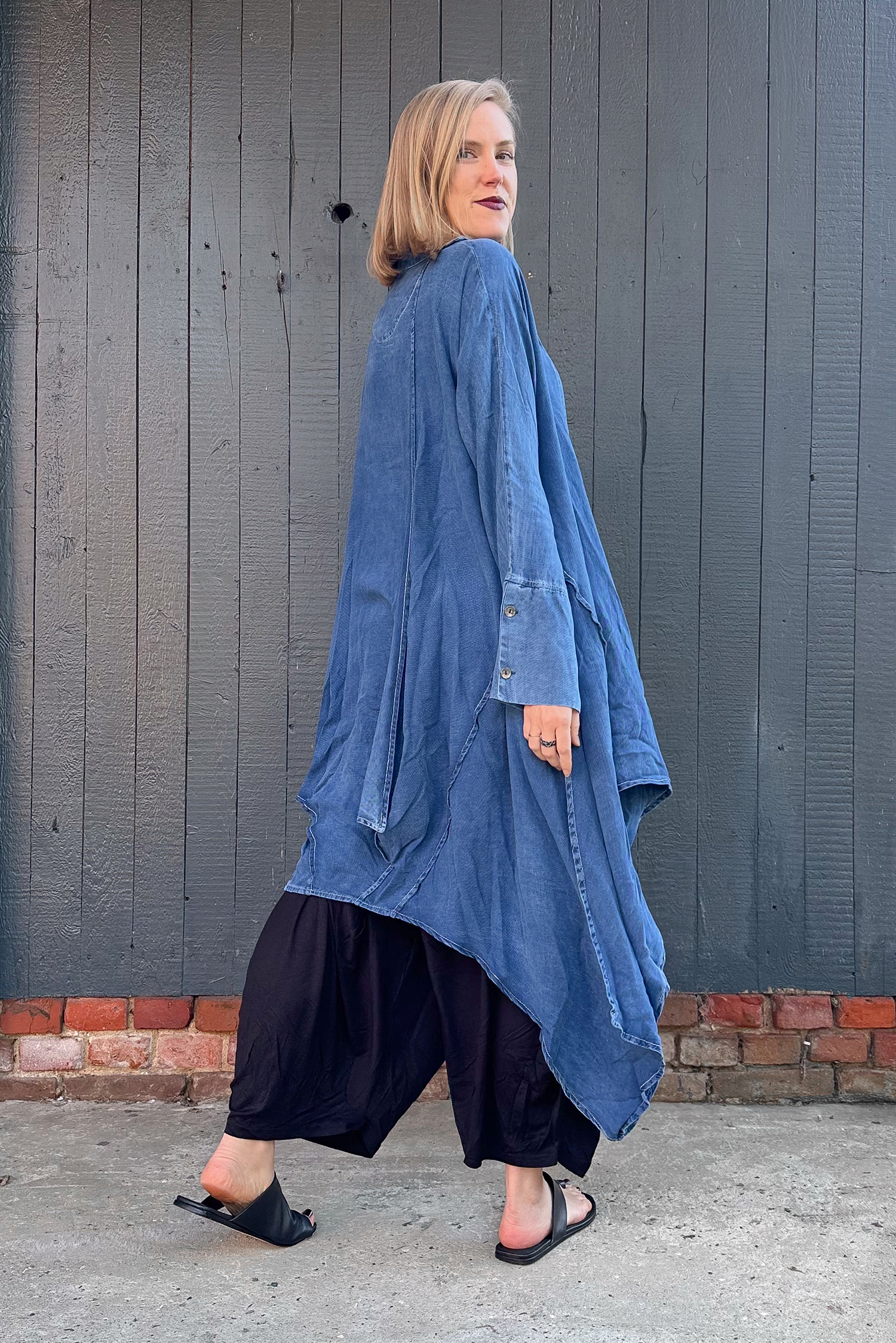 Details: - Soft Tencel material with denim-look - Concealed button tape - A-line - Side pockets - Long sleeves with button and cut - Uneven with a lot of volume at the front and back - Longer sides - Trimmed edges - Collar