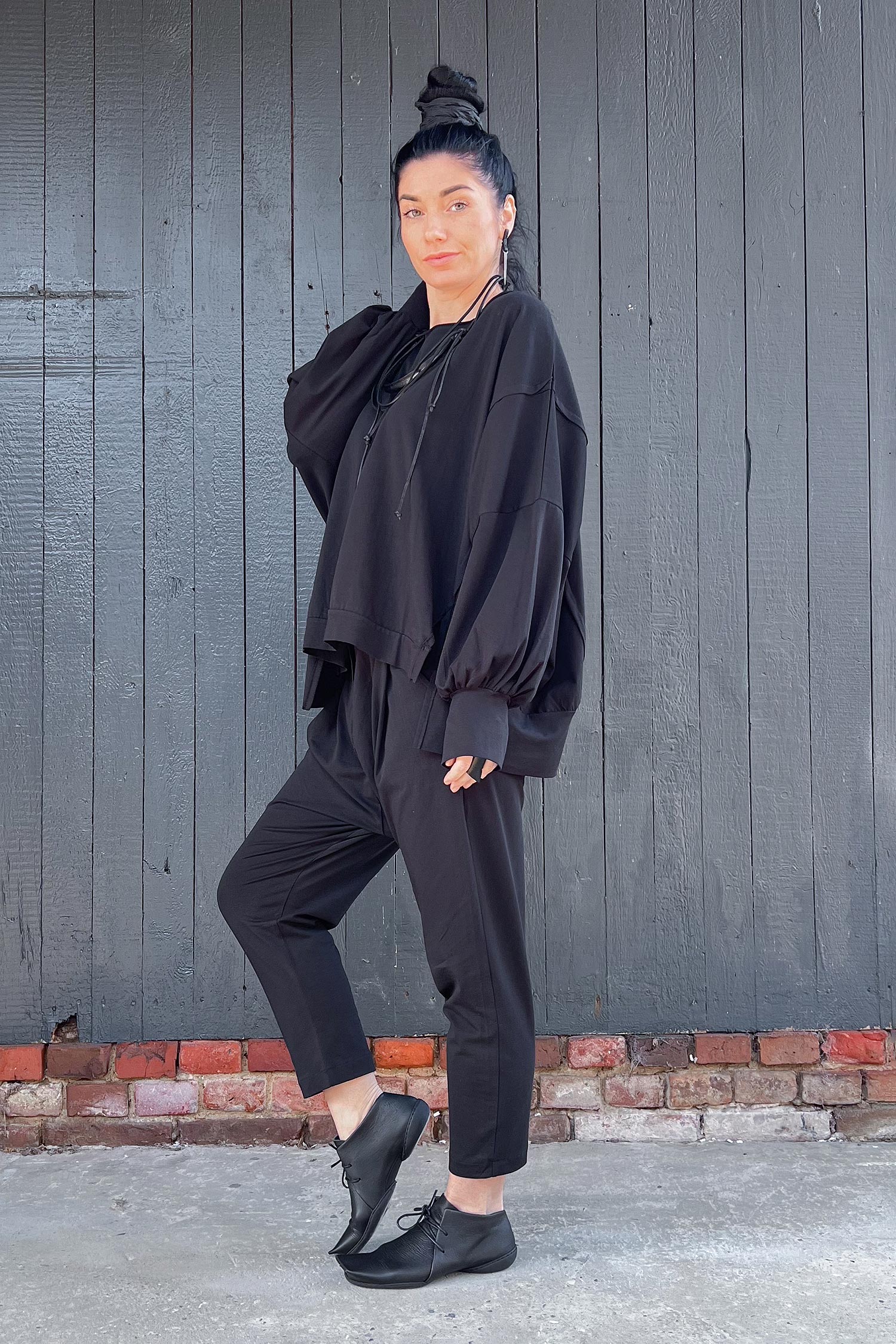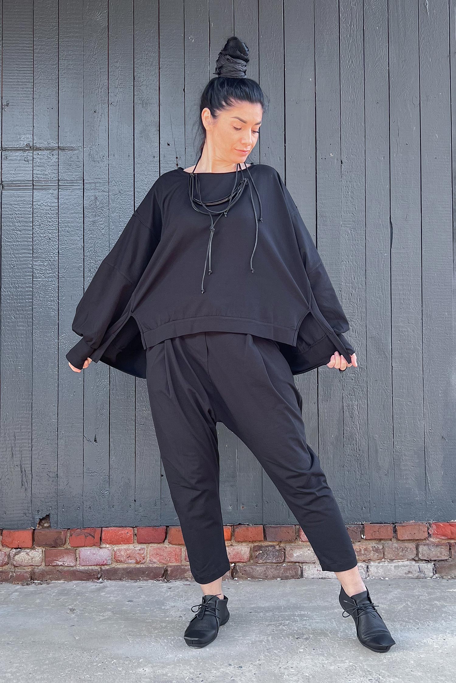 Details: - Round neck - Partly open edges - Cuts at the front side - Square and loose - Extended shoulder - Long sleeves with cuff and cut - Decorative seams - Longer at the back - T-shirt jersey