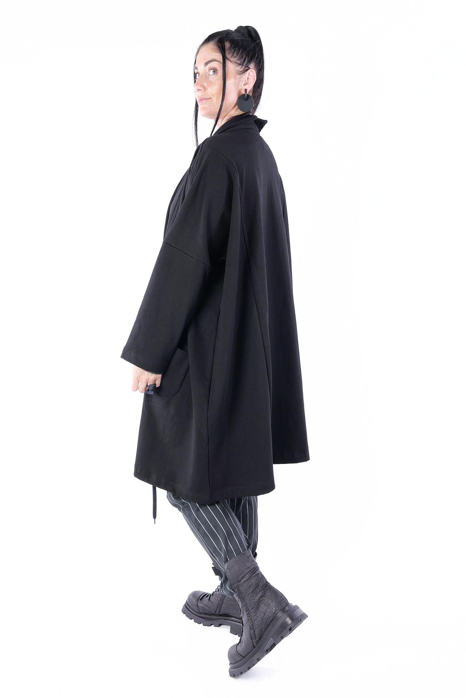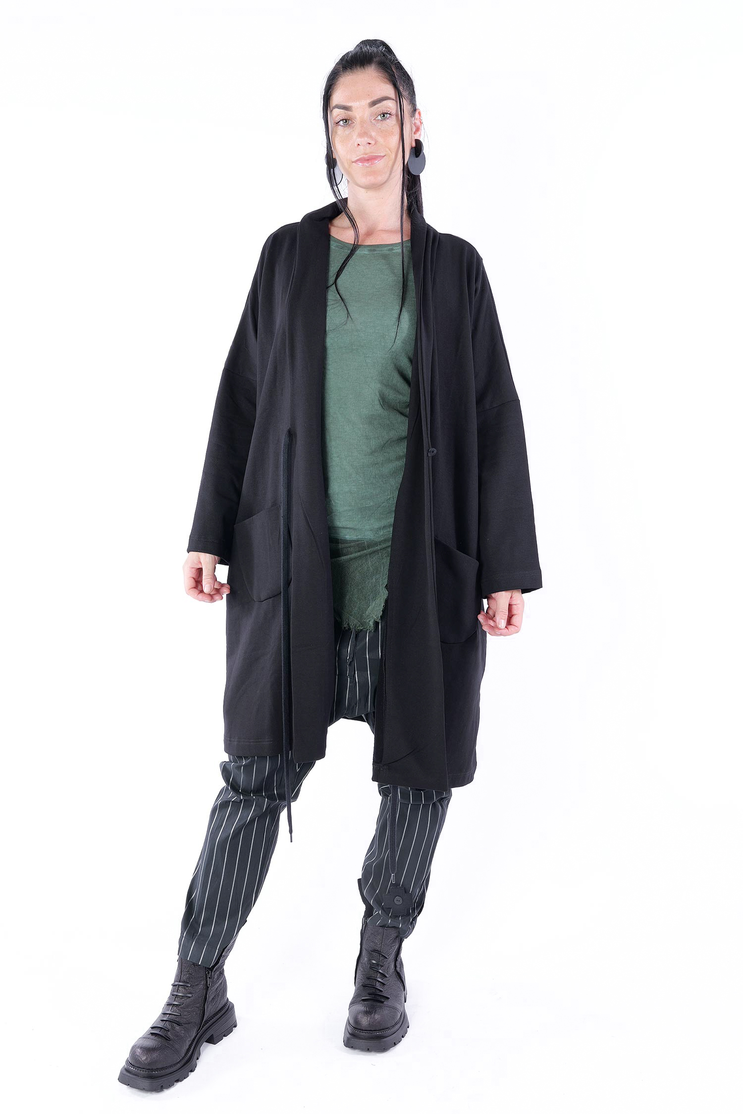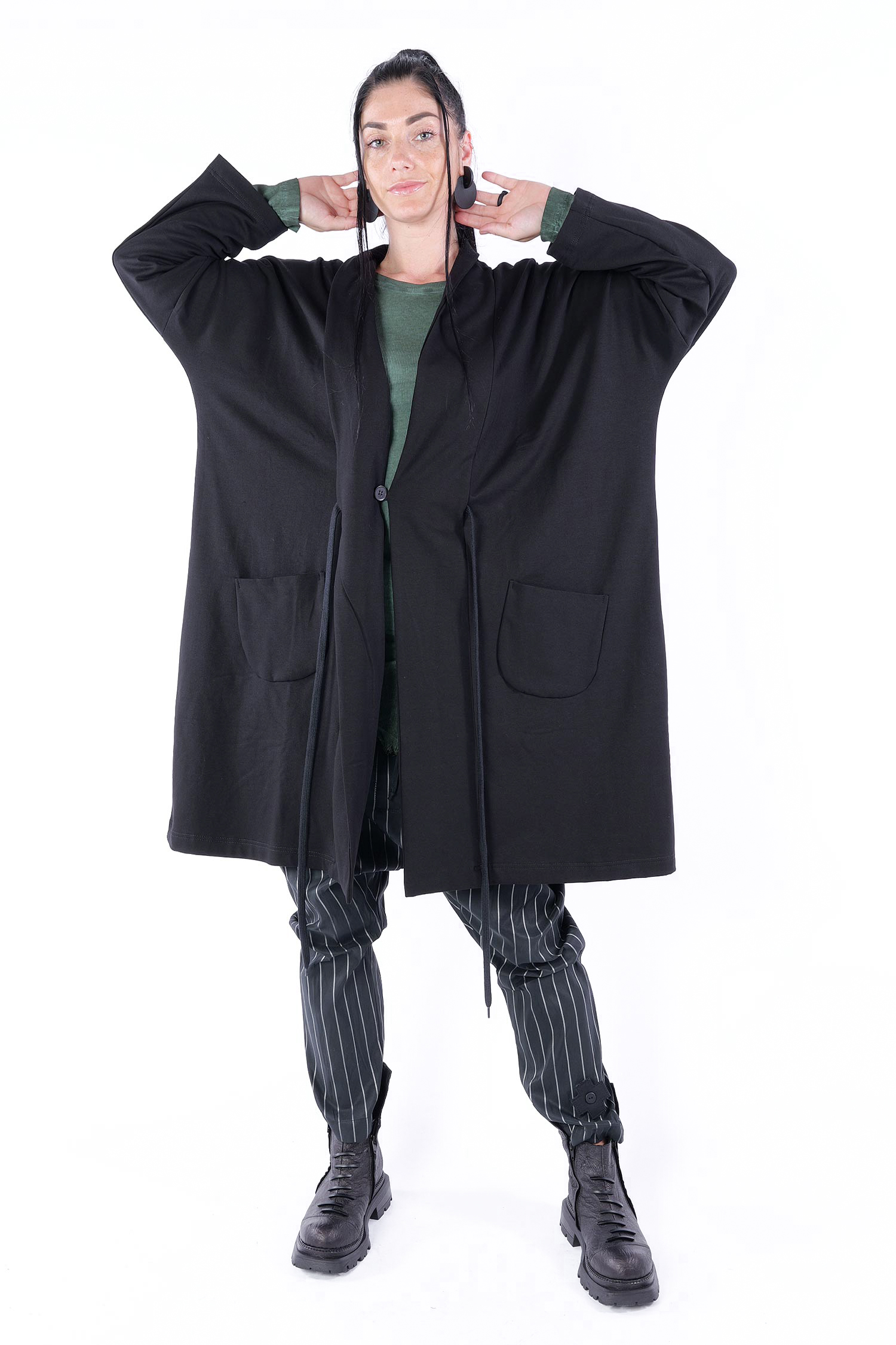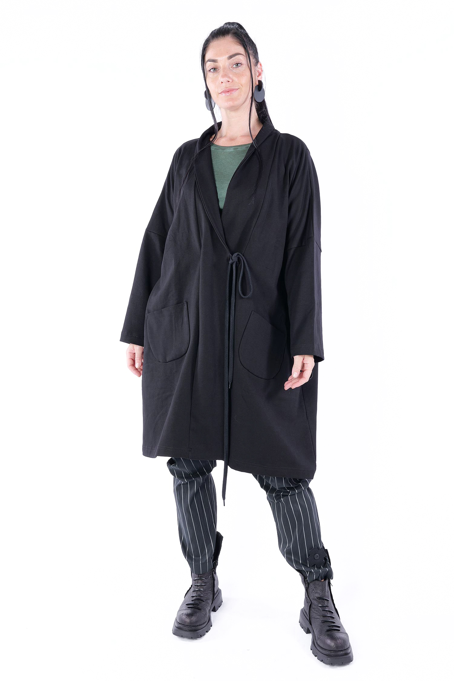 Details: - Thicker sweat material - Band to tie - Button with loop - Shawl collar with cut at the back - Extended shoulder - Long sleeves - Attached pockets at the front - Loose and square cut