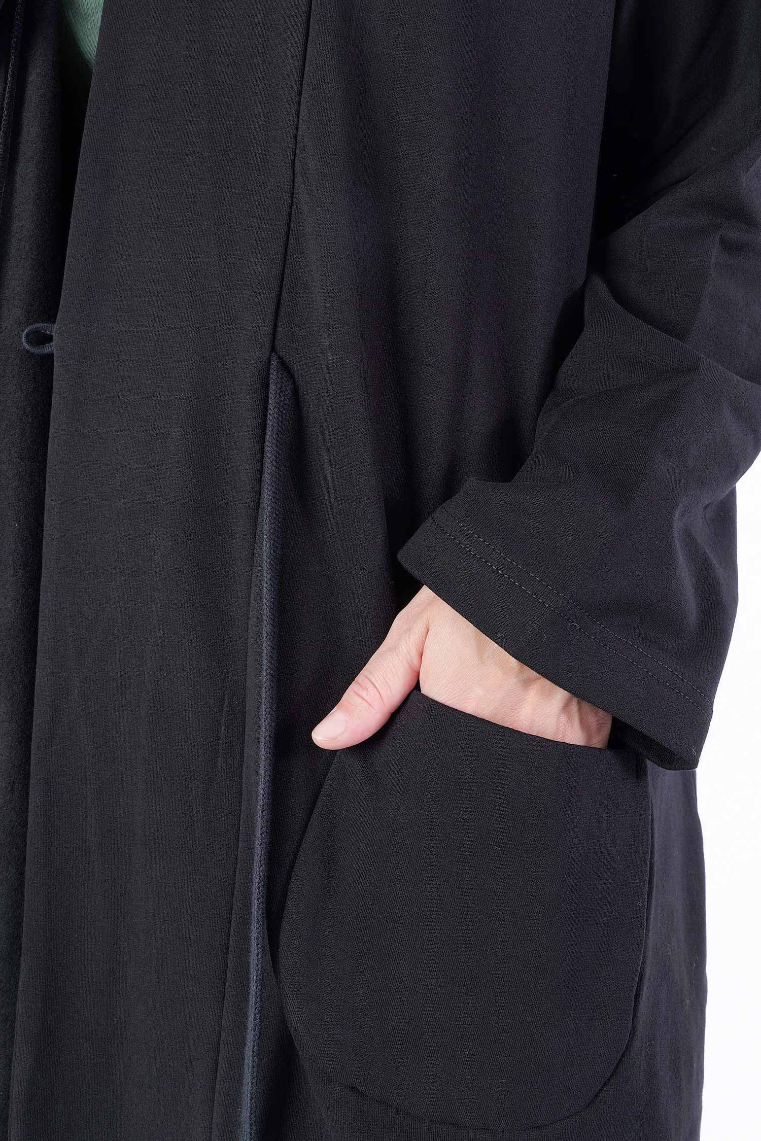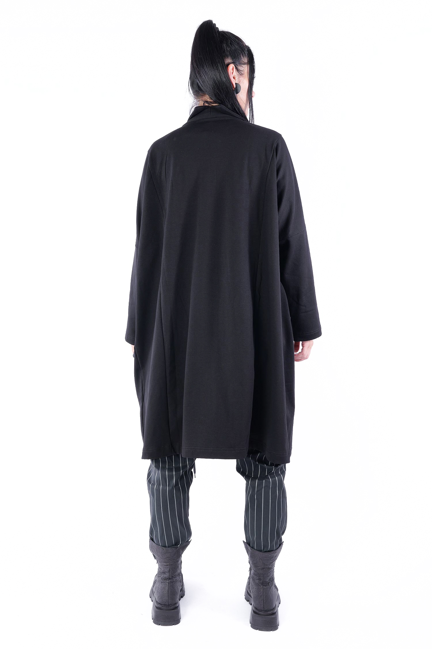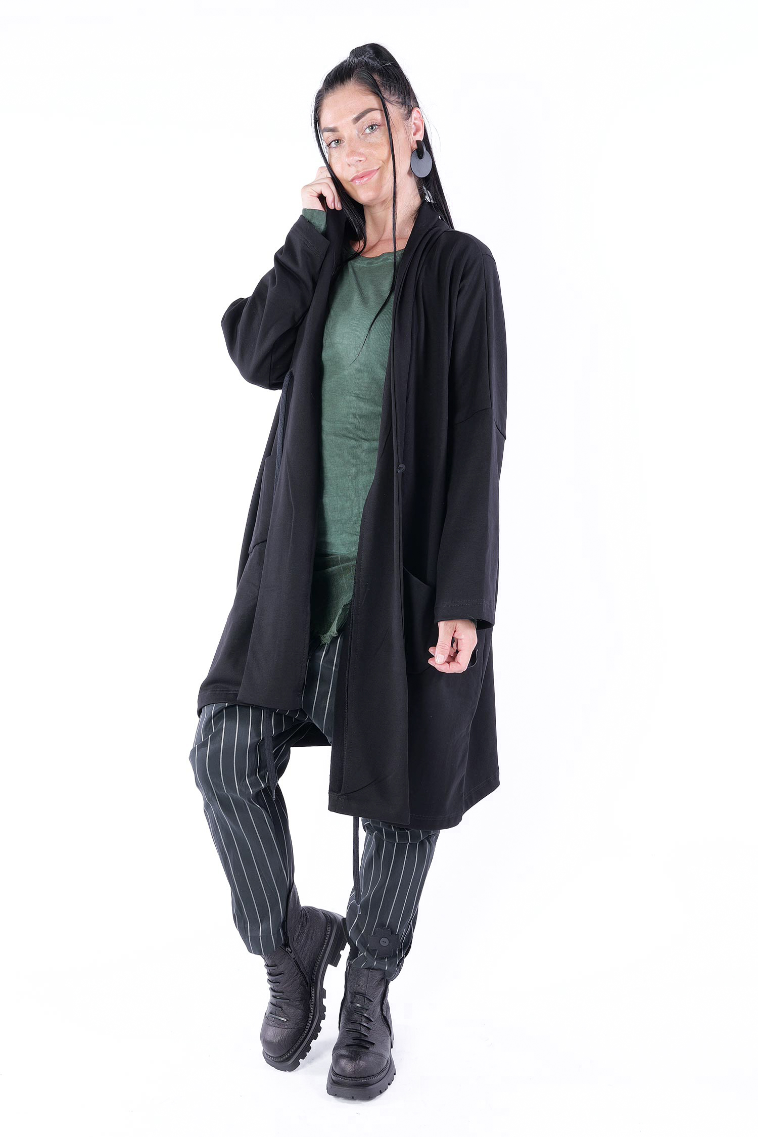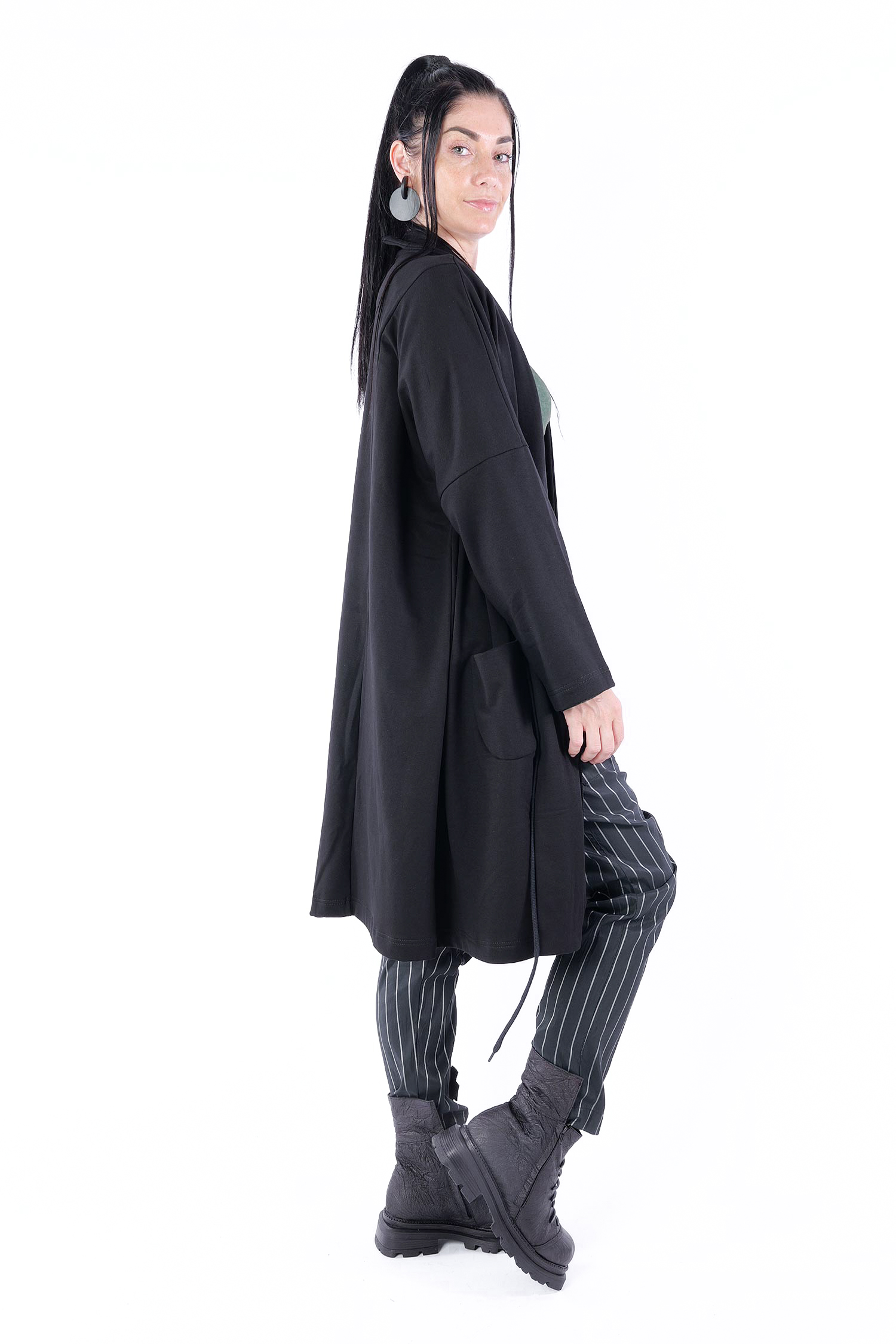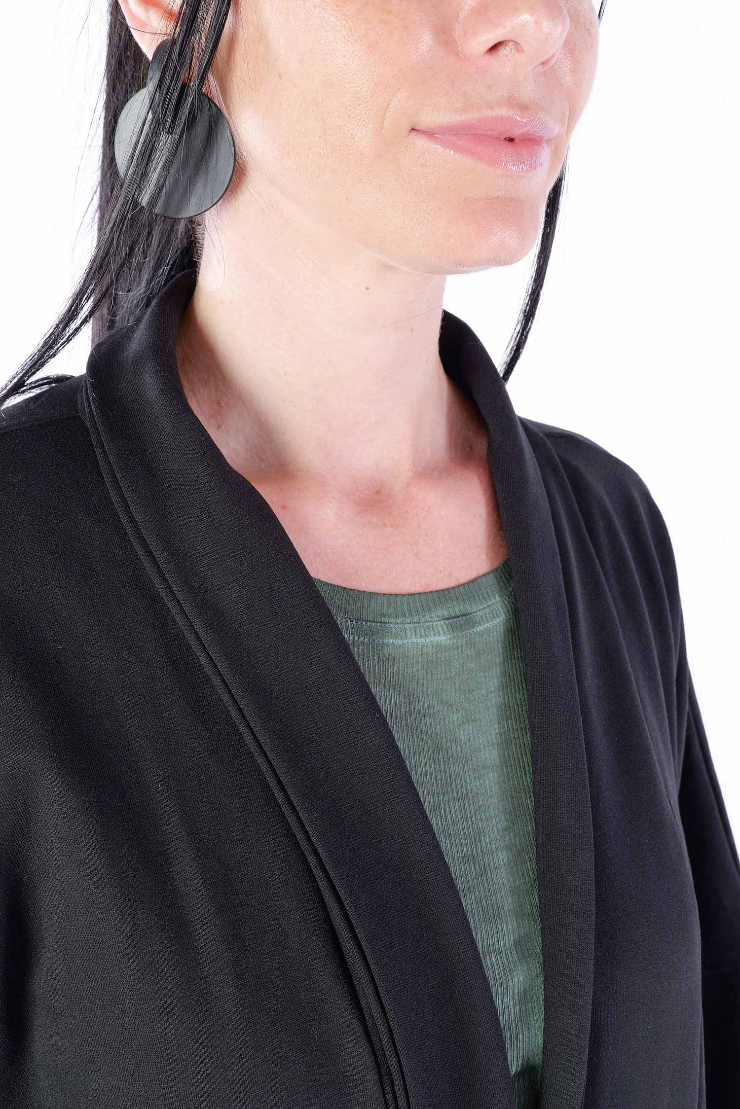 Details: - Thicker sweat material - Band to tie - Button with loop - Shawl collar with cut at the back - Extended shoulder - Long sleeves - Attached pockets at the front - Loose and square cut